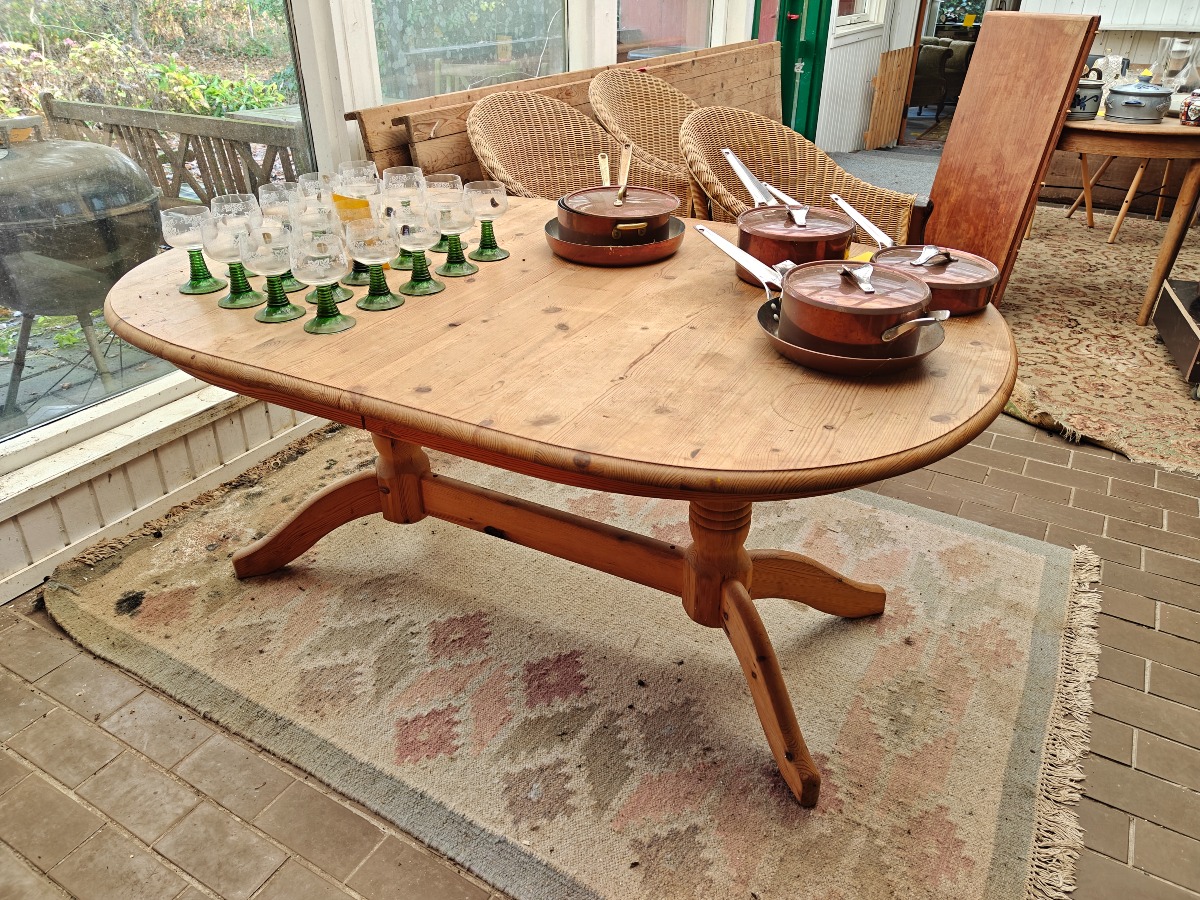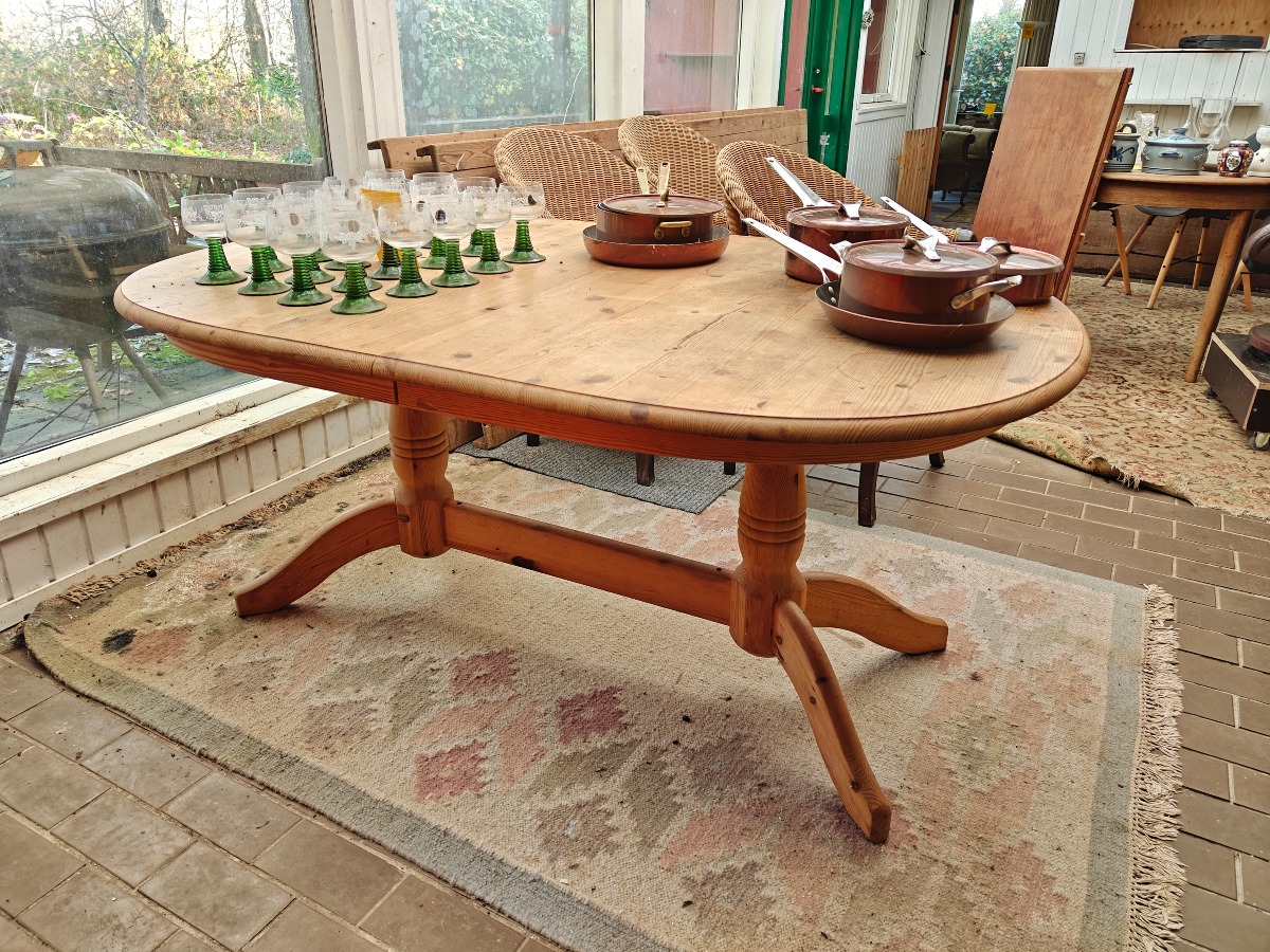Ovalt fyrtræs spisebord. H. 72 B. 160 D. 106 cm.