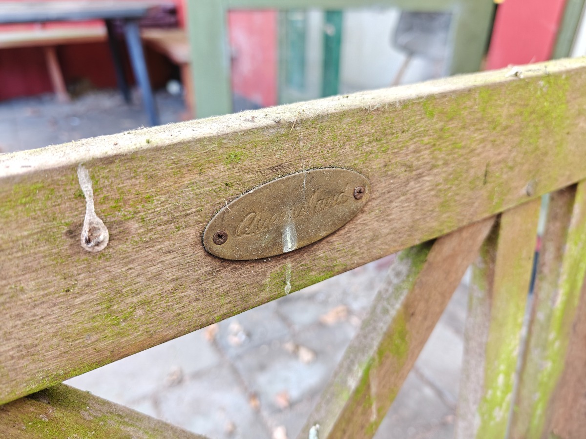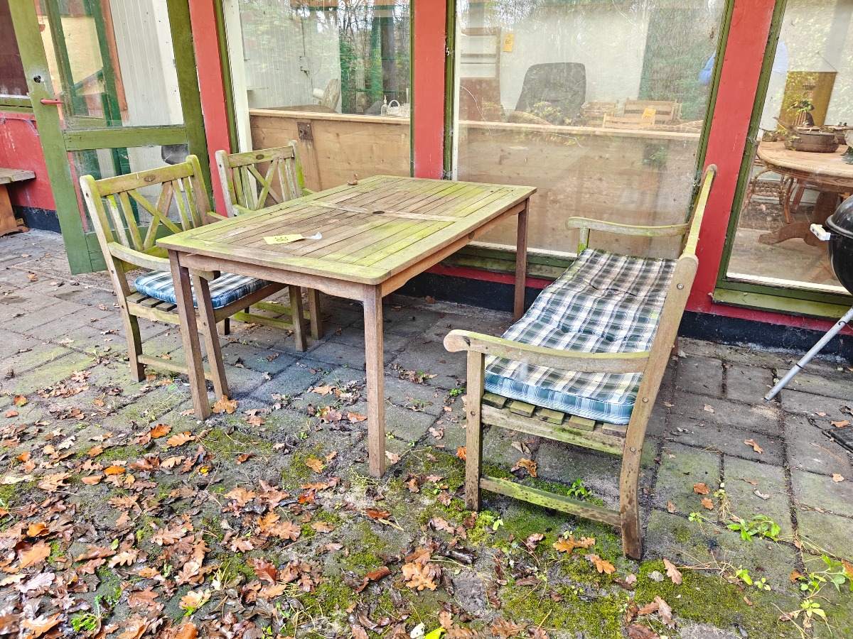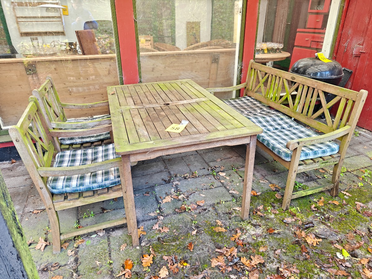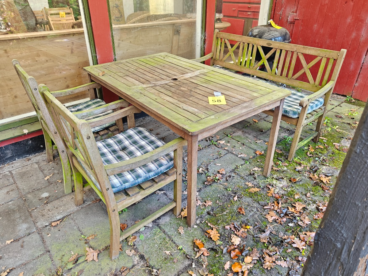 Queensland havemøbelsæt i hårdttræ. God stand, men algebelagt.