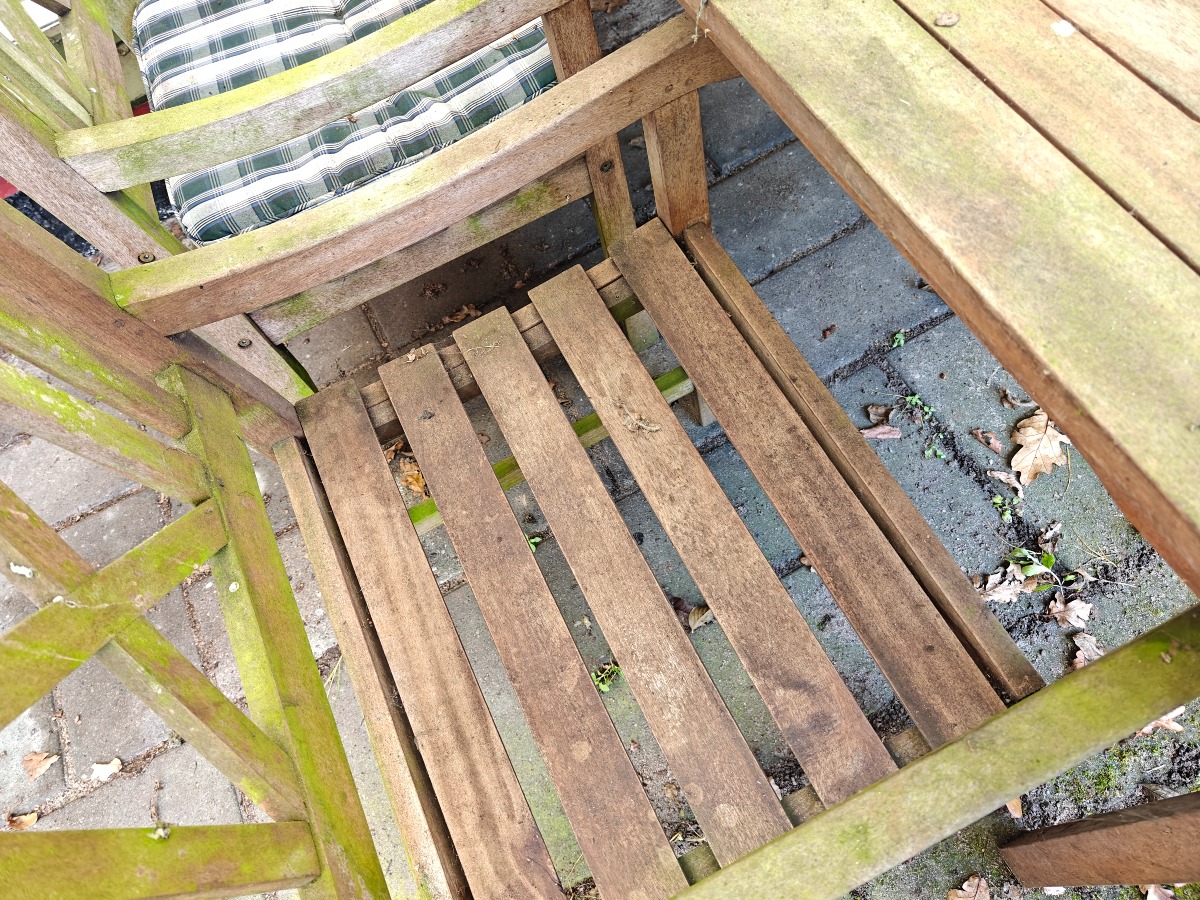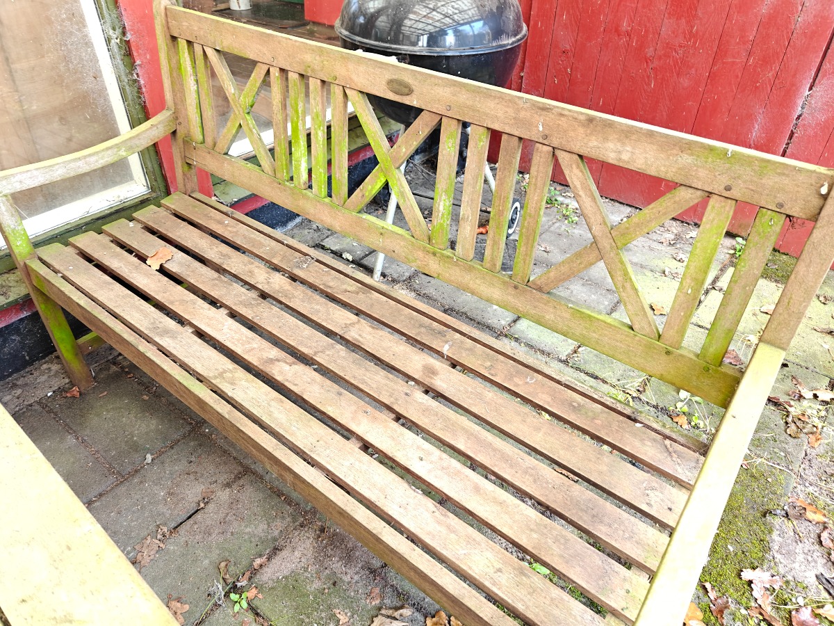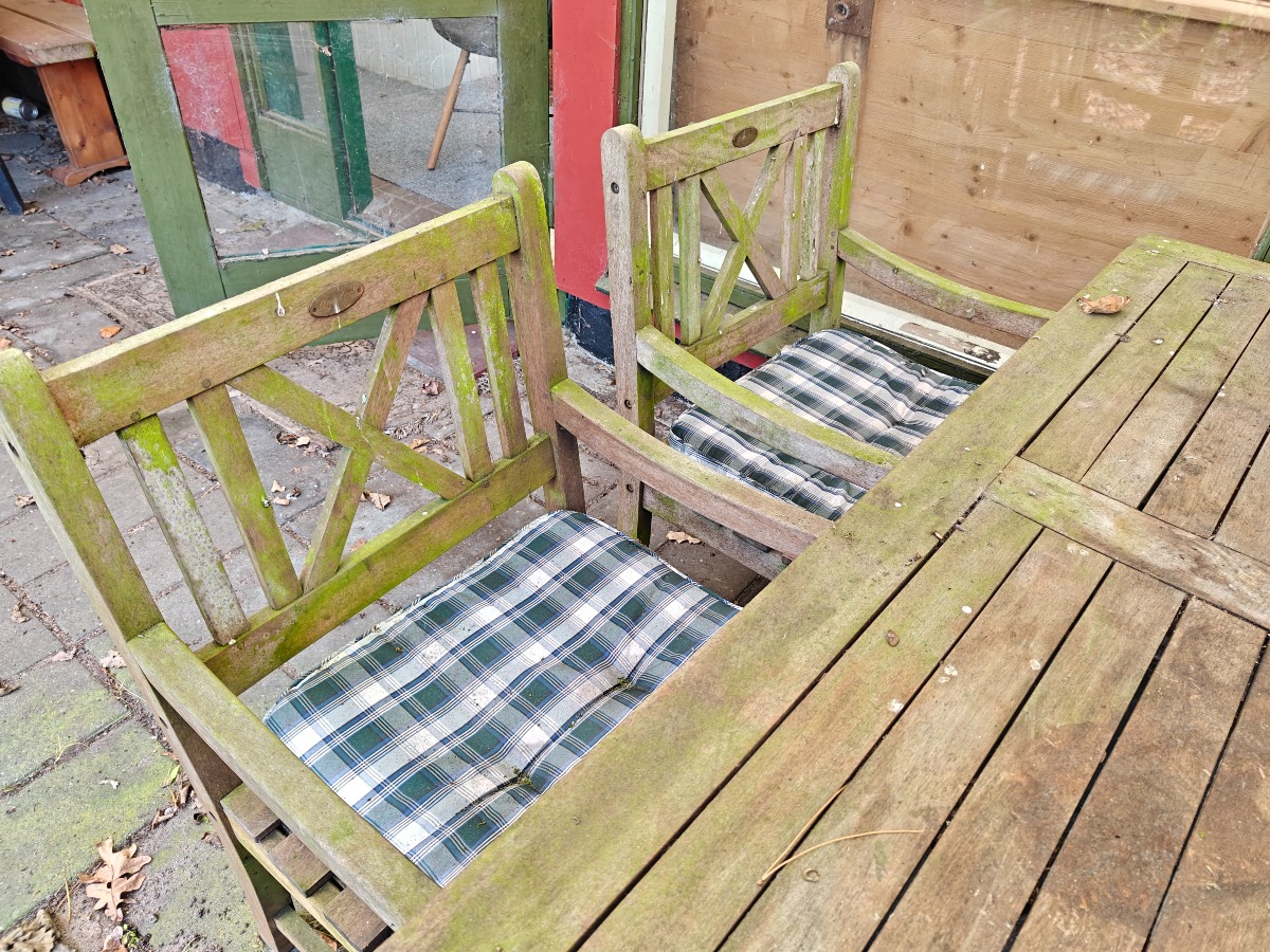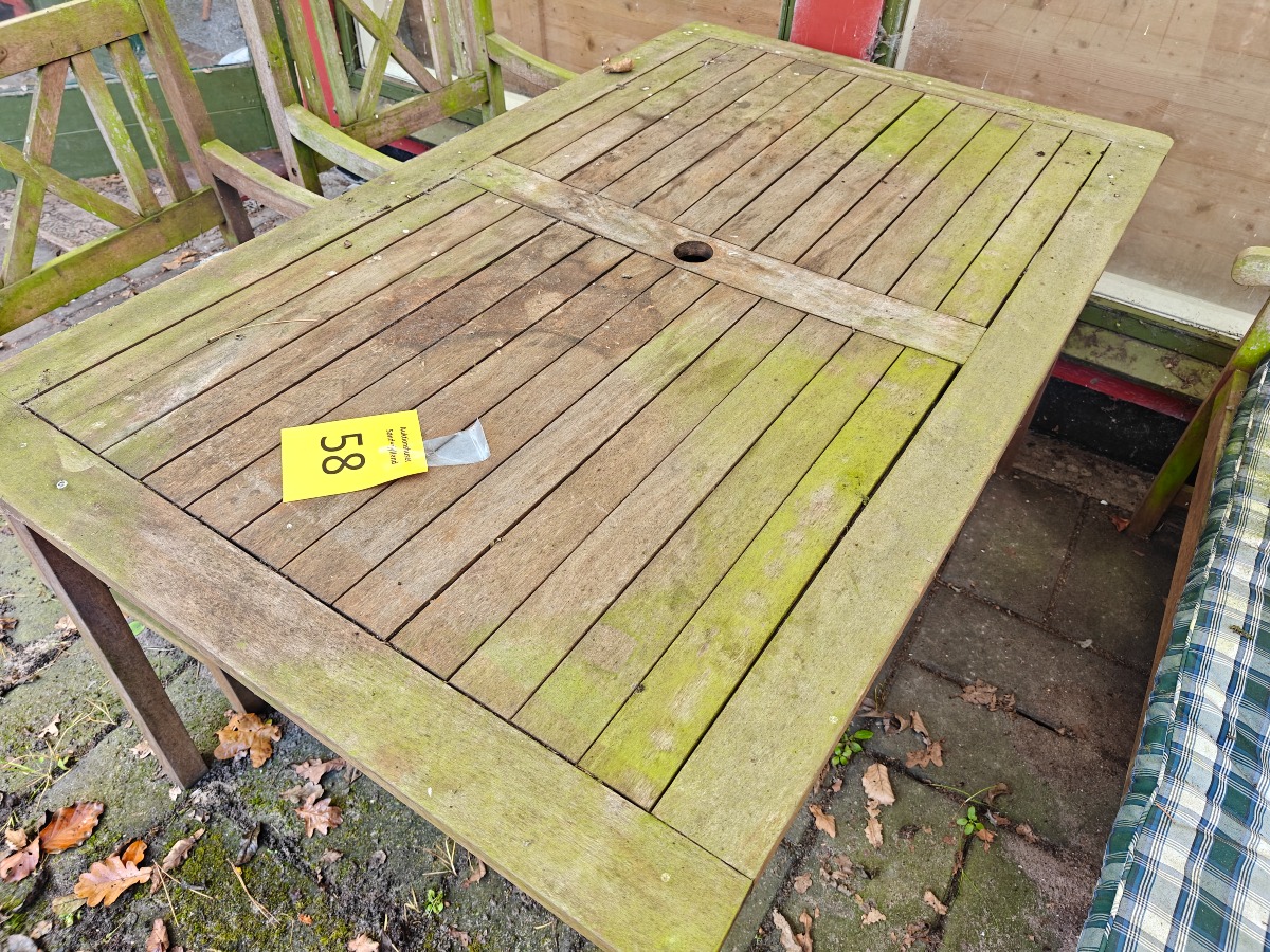 Queensland havemøbelsæt i hårdttræ. God stand, men algebelagt.