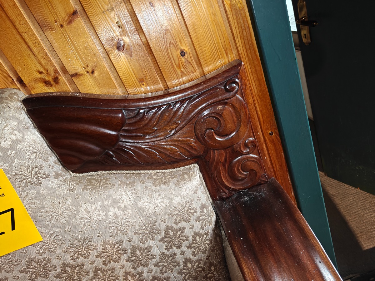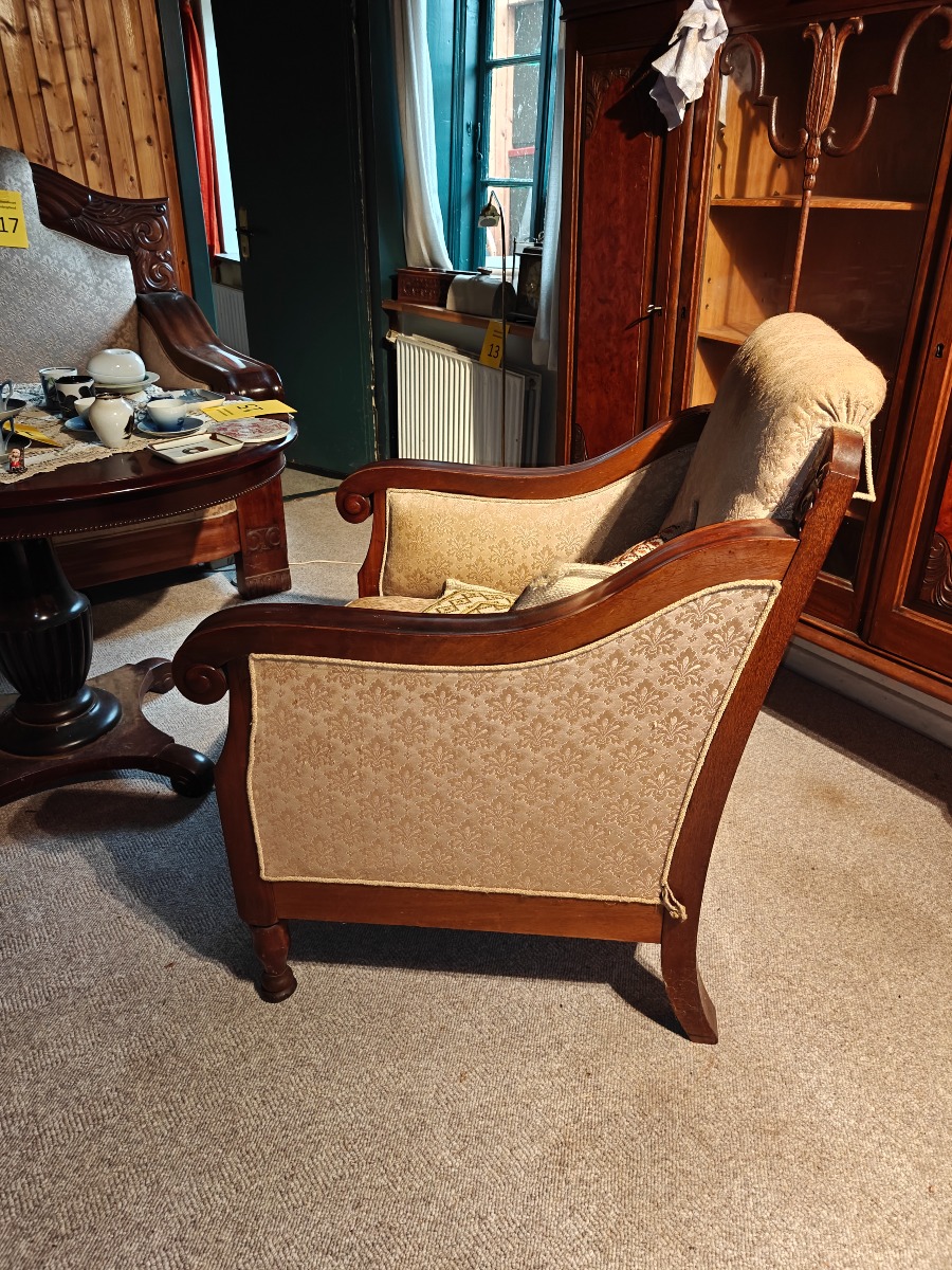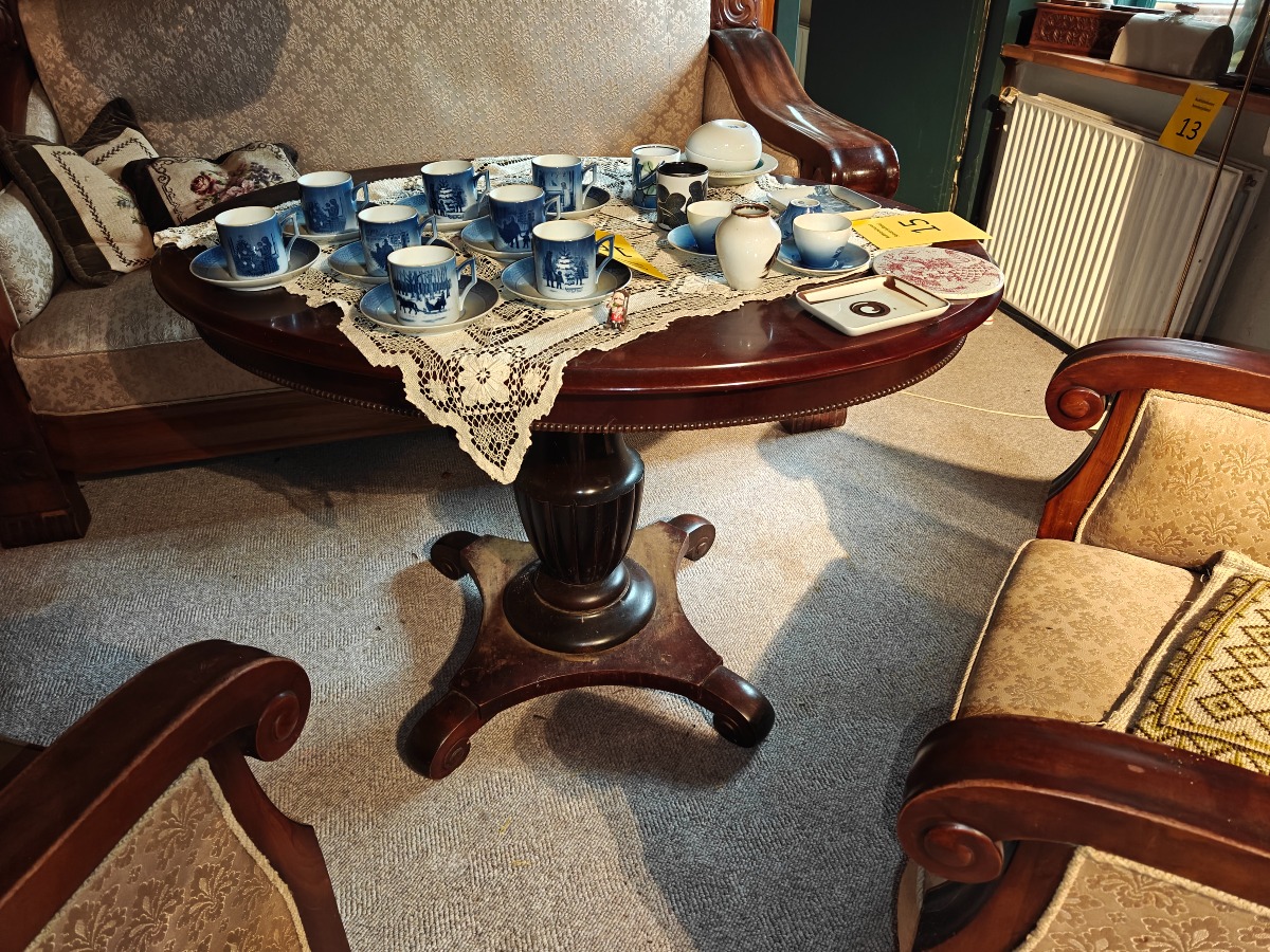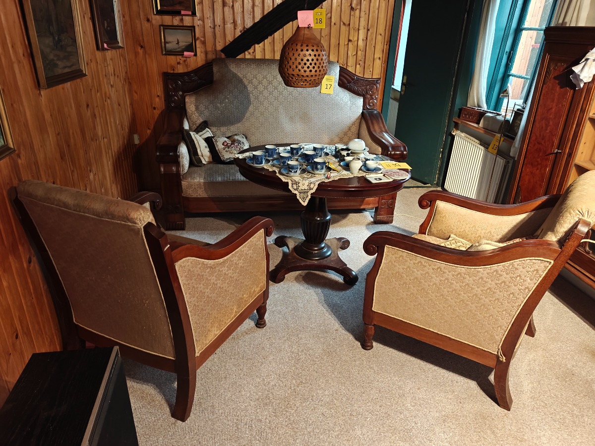 Salonstue af mahogni. Sofa, ovalt salonbord samt 2 stole. Fremstår velholdt. Sofa: H. 130, B. 185 cm.