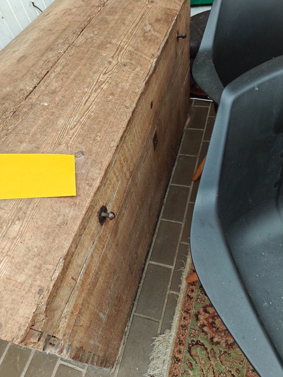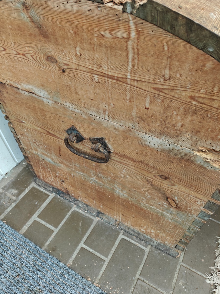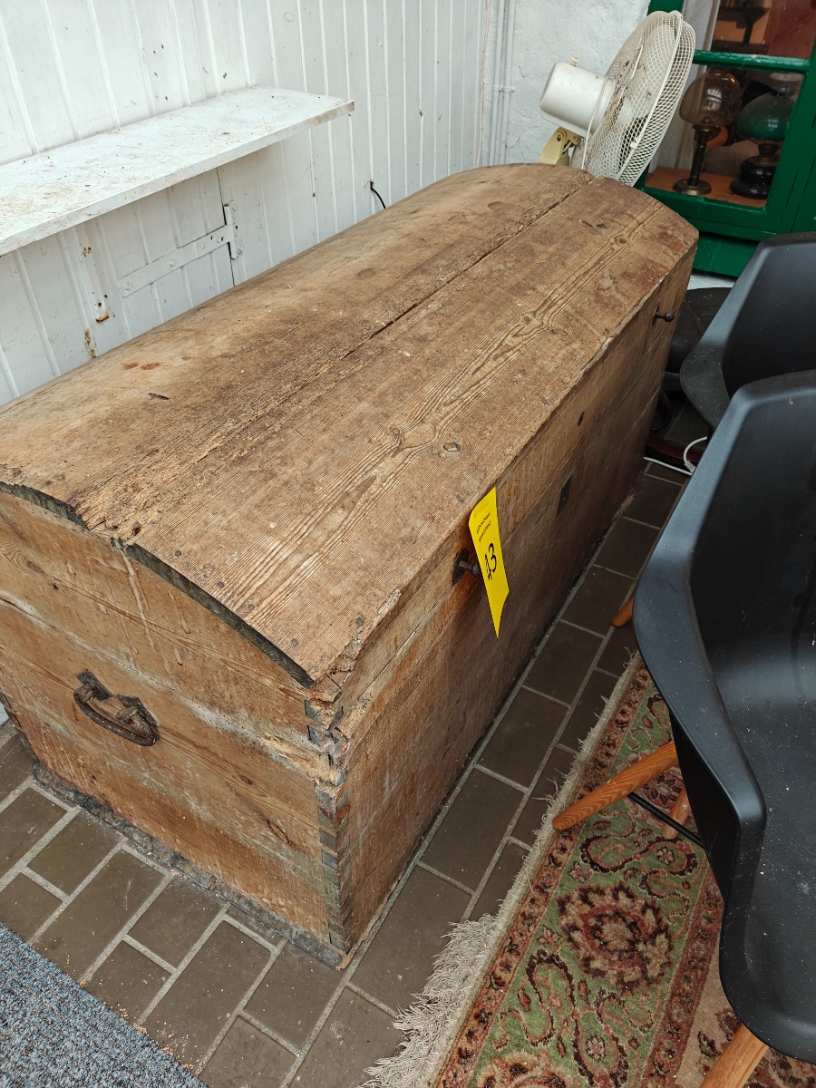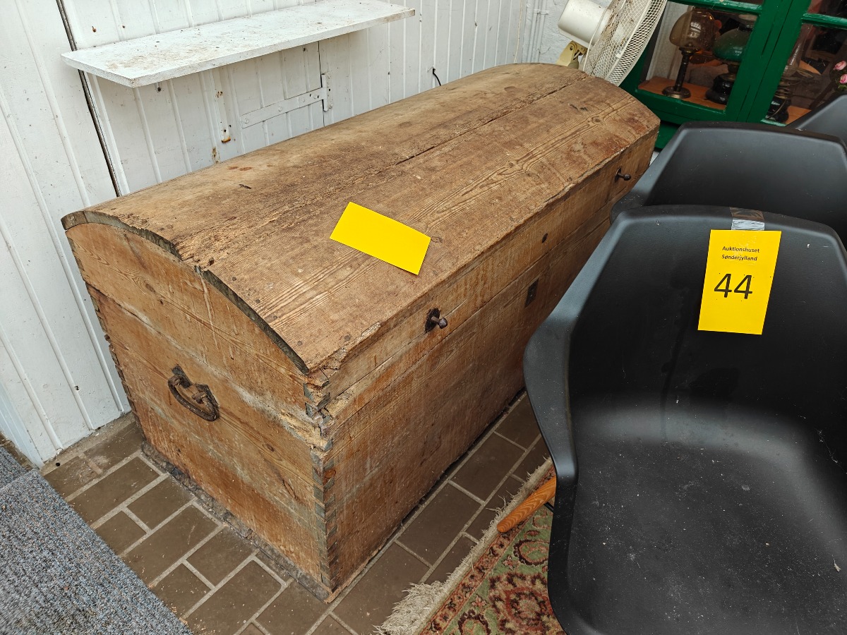 Standkiste af fyr med buet låg. Fremstår alderstynget. H. 72, B. 143, D. 70 cm.
