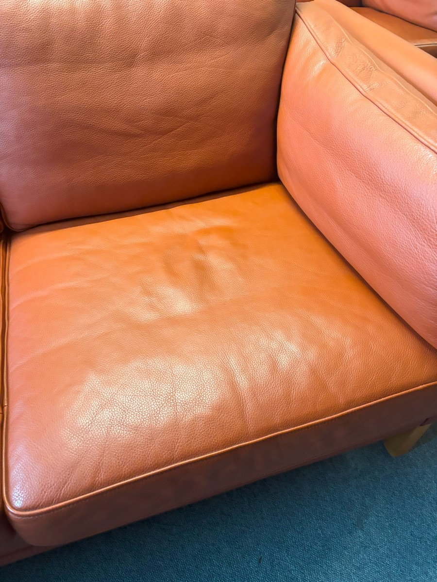 Mogens Hansen 2-personers sofa betrukket med gyldent læder, løse hynder i side, ryg og sæde. H: 67 cm, L: 151 cm, D: 83 cm. SH: 43 cm. Fremstår i pæn stand, med patineret læder og få brugsspor. Fra dødsbo.