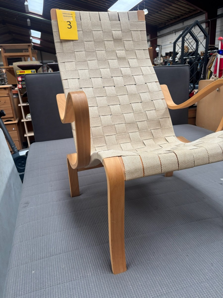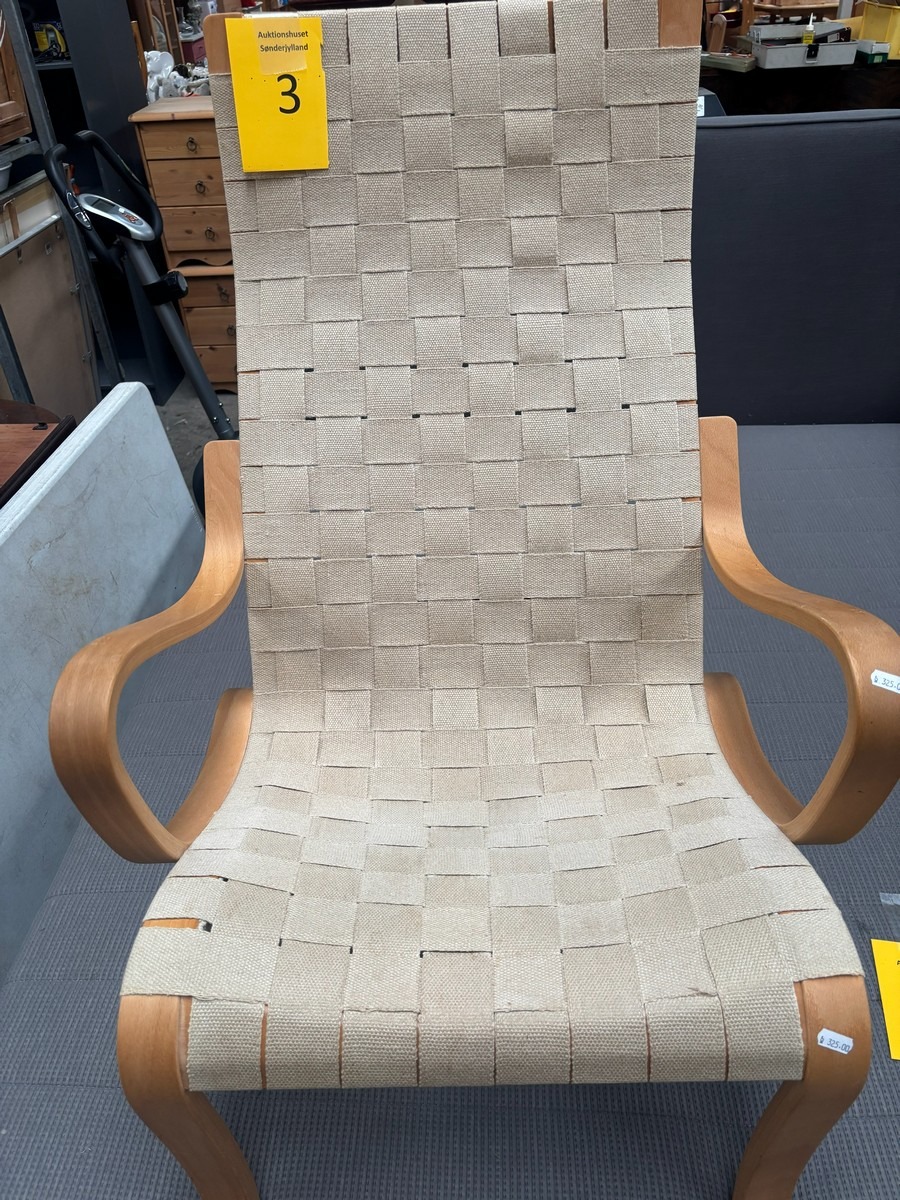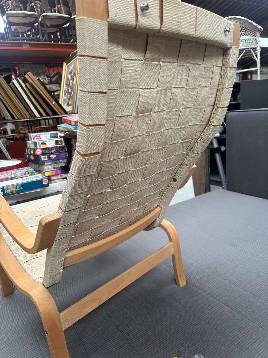 Bruno Mathsson Høj Eva Lænestol. Med stel af formspændt bøg, udspændt med lærredsgjorde. Nakkehynde mangler.