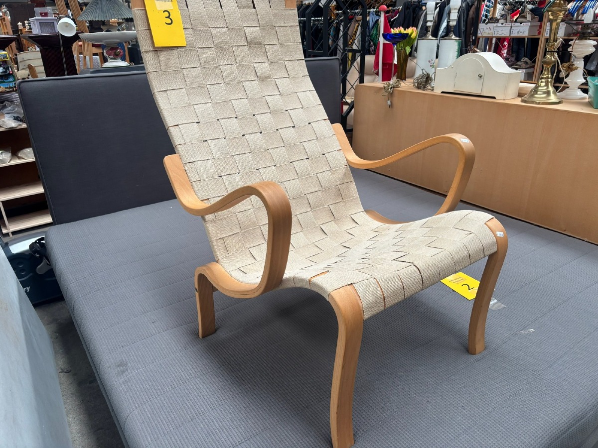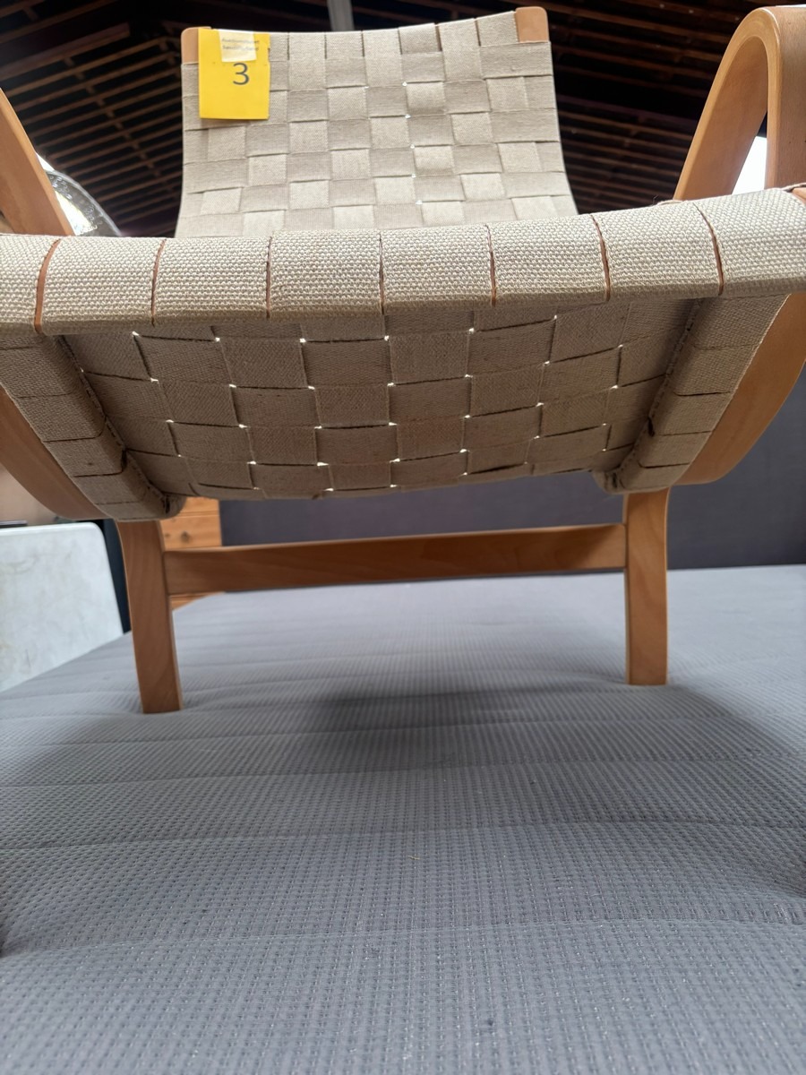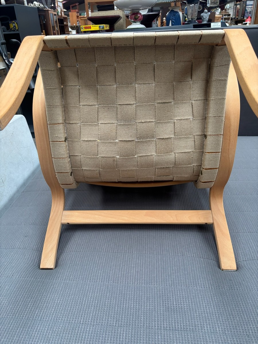 Bruno Mathsson Høj Eva Lænestol. Med stel af formspændt bøg, udspændt med lærredsgjorde. Nakkehynde mangler.