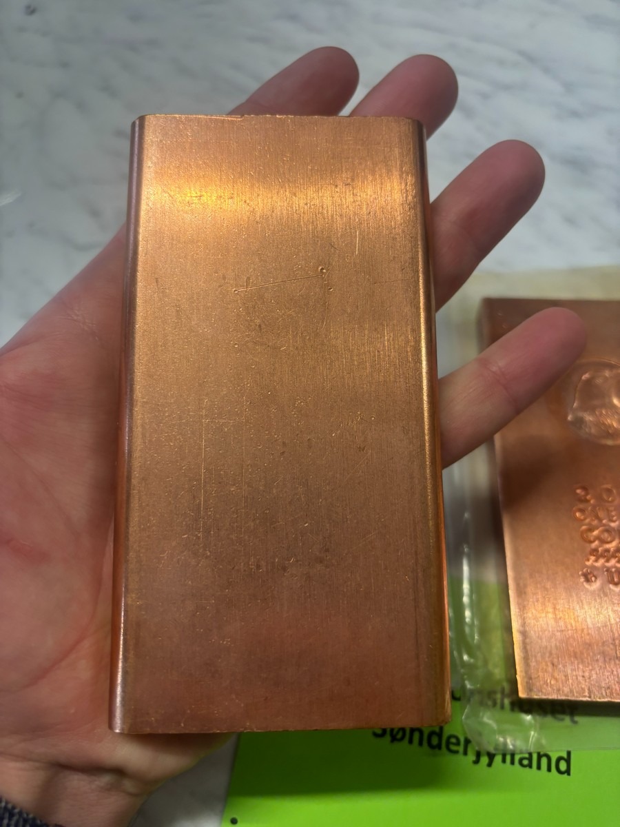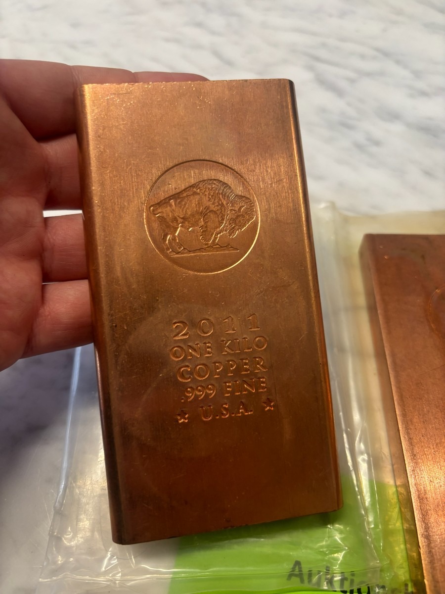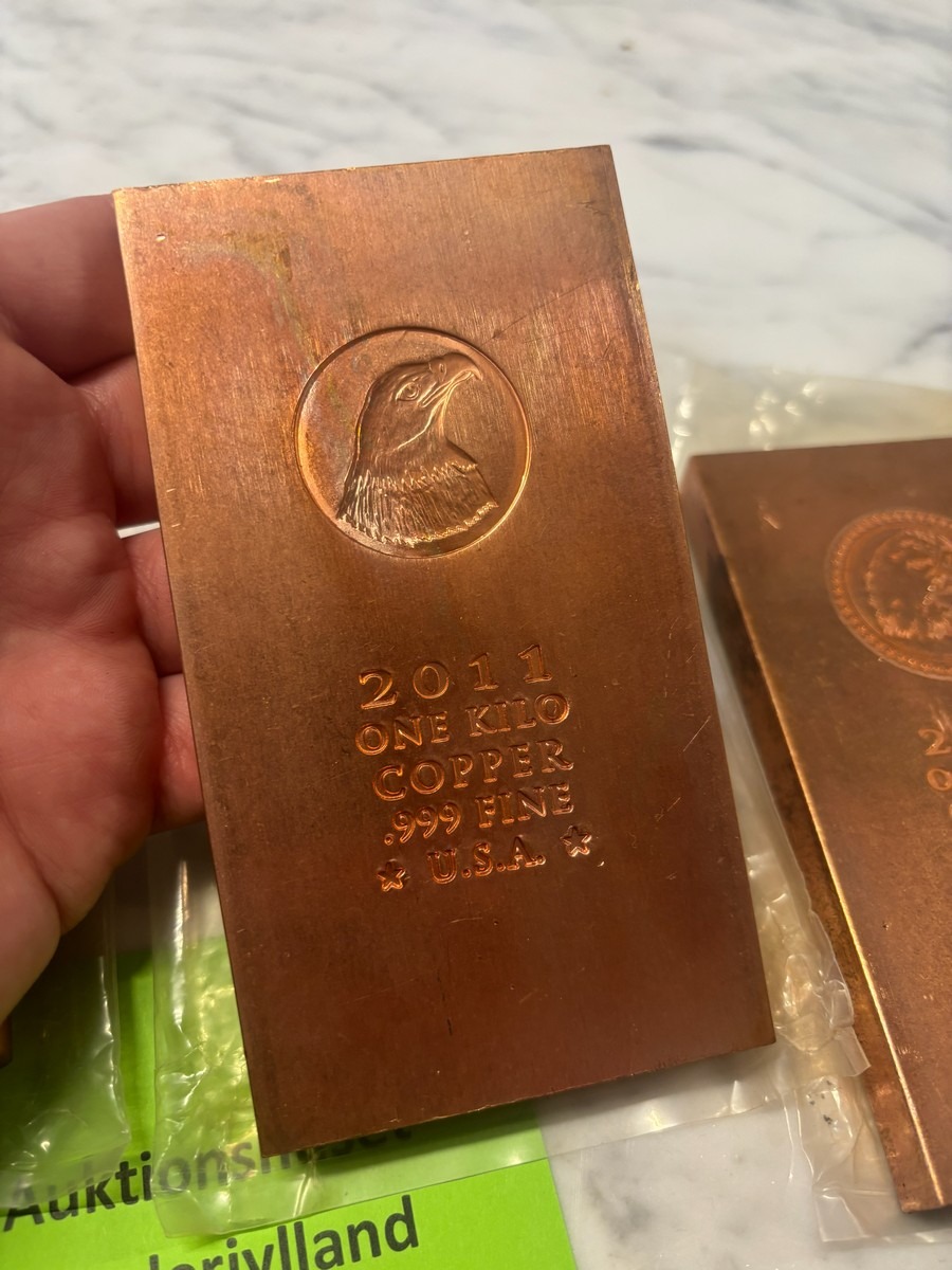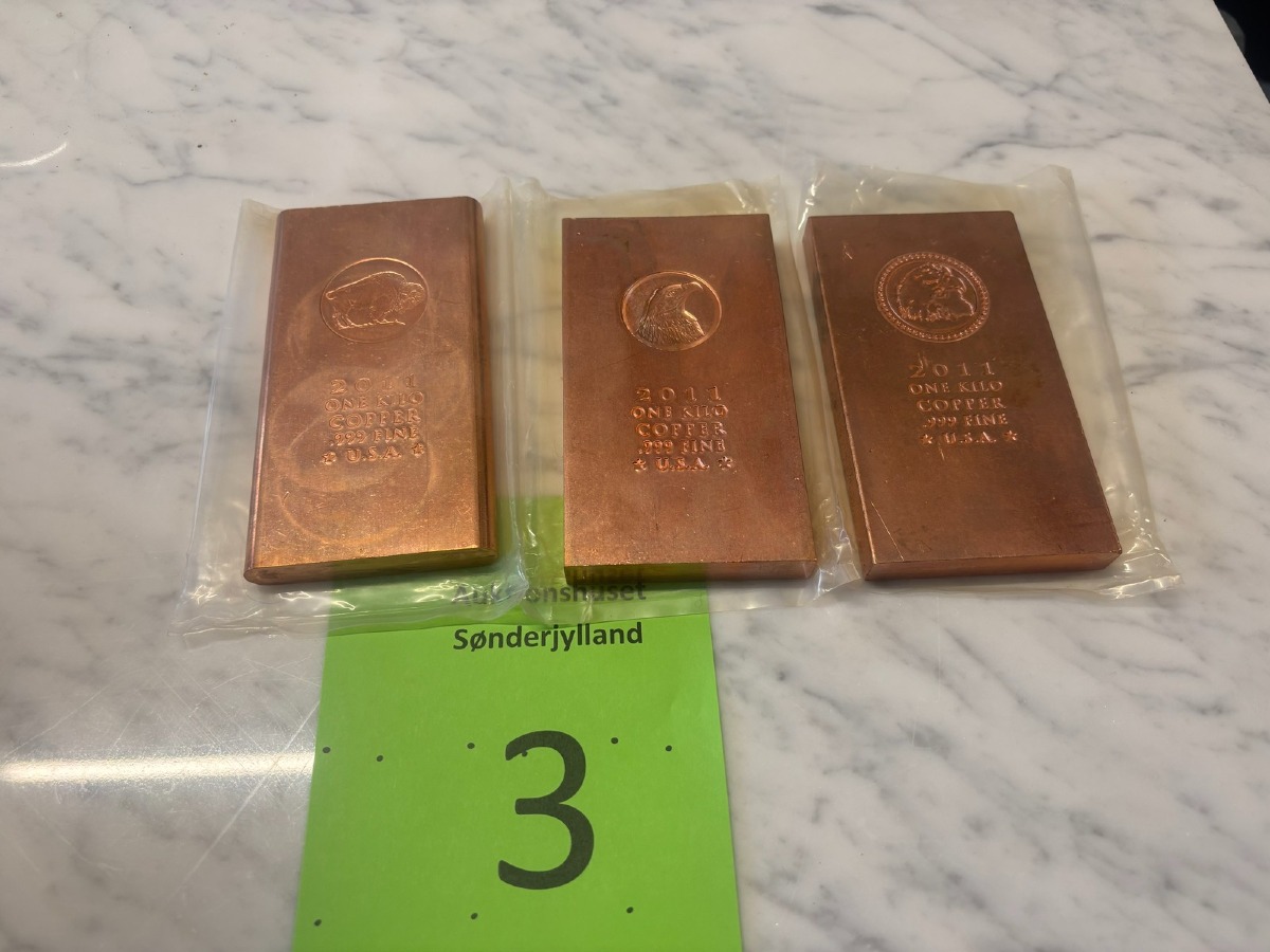 3 stk. one kilo fine 999. copper. Fra dødsbo