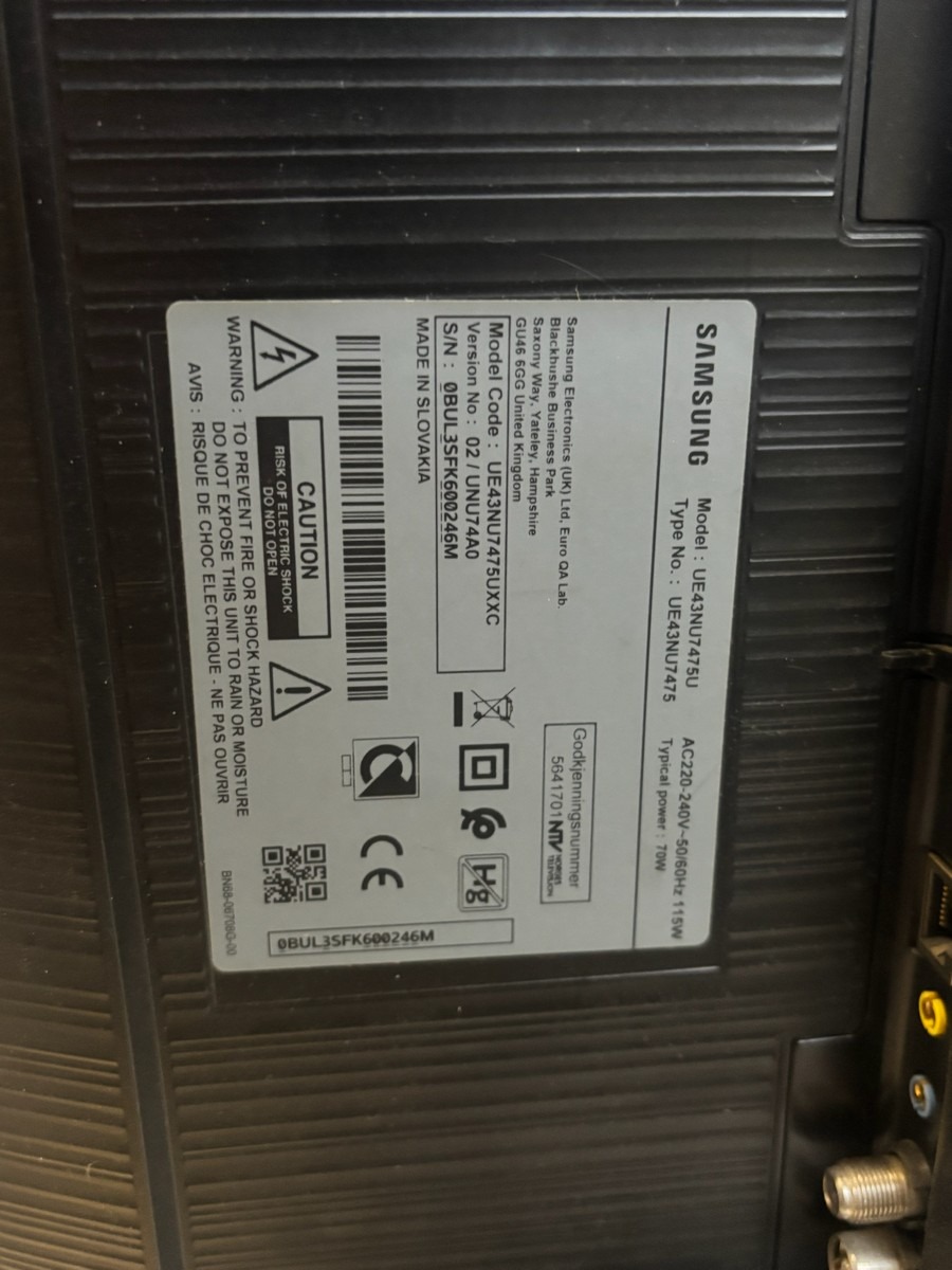 Samsung 43 tommer tv, model UE43NU7475U. Med strømstik og fjernebetjening. Trænger til en rengøring. Ikke testet. Fra dødsbo