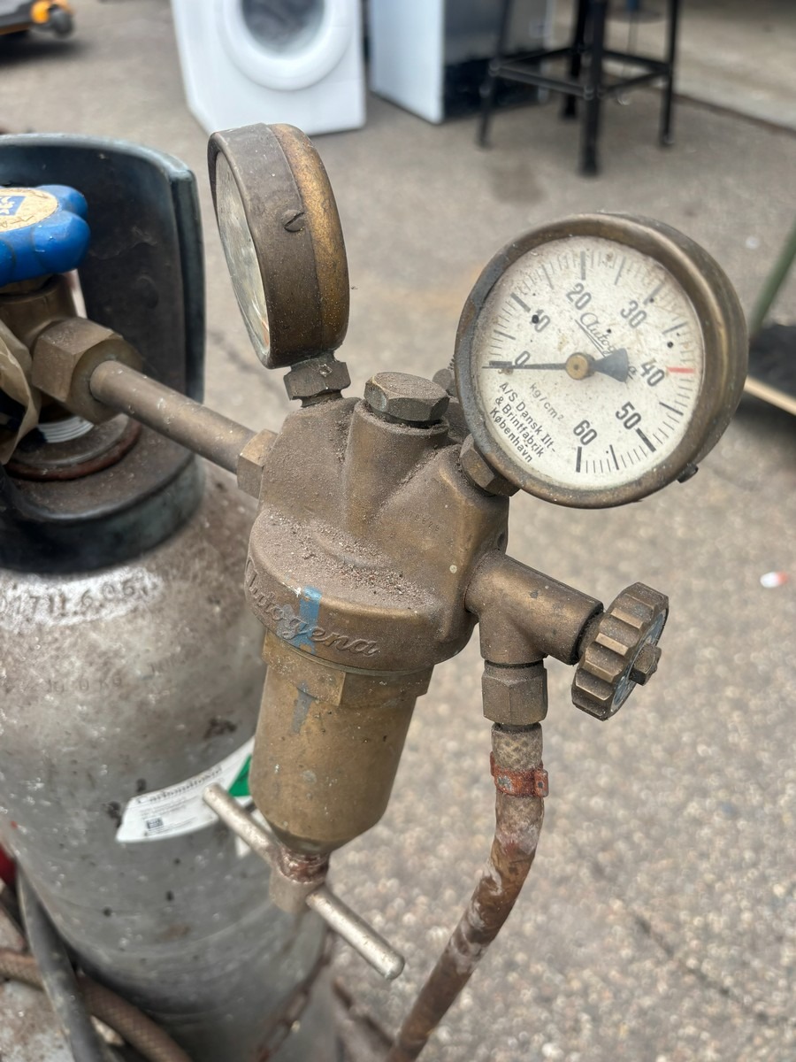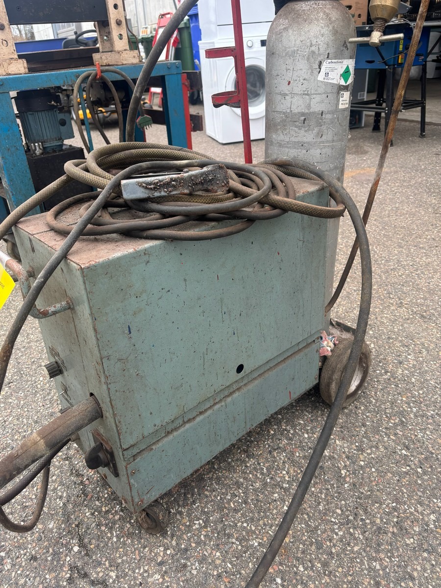 CO2 svejseanlæg på vogn med flaske, slanger og brænder. Fremstår brugt. Fra dødsbo.