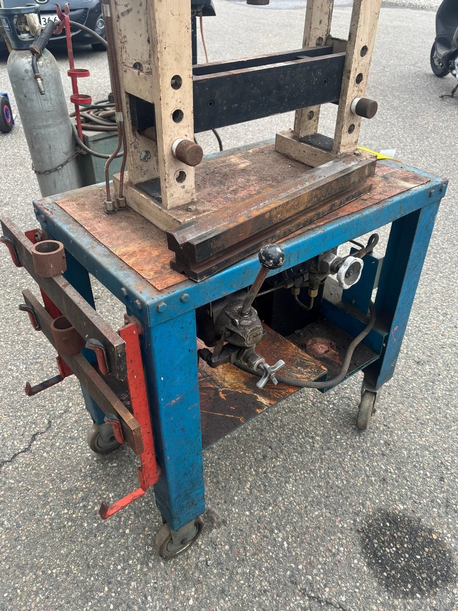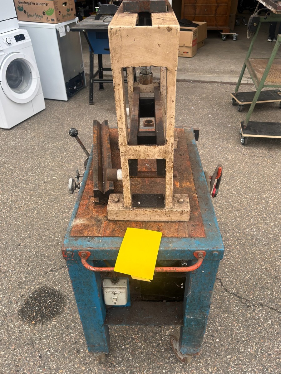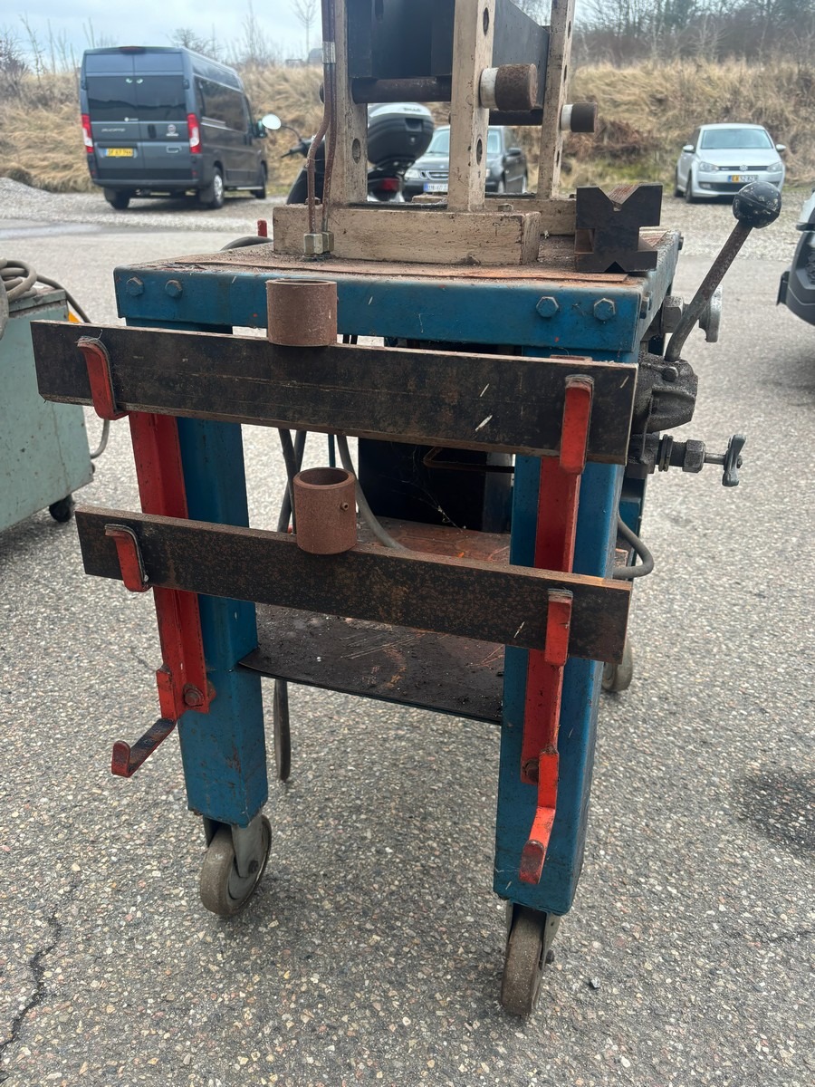 Hydraulisk presse på vogn med manometer og pumpeenhed. Brugt med brugsspor. Fra dødsbo.
