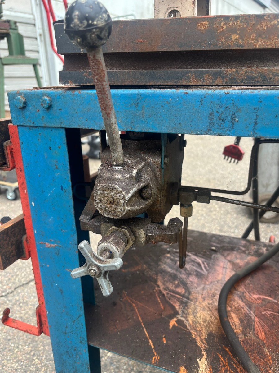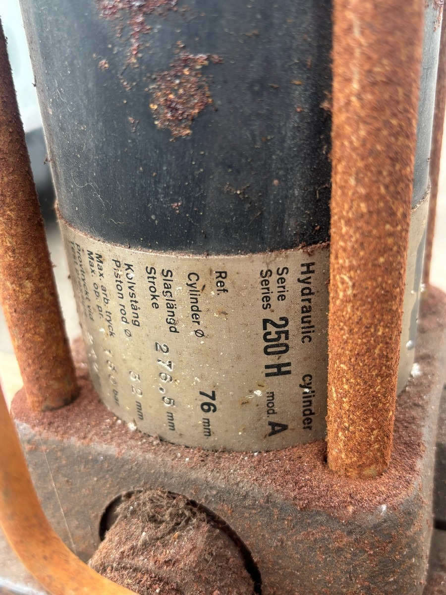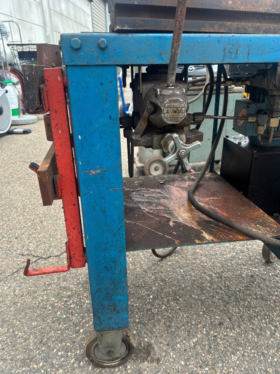 Hydraulisk presse på vogn med manometer og pumpeenhed. Brugt med brugsspor. Fra dødsbo.