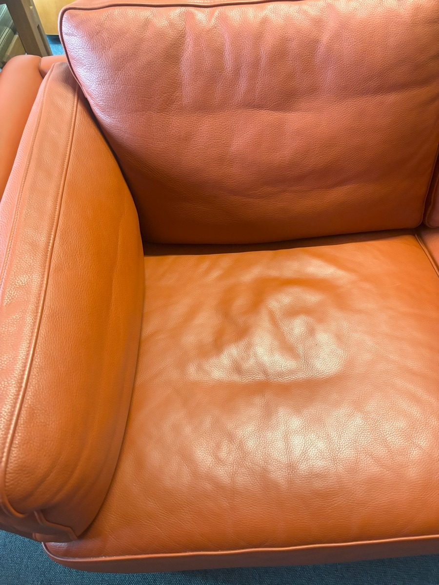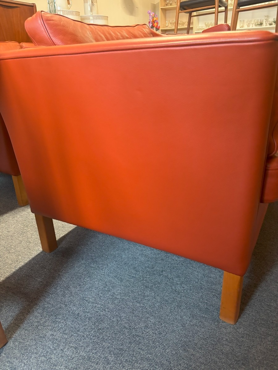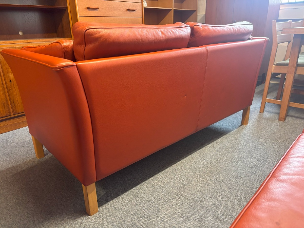 Mogens Hansen 2-personers sofa betrukket med gyldent læder, løse hynder i side, ryg og sæde. H: 67 cm, L: 151 cm, D: 83 cm. SH: 43 cm. Fremstår i pæn stand, med patineret læder og få brugsspor. Obs. Fra rygerhjem. Fra dødsbo.