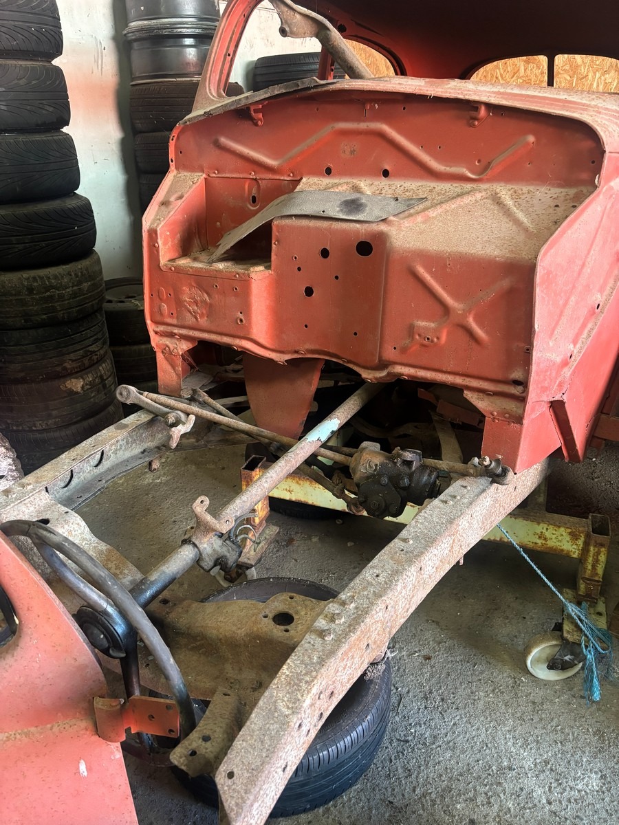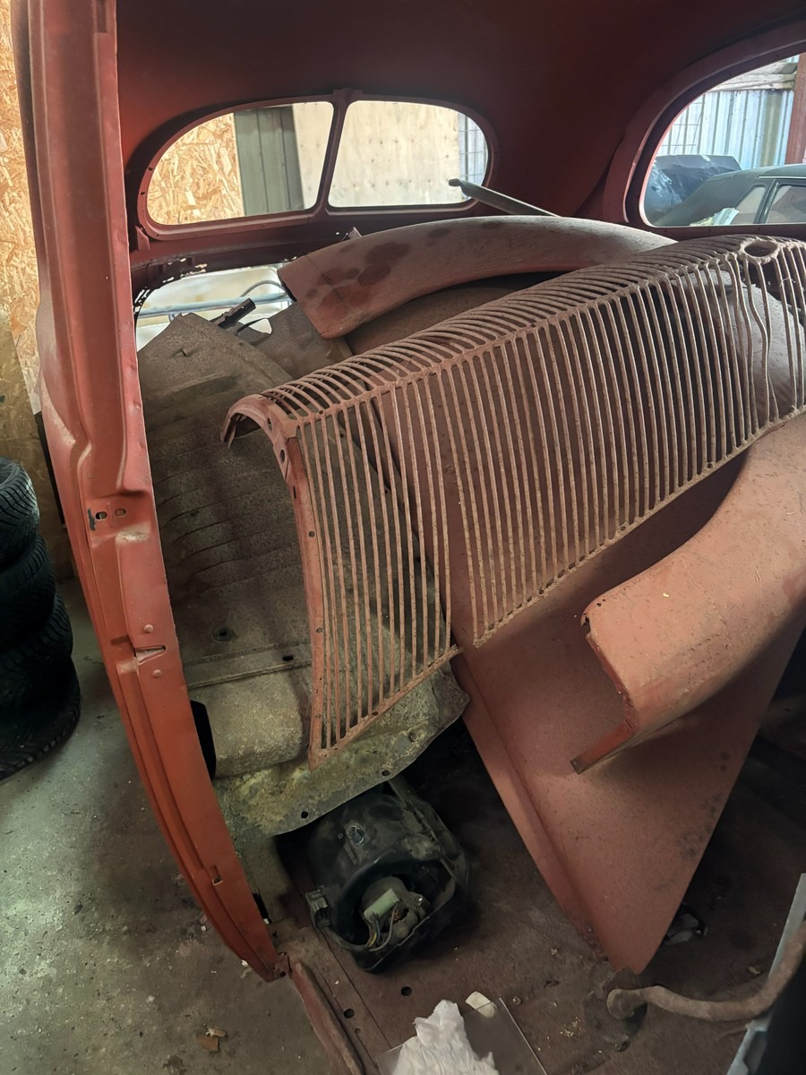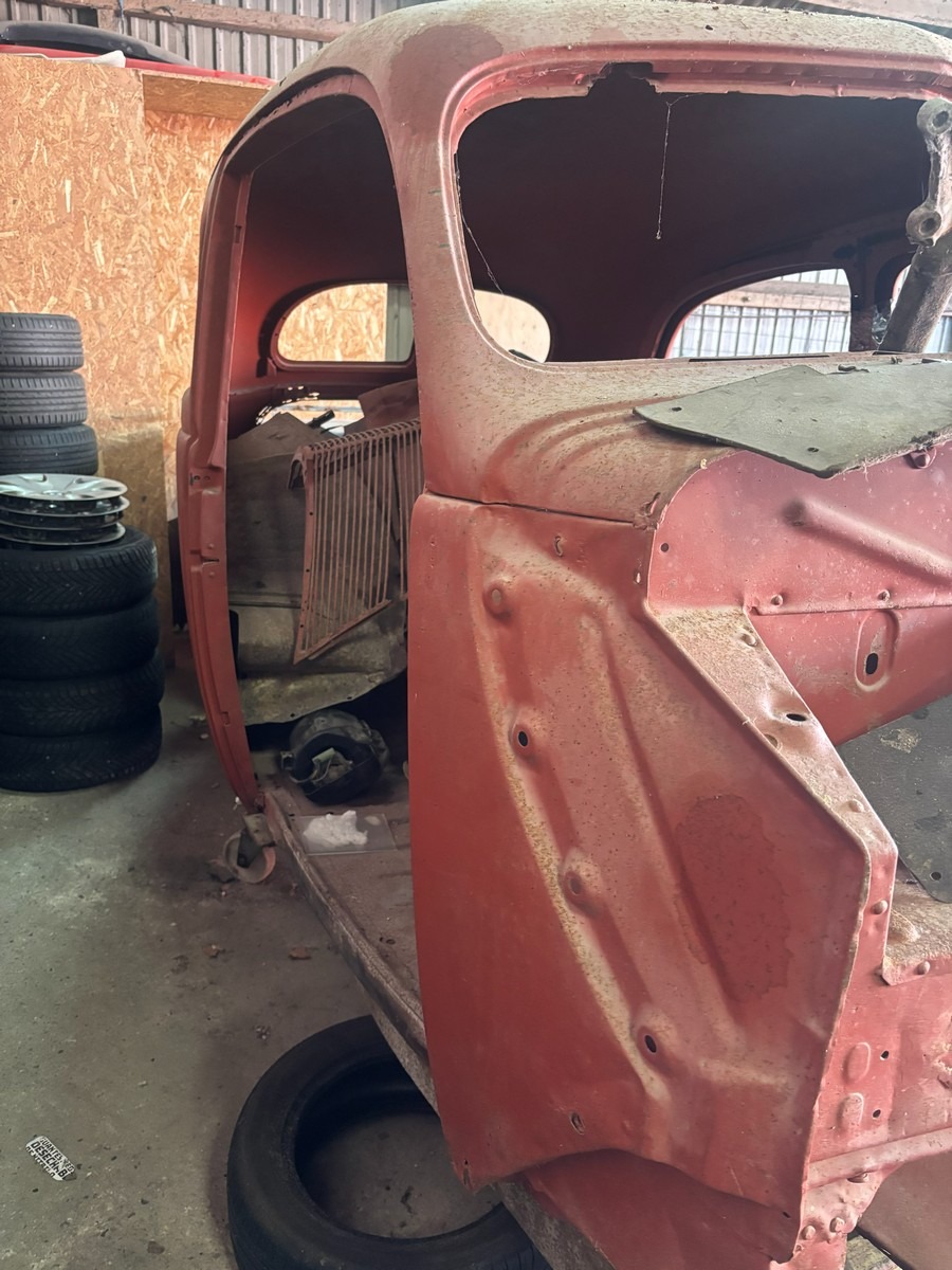Ford Slanteback projekt med diverse dele. Uden papir. Står på rullestativ.