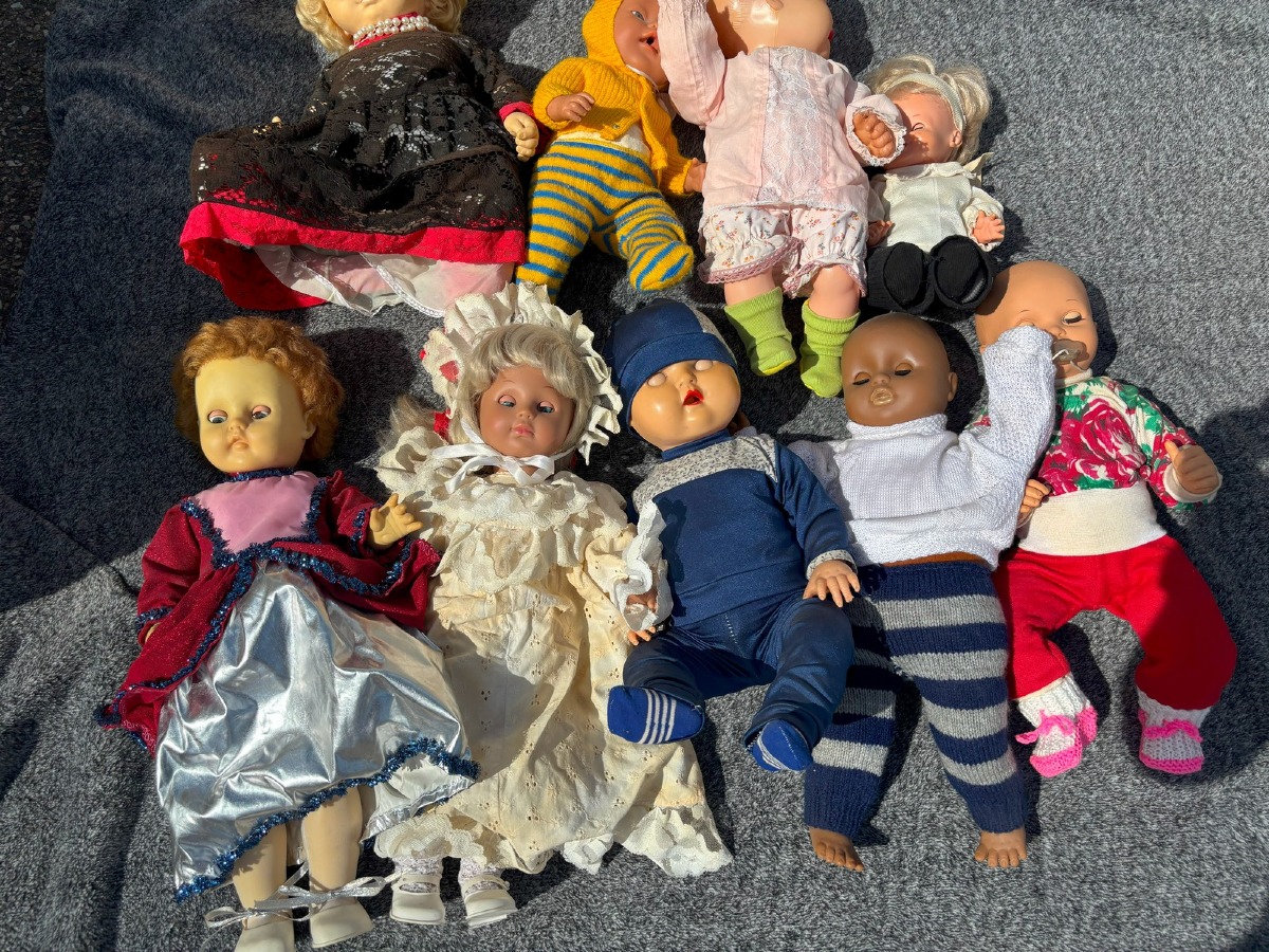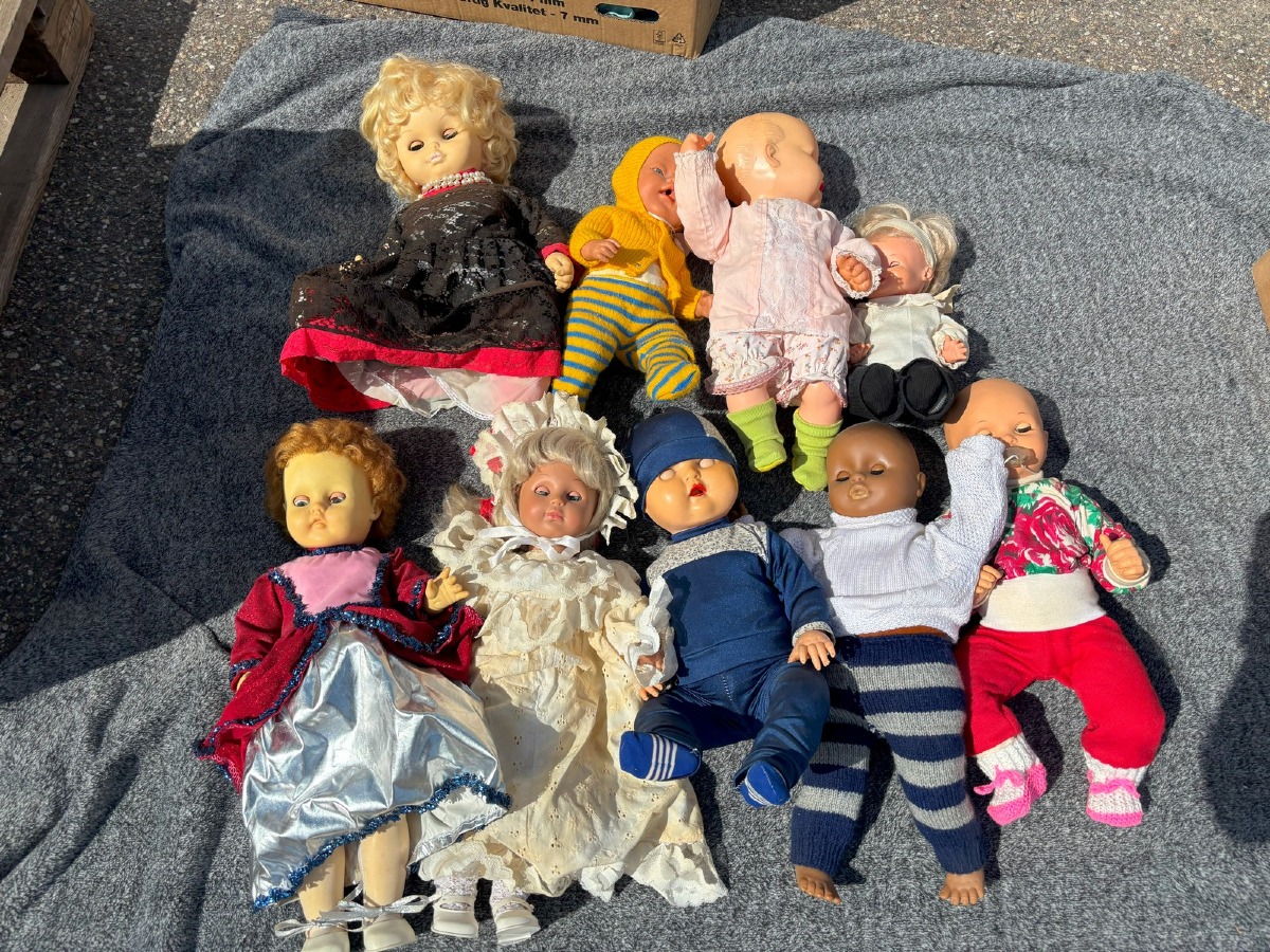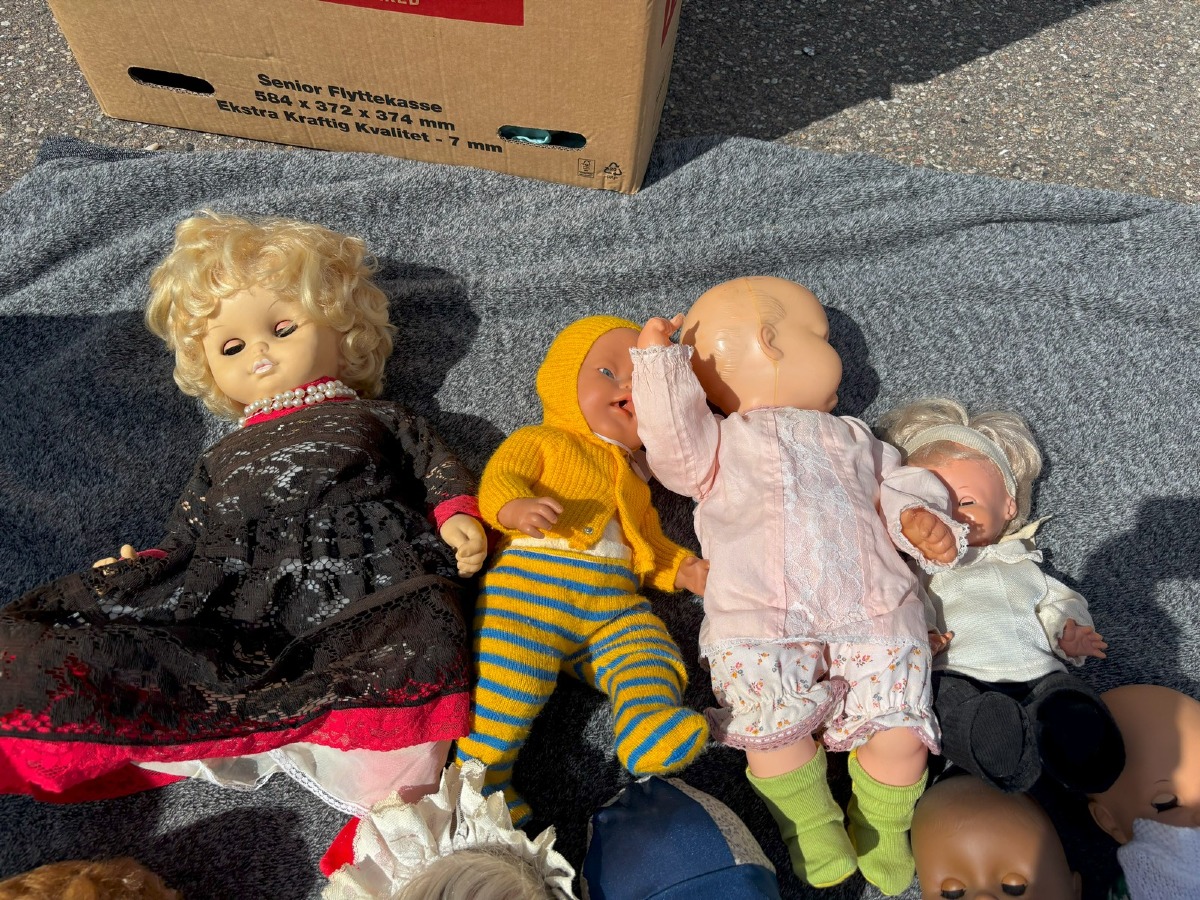 Lille parti dukker. Forskellige slags, str og stand. Ok stand og uden synlig lugt. Lottet står i en flytekasse. Fra en større samling fra et dødsbo.