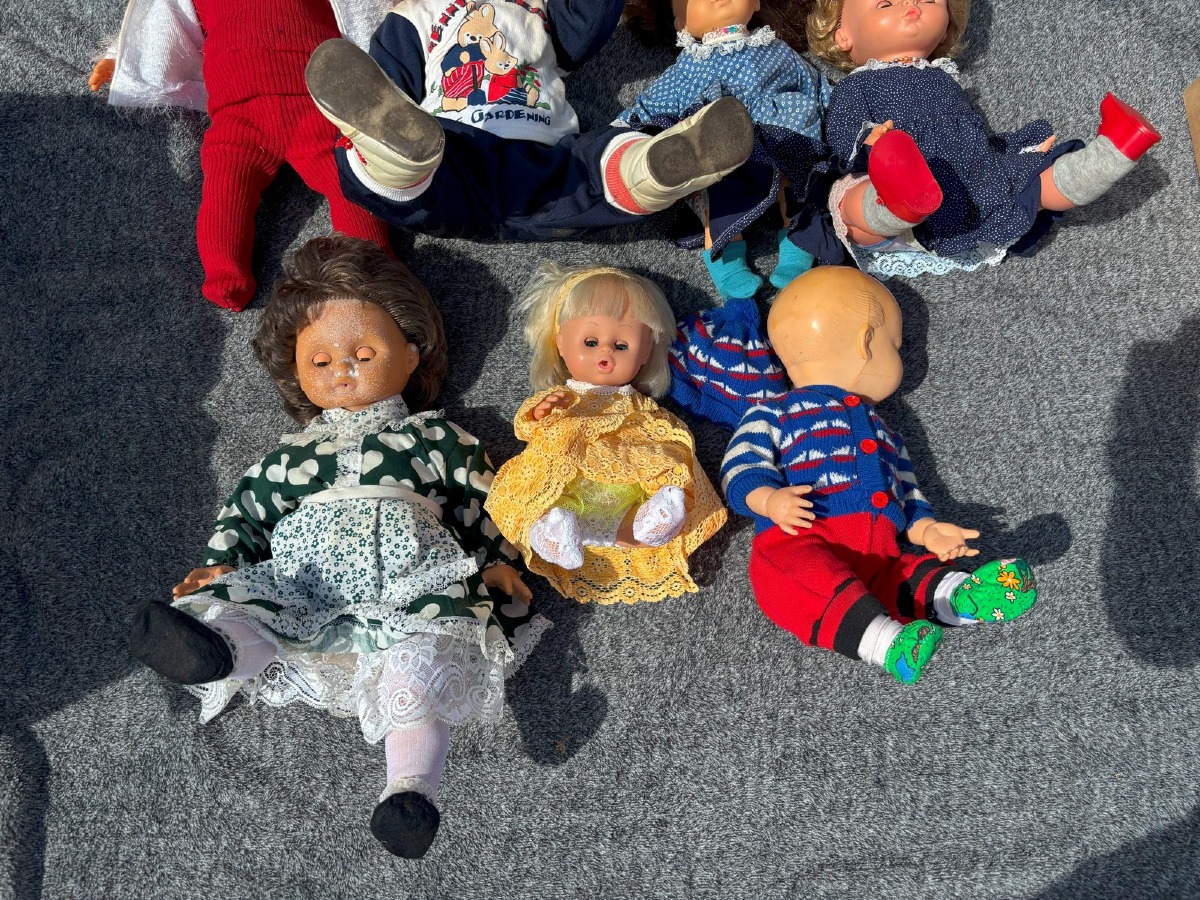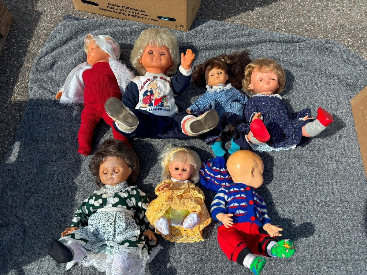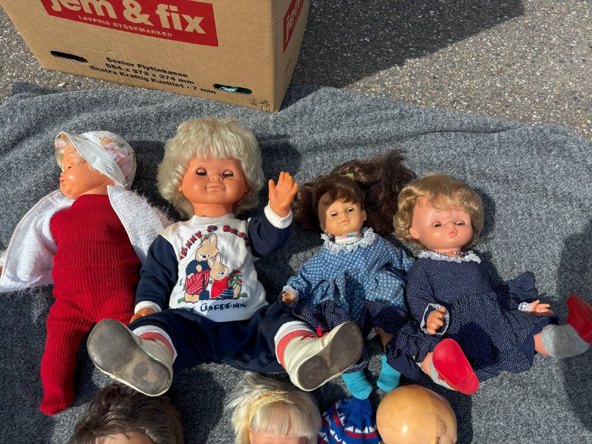 Lille parti dukker. Forskellige slags, str og stand. Ok stand og uden synlig lugt. Lottet står i en flytekasse. Fra en større samling fra et dødsbo.