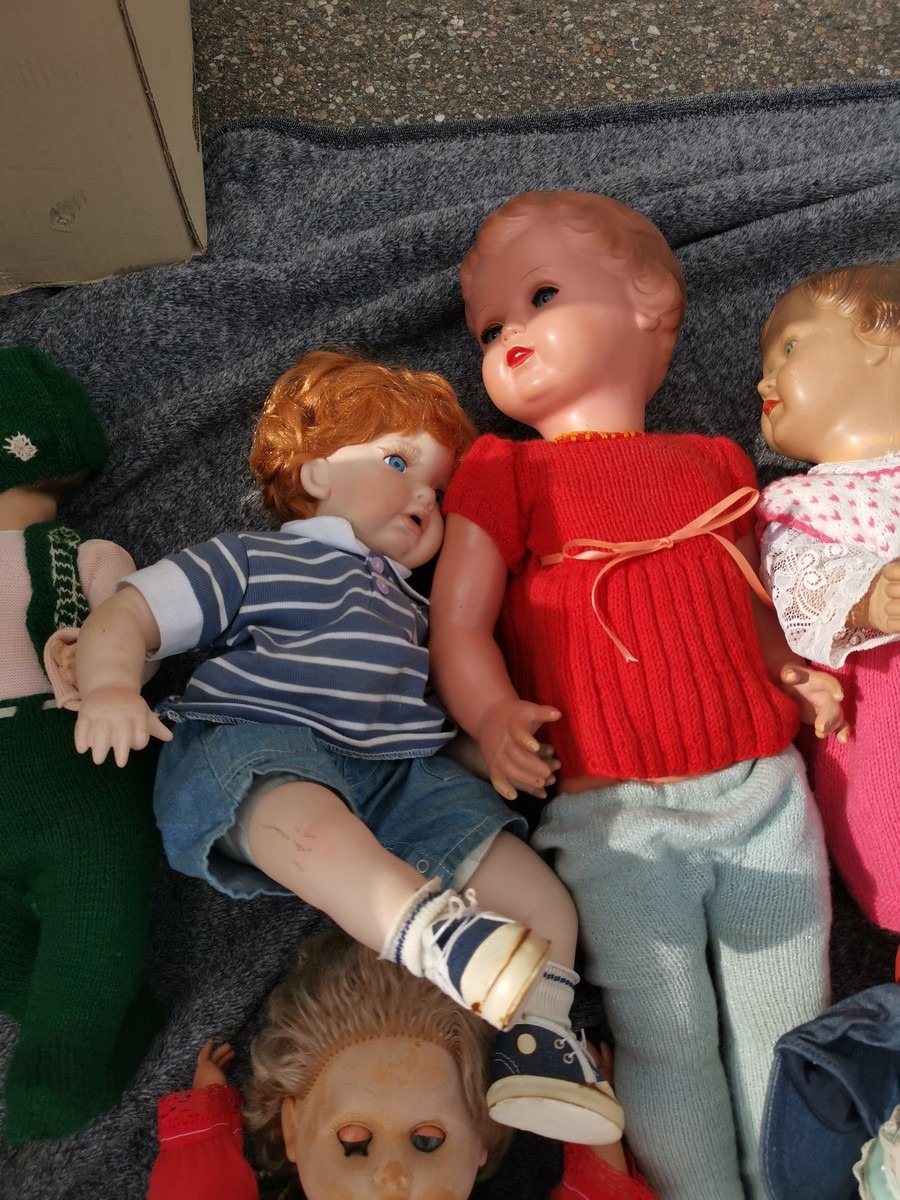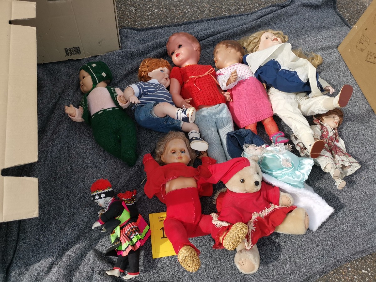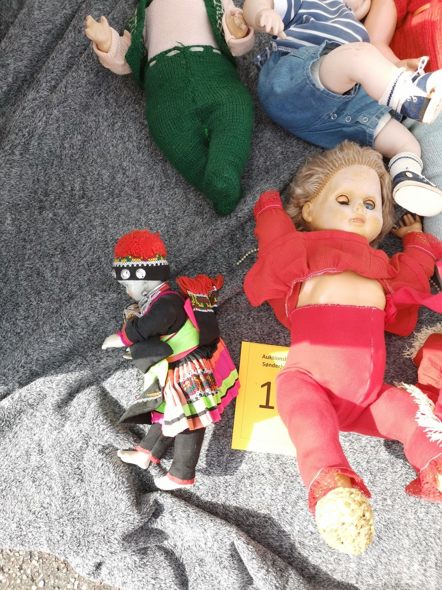 Lille parti dukker. Forskellige slags, str og stand. Ok stand og uden synlig lugt. Lottet står i en flytekasse. Fra en større samling fra et dødsbo.