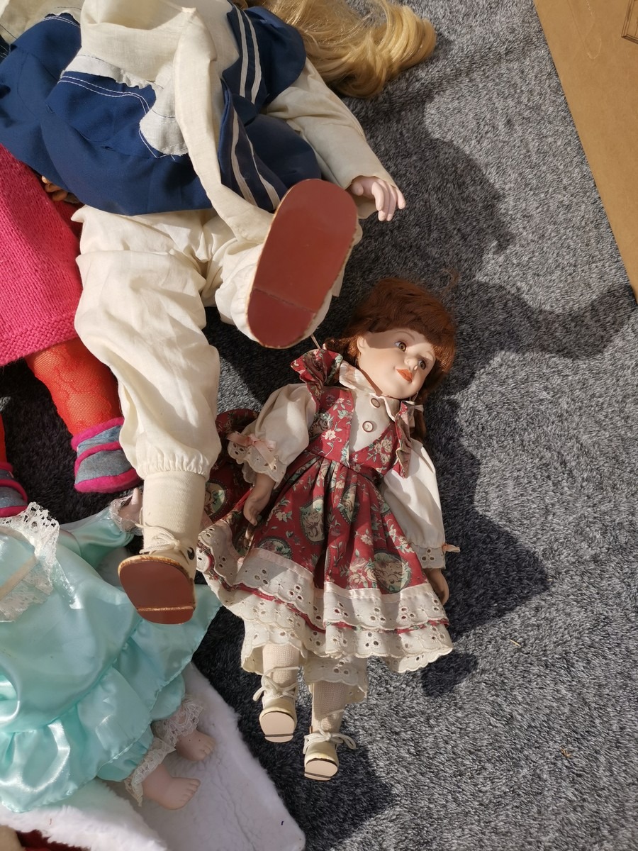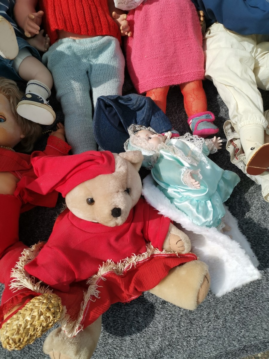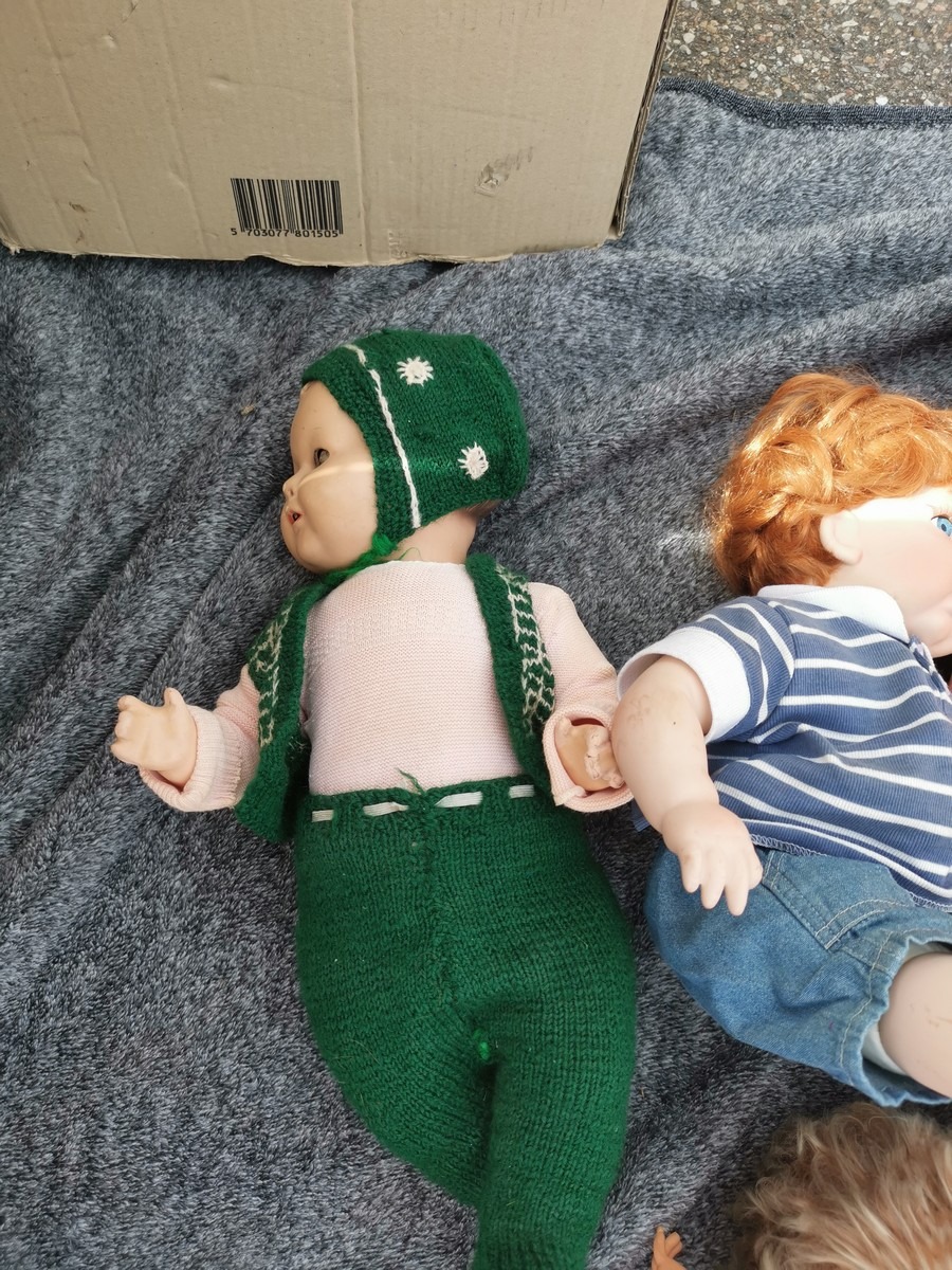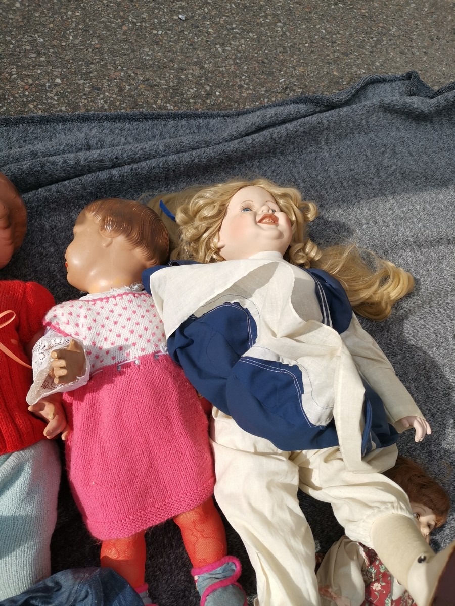 Lille parti dukker. Forskellige slags, str og stand. Ok stand og uden synlig lugt. Lottet står i en flytekasse. Fra en større samling fra et dødsbo.