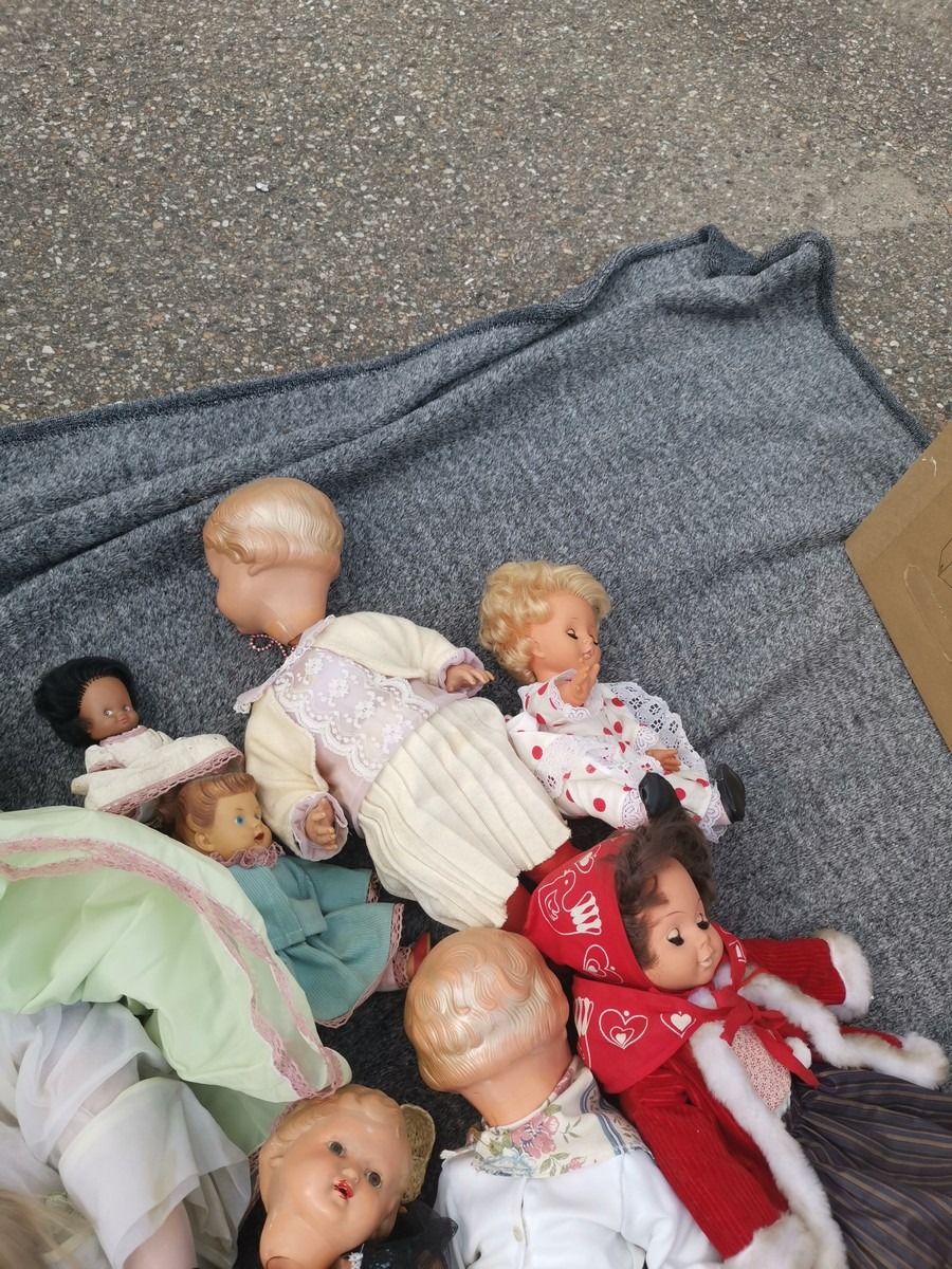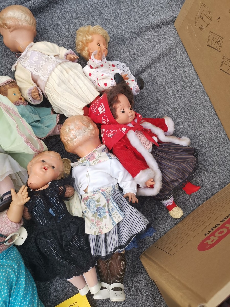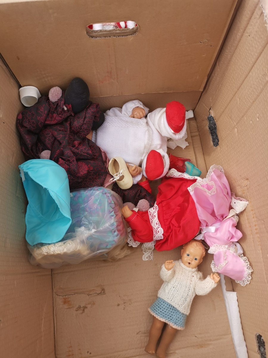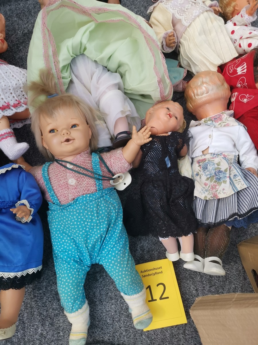 Lille parti dukker. Forskellige slags, str og stand. Ok stand og uden synlig lugt. Lottet står i en flytekasse. Fra en større samling fra et dødsbo.