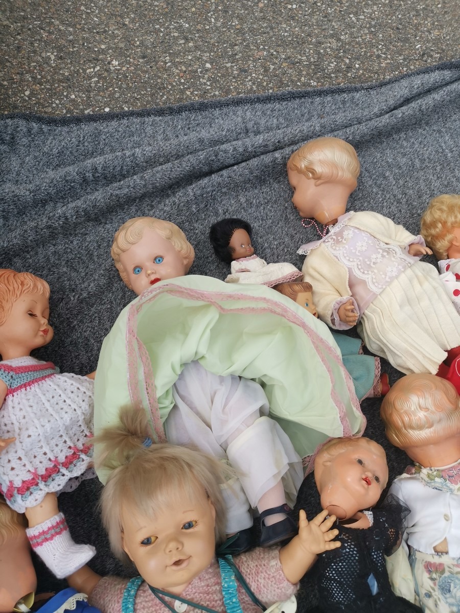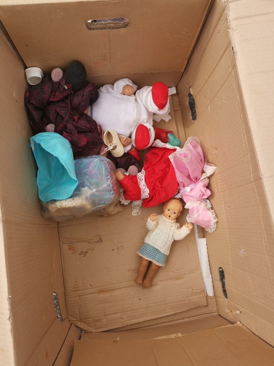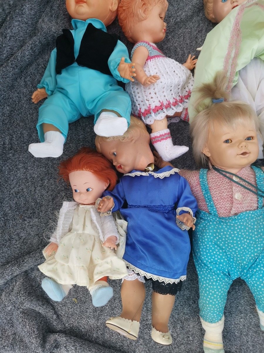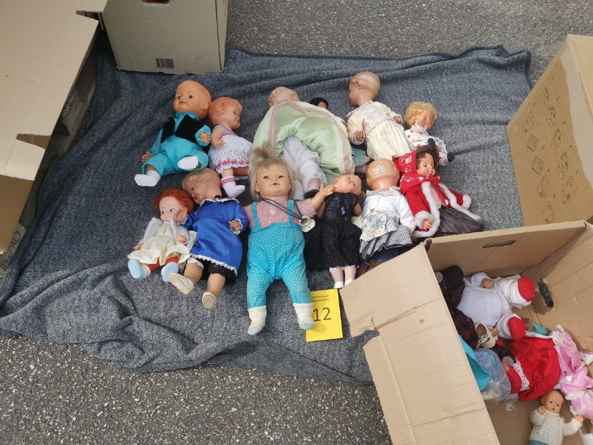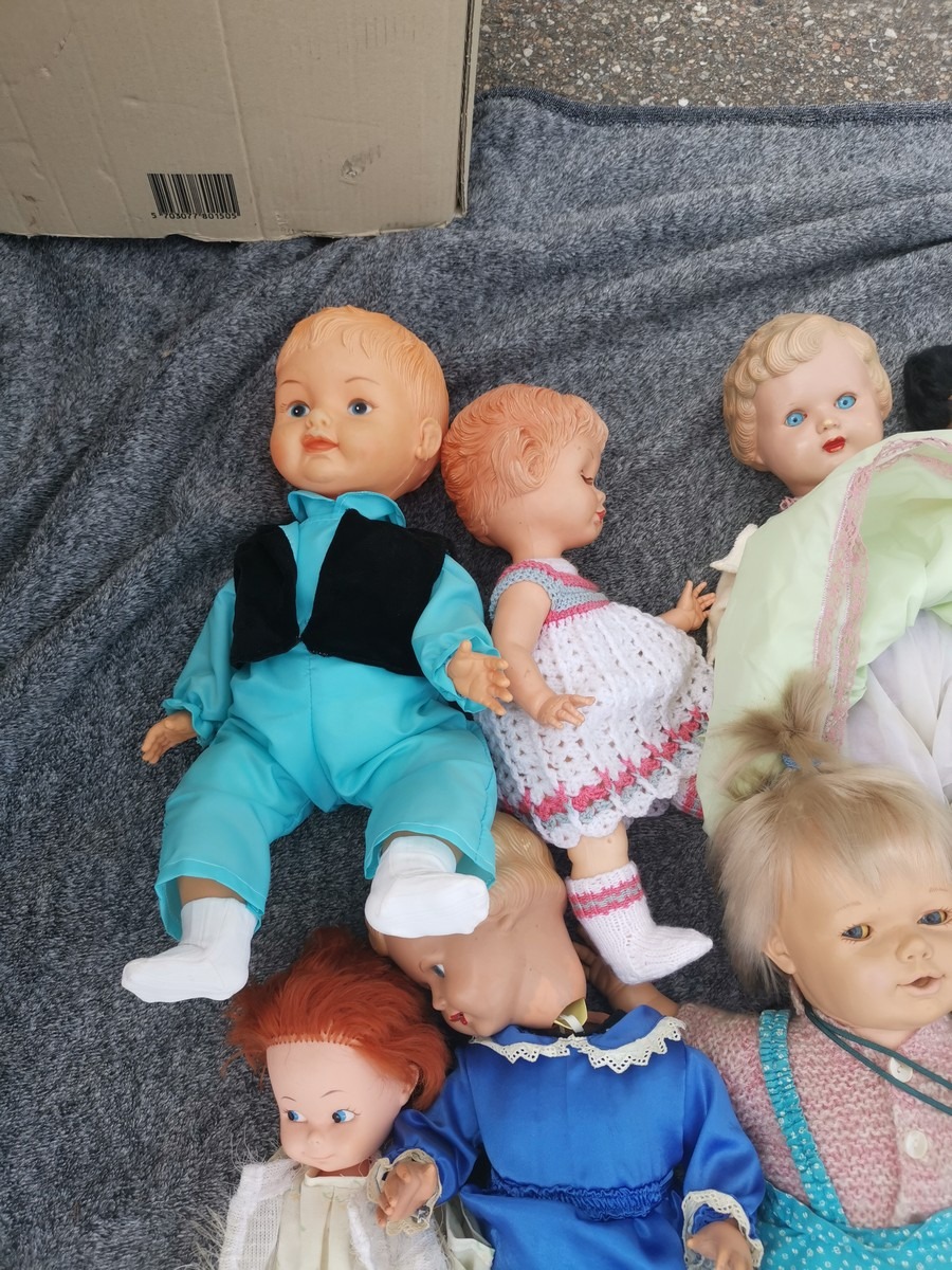Lille parti dukker. Forskellige slags, str og stand. Ok stand og uden synlig lugt. Lottet står i en flytekasse. Fra en større samling fra et dødsbo.