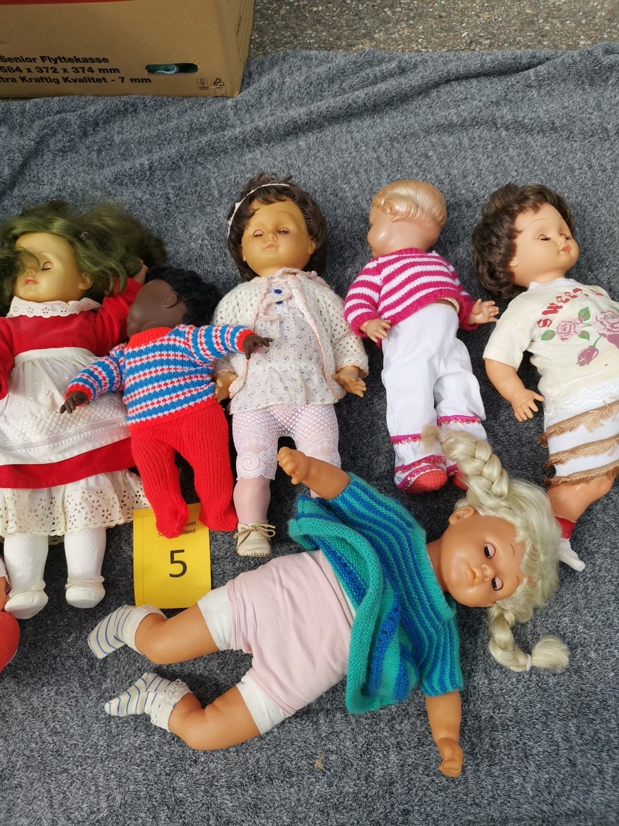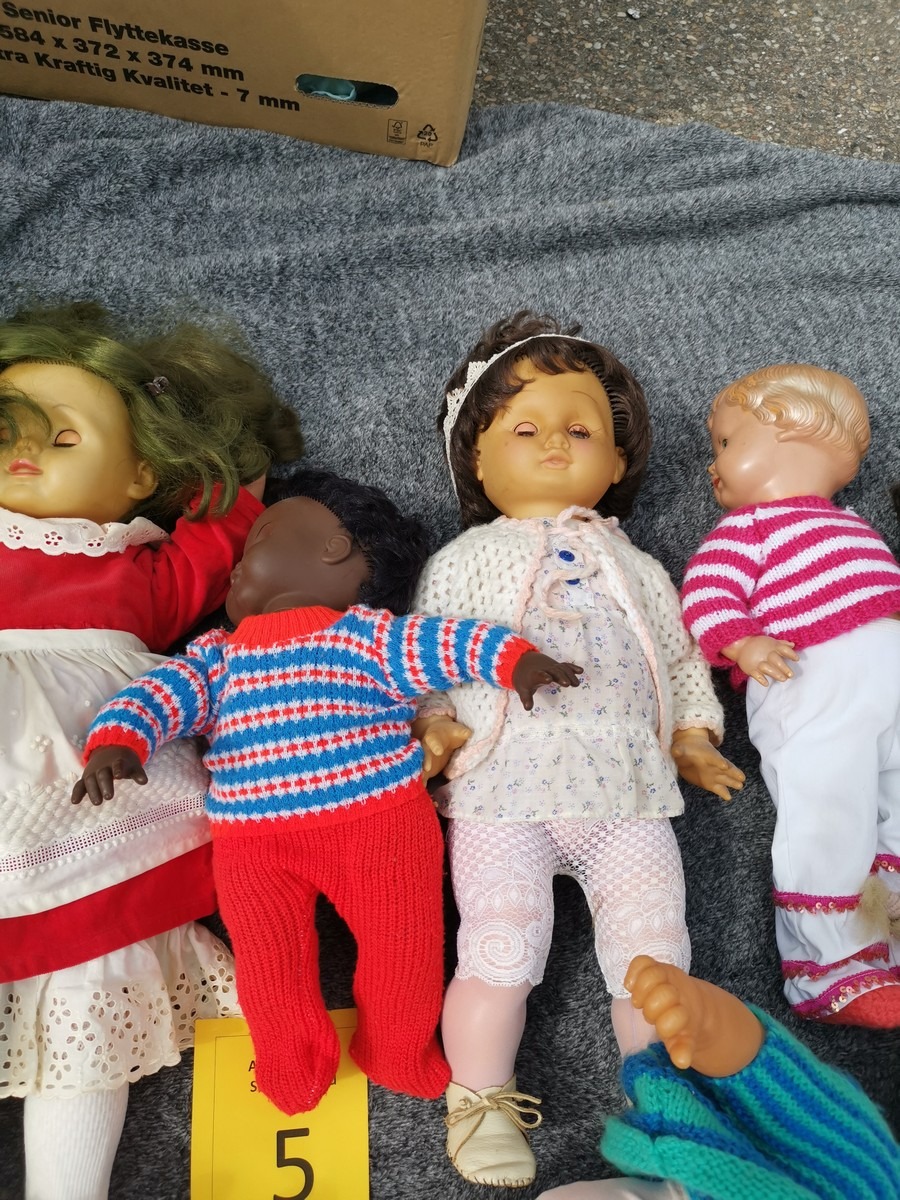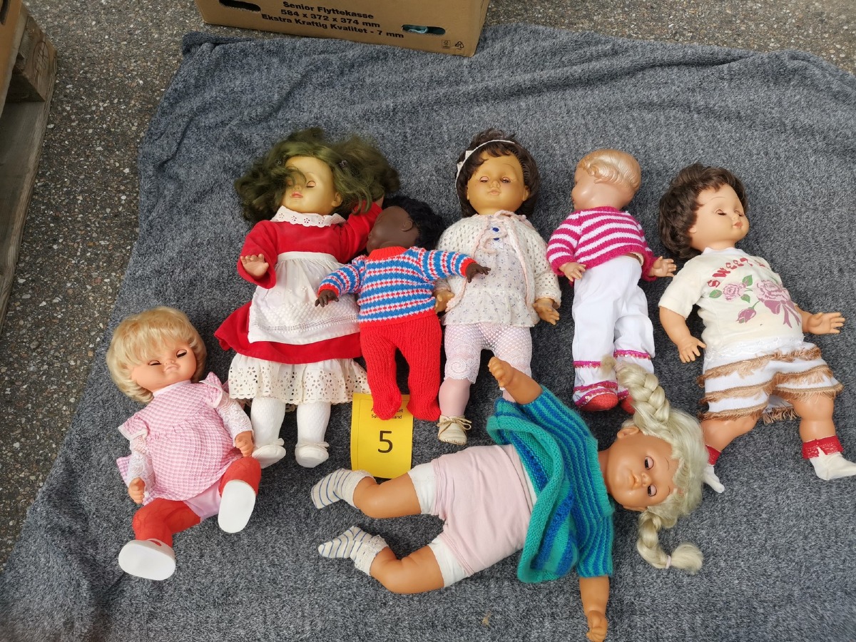 Lille parti dukker. Forskellige slags, str og stand. Ok stand og uden synlig lugt. Lottet står i en flytekasse. Fra en større samling fra et dødsbo.