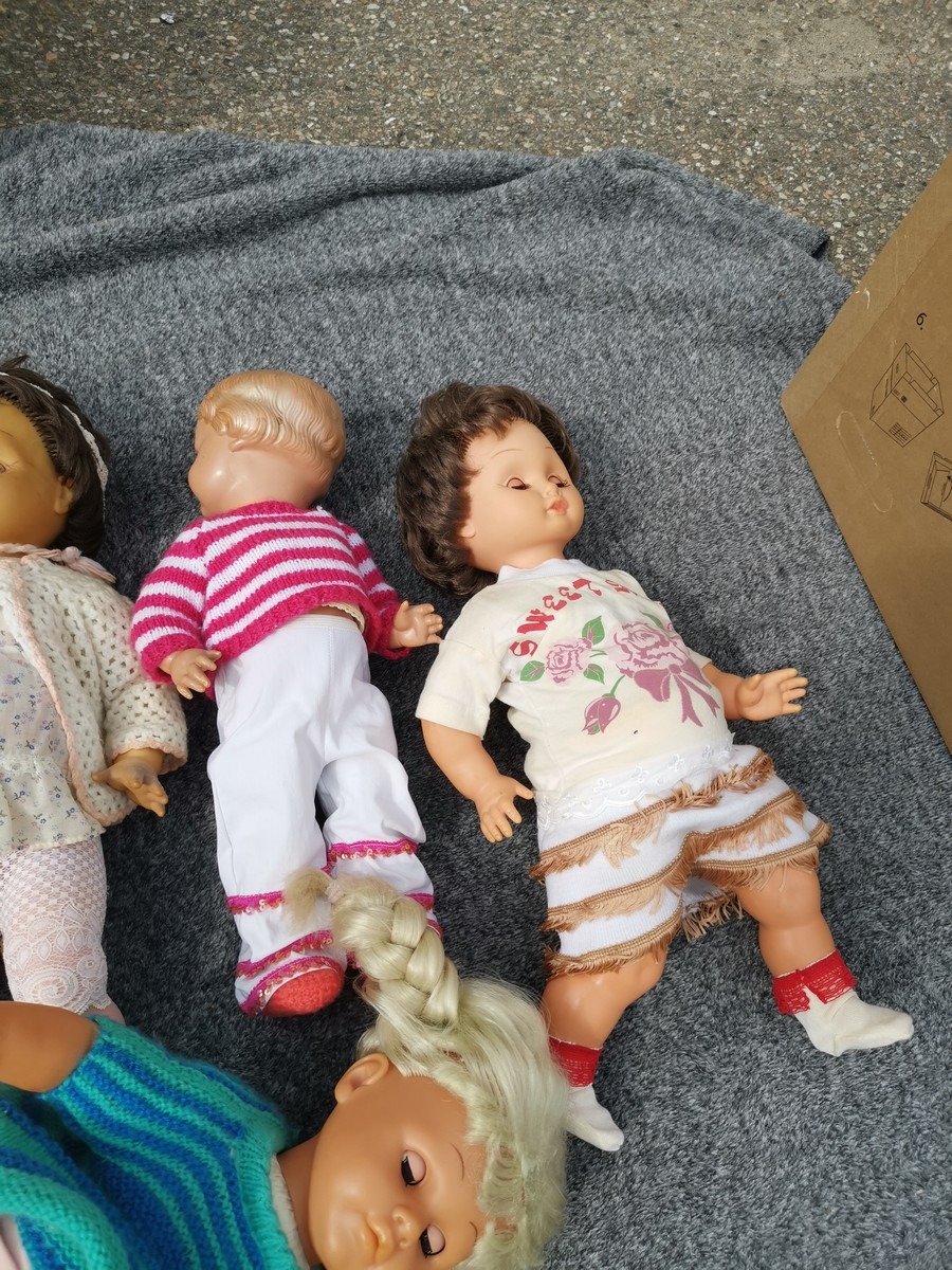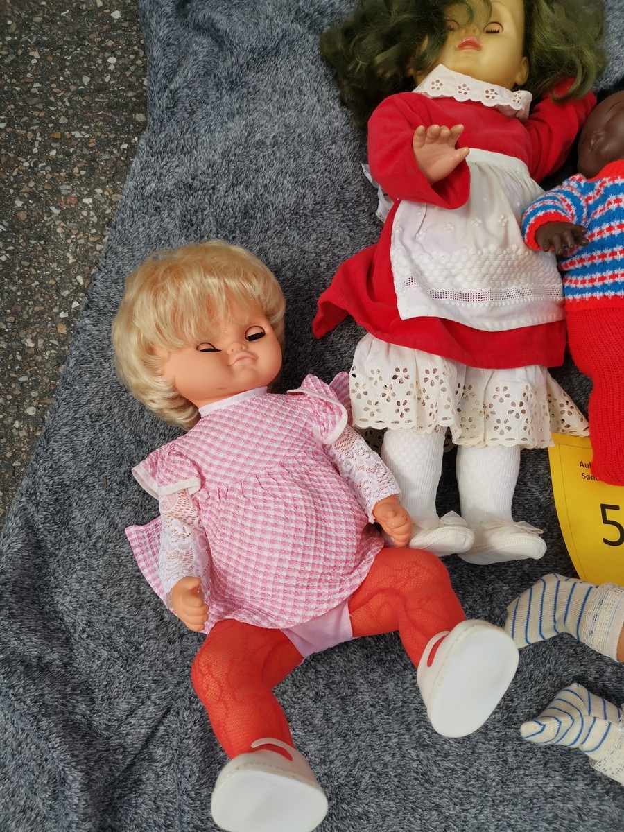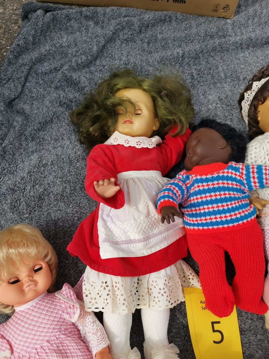 Lille parti dukker. Forskellige slags, str og stand. Ok stand og uden synlig lugt. Lottet står i en flytekasse. Fra en større samling fra et dødsbo.