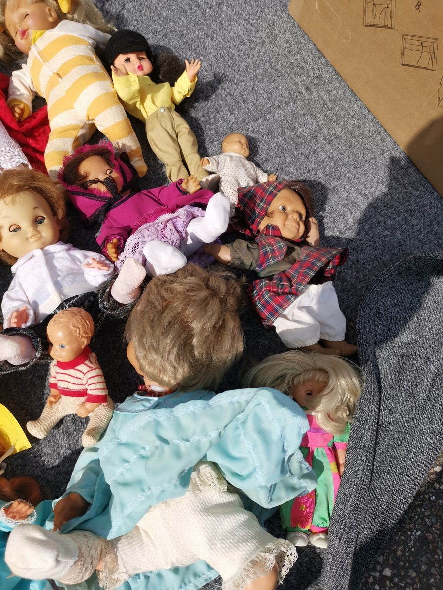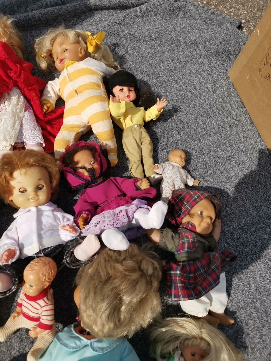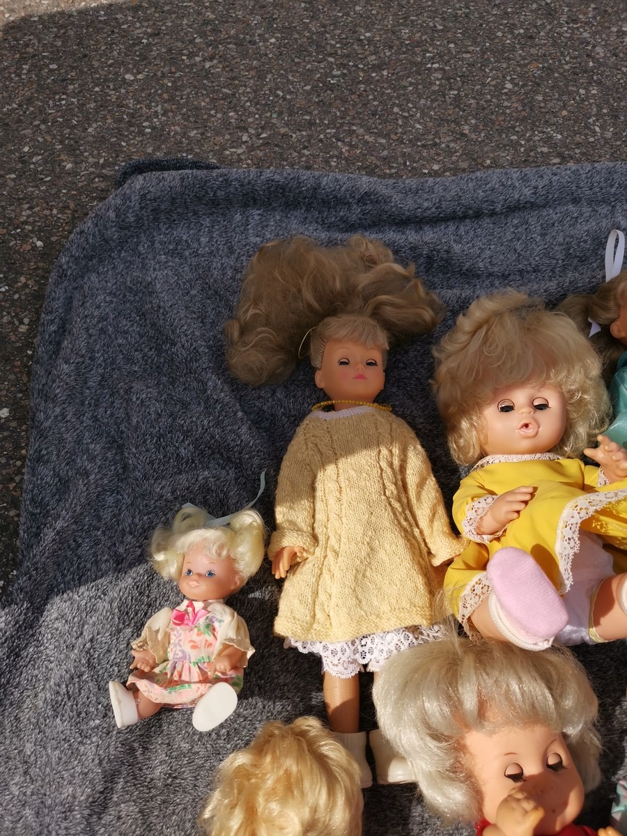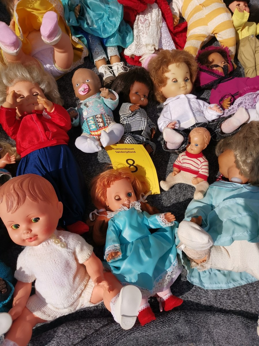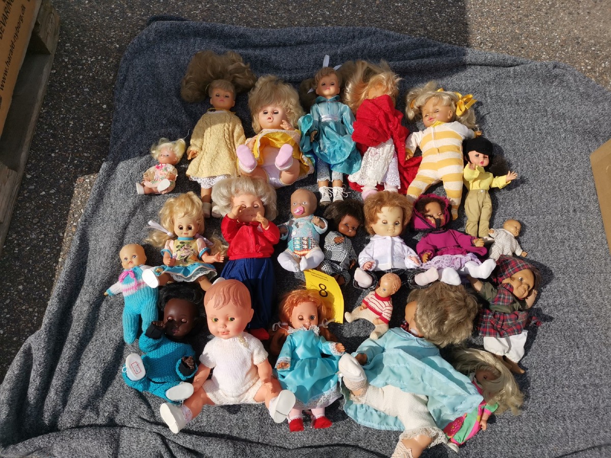 Lille parti dukker. Forskellige slags, str og stand. Ok stand og uden synlig lugt. Lottet står i en flytekasse. Fra en større samling fra et dødsbo.