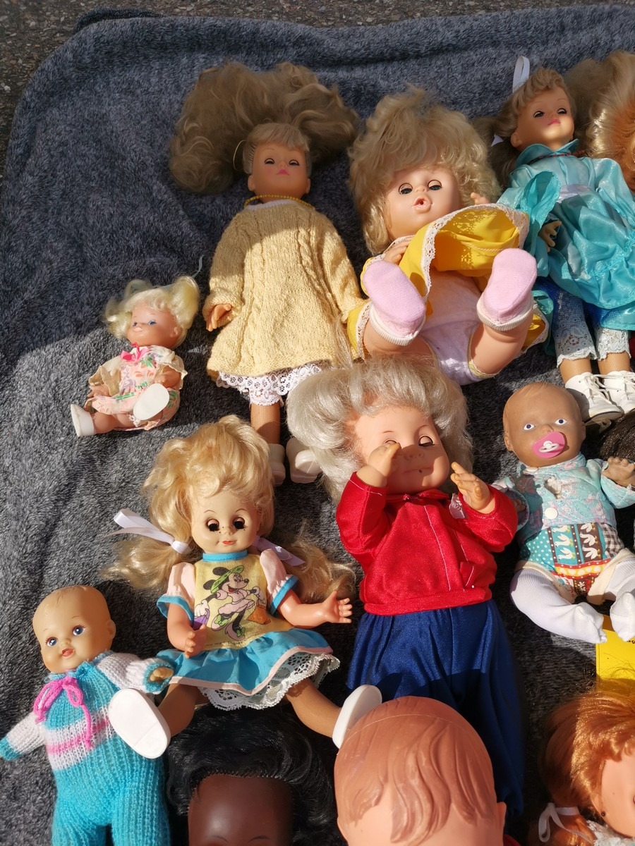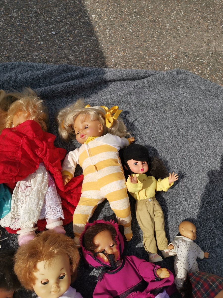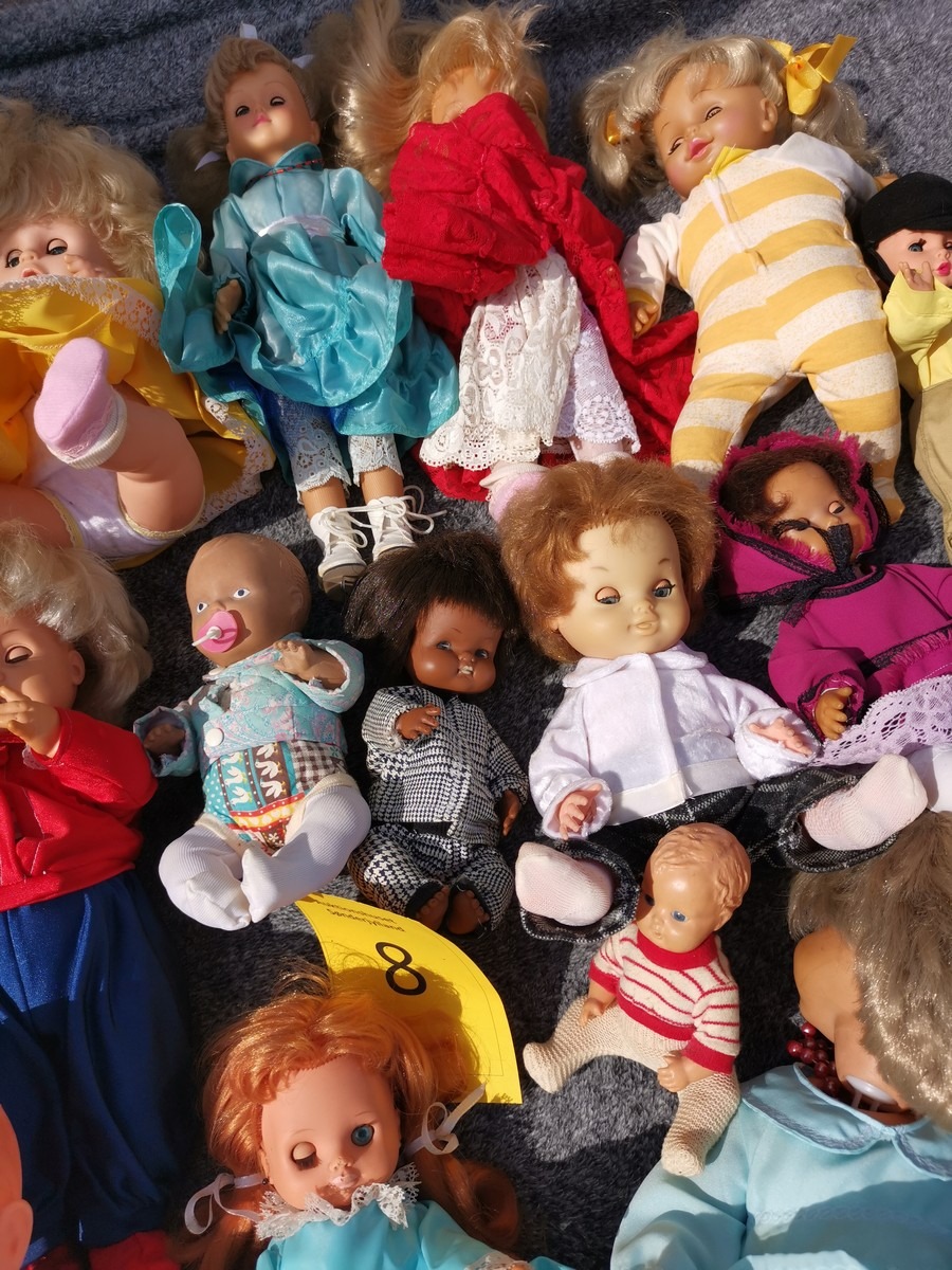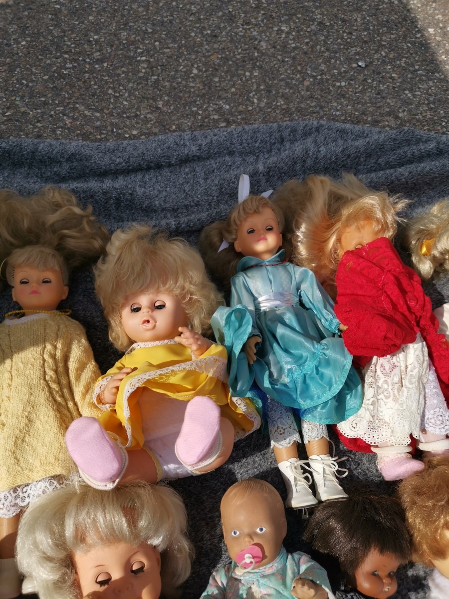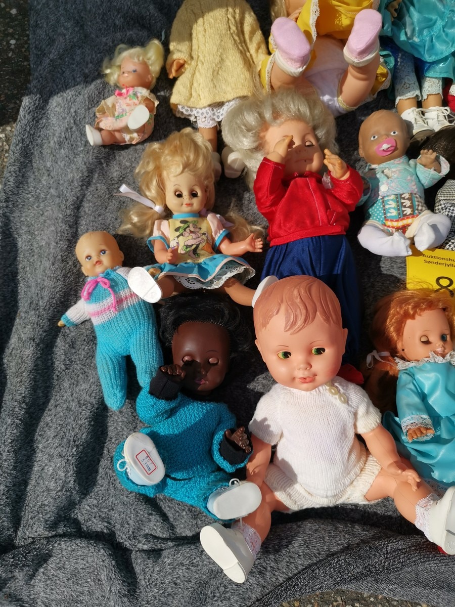 Lille parti dukker. Forskellige slags, str og stand. Ok stand og uden synlig lugt. Lottet står i en flytekasse. Fra en større samling fra et dødsbo.