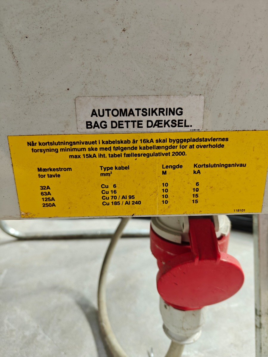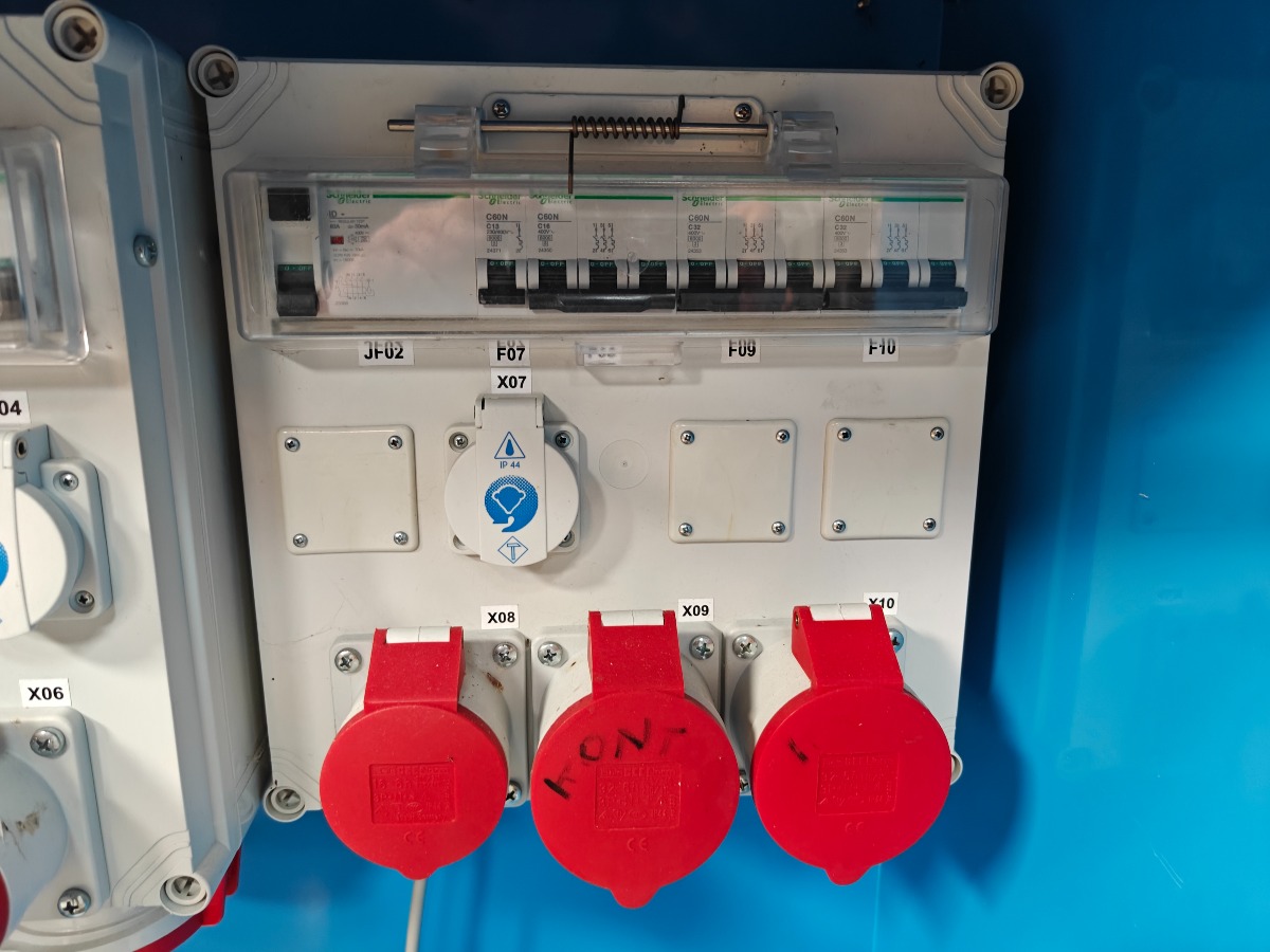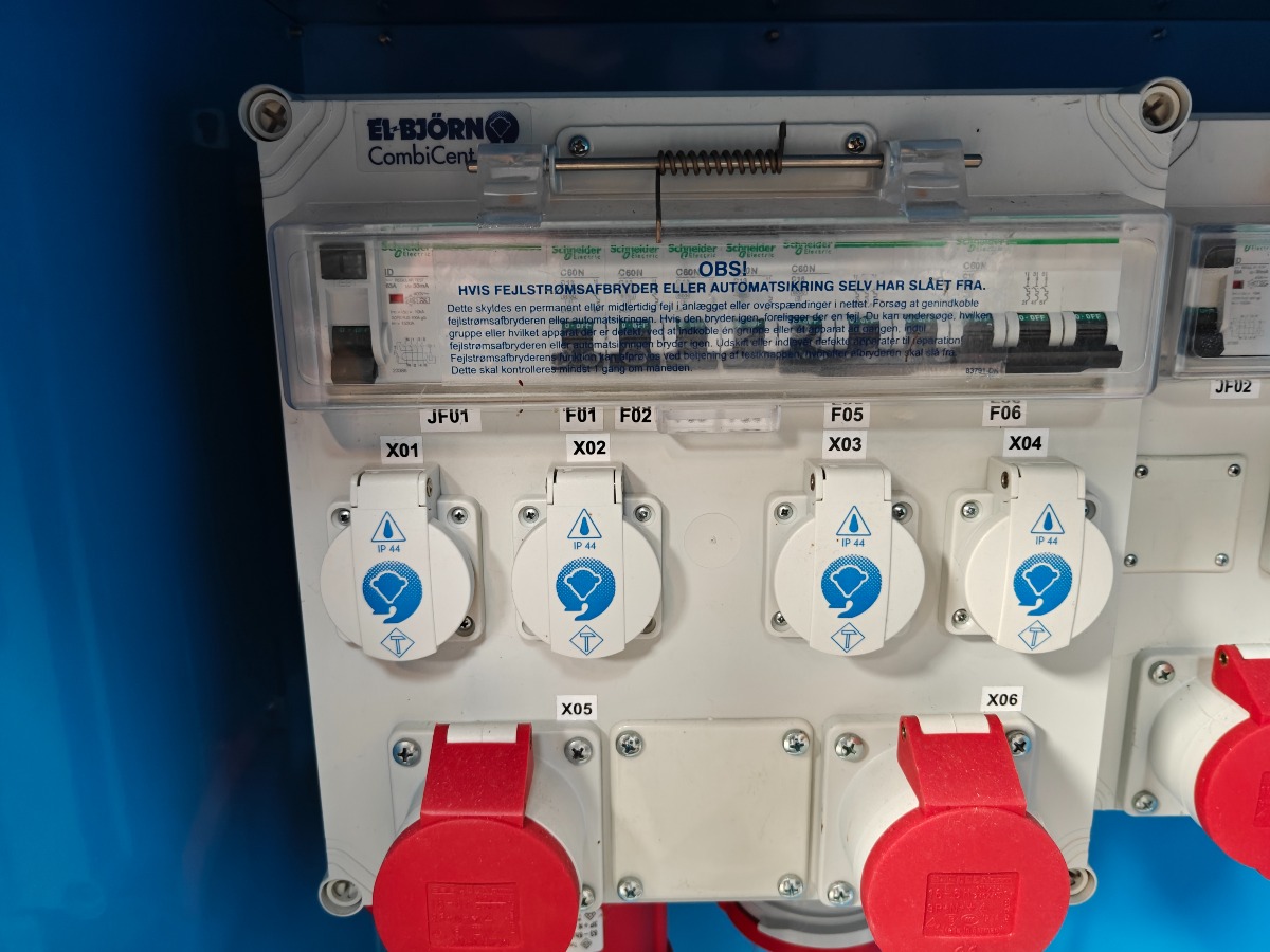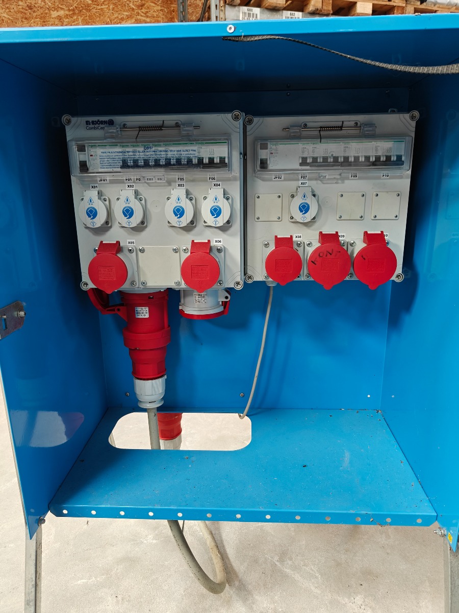 El-bjørn byggestrøms tavle med 3 x 16 amp kraftudtag, 2  x 32 amp kragt udtag 5 x 220v udtag tavlen måler 70 x 120 incl. stativ.