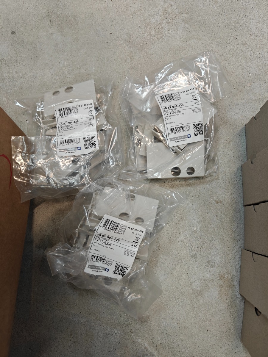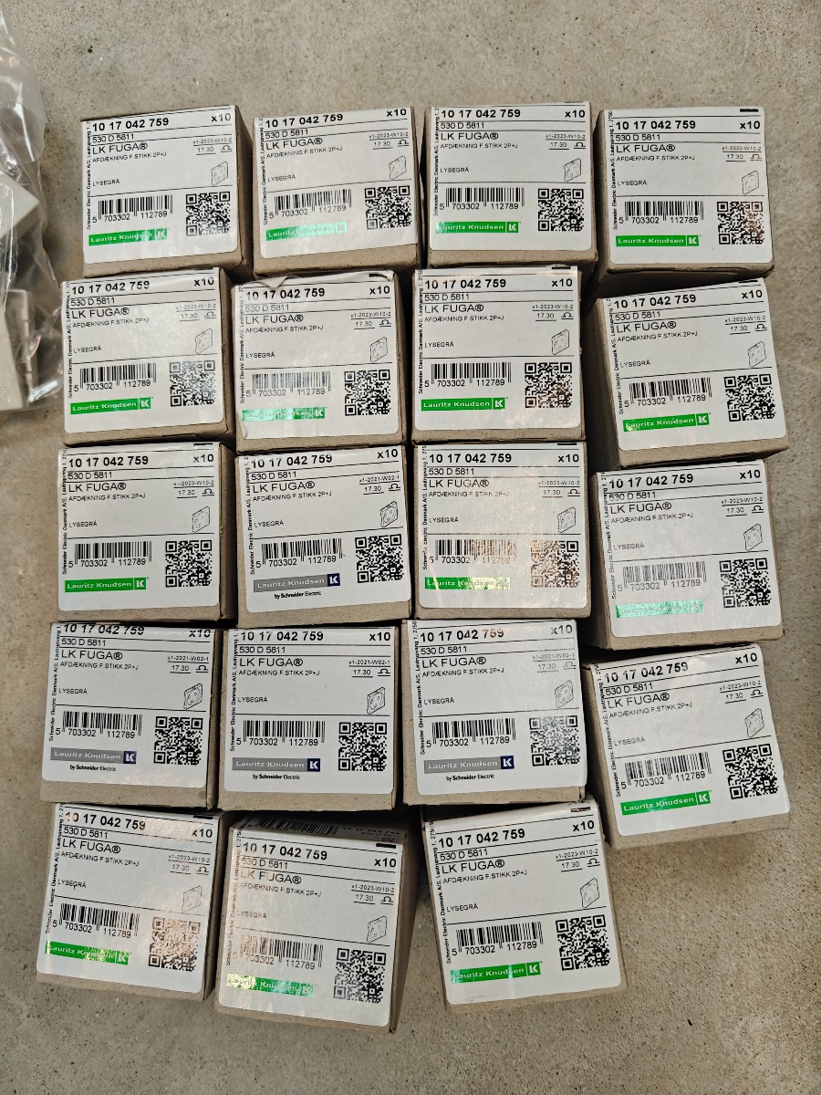 Parti LK i lysegrå. Afdækning stikkotakt med jord, tangenter, afdæknning for stik med jord, blænddæksel, afdækning for blænddæksel afdækning tv/radio/ data & lampestik,