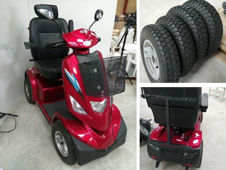 Rød el-scooter, HS-928 maxi med kaptjan sæde, forkurv, 2 stk. spejle, 3 stk. nøgler, oplader, manual, samt 4 nye dæk. Den er 4 watt og med 100 AH batteri. Den er købt januar 2024 og har kørt 4.751 km. Brugt, men i meget pæn stand.