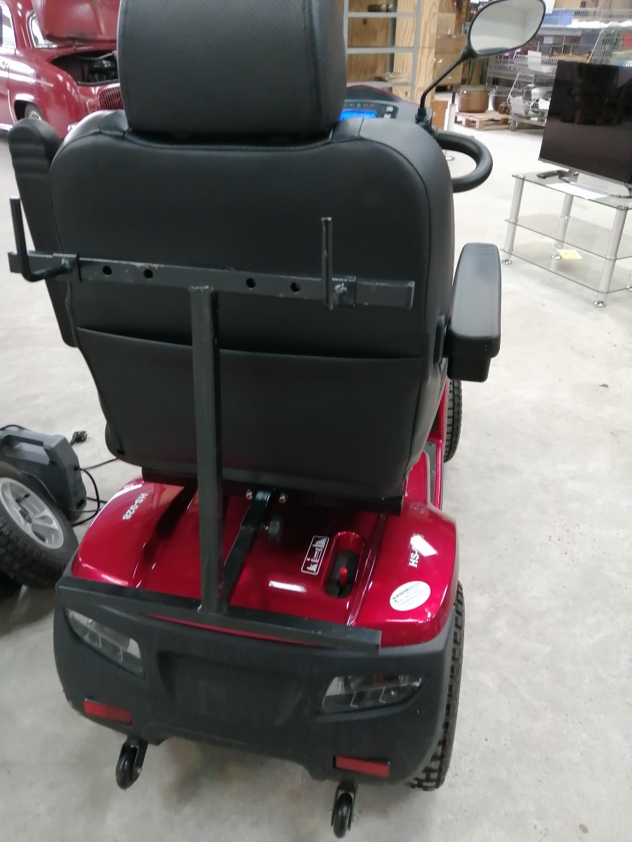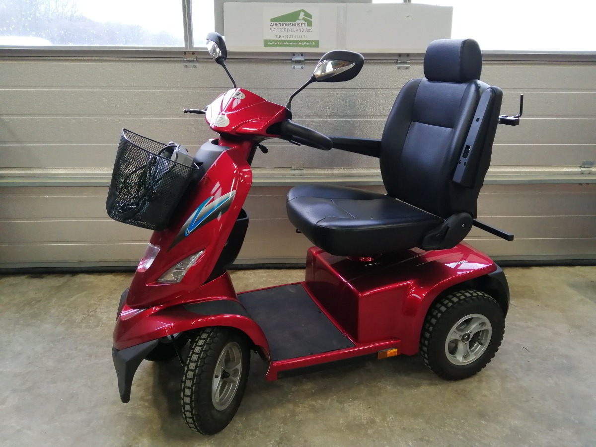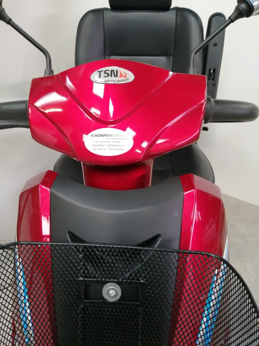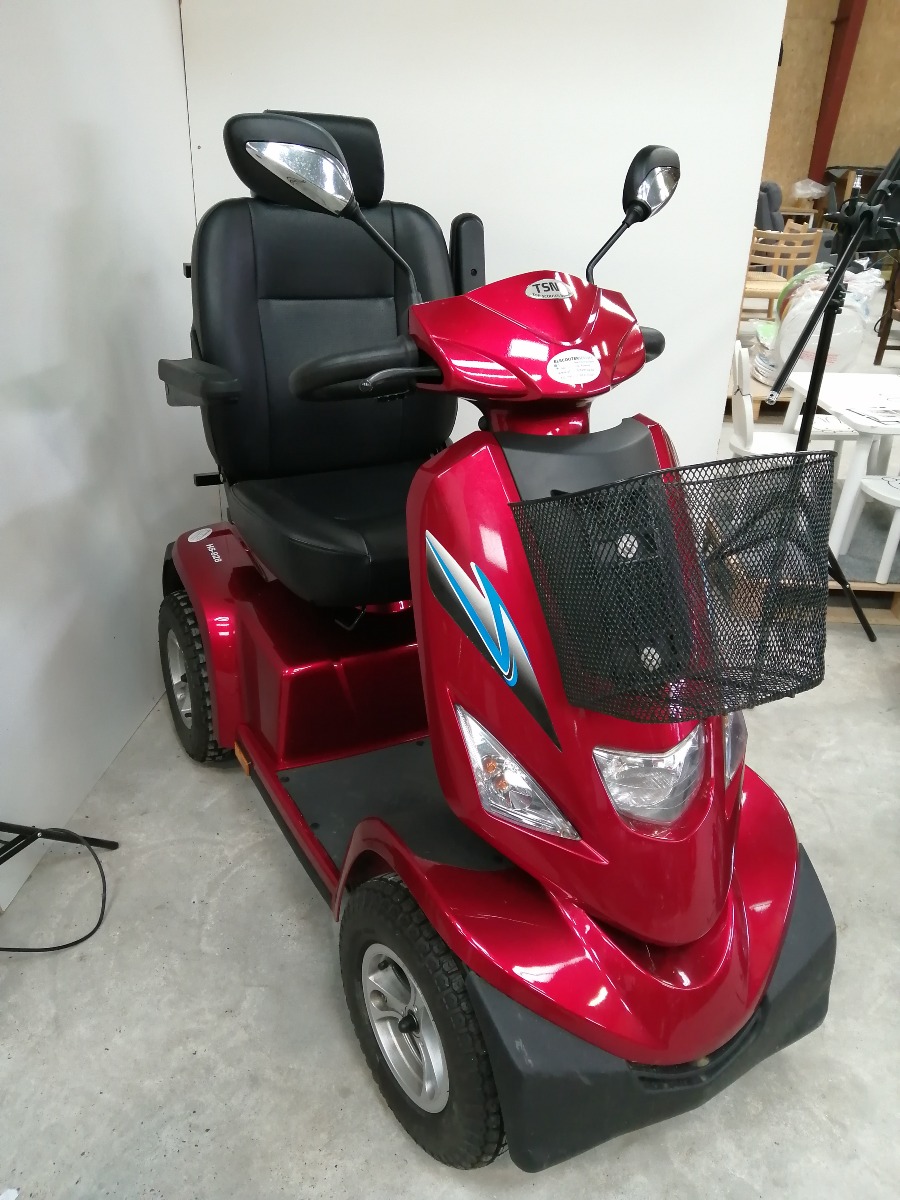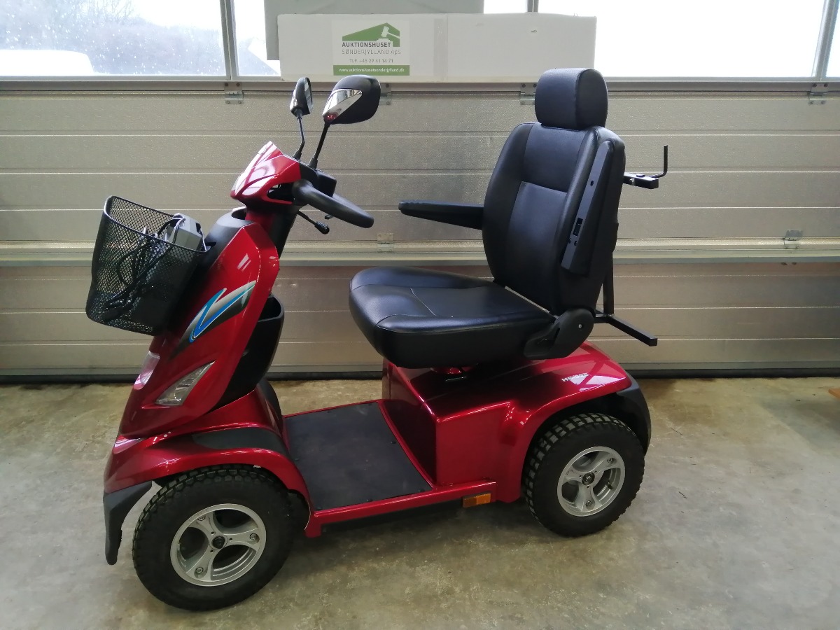 Rød el-scooter, HS-928 maxi med kaptjan sæde, forkurv, 2 stk. spejle, 3 stk. nøgler, oplader, manual, samt 4 nye dæk. Den er 4 watt og med 100 AH batteri. Den er købt januar 2024 og har kørt 4.751 km. Brugt, men i meget pæn stand.
