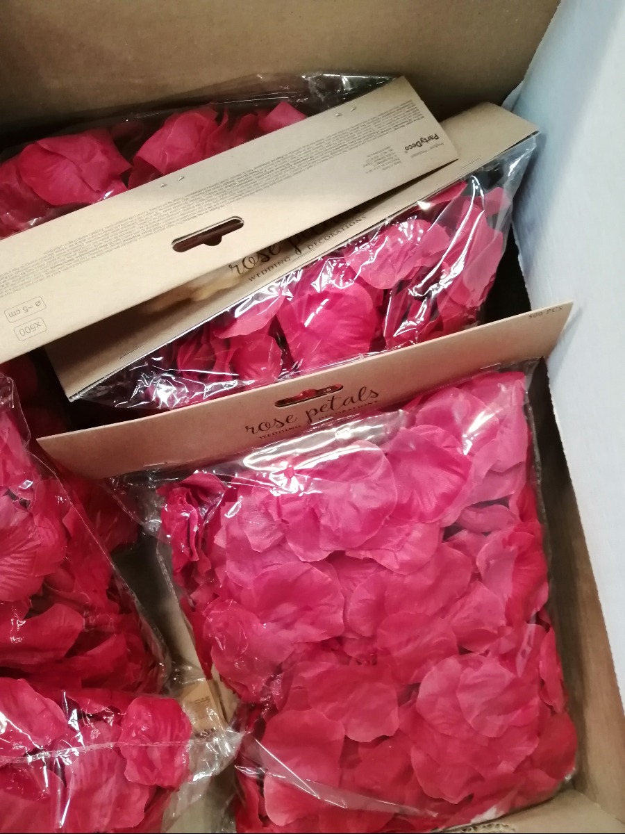 8 poser kunstige rosenblade a 500 stk. 2 nuancer. Varerne stammer fra lukket webshop. Alle varer er ubrugte og af rigtig god kvalitet.