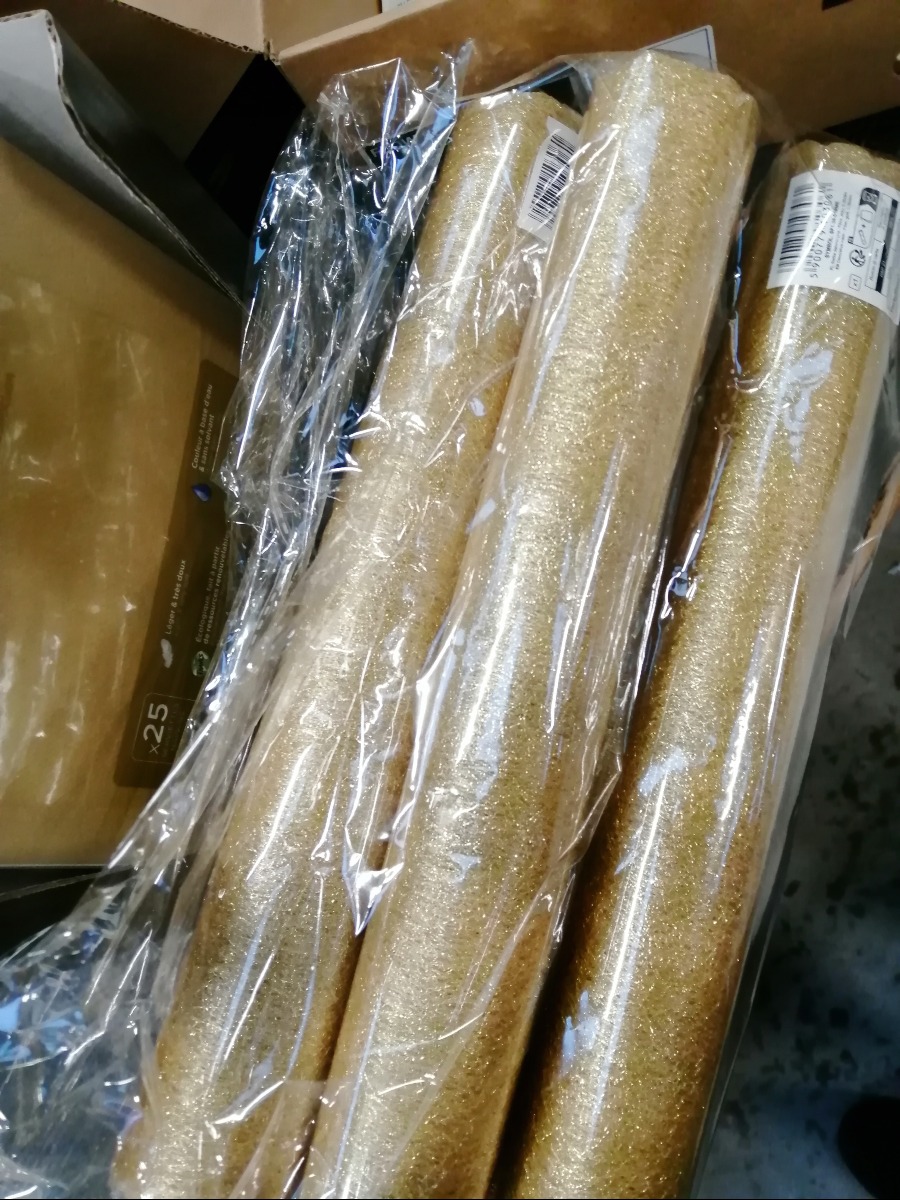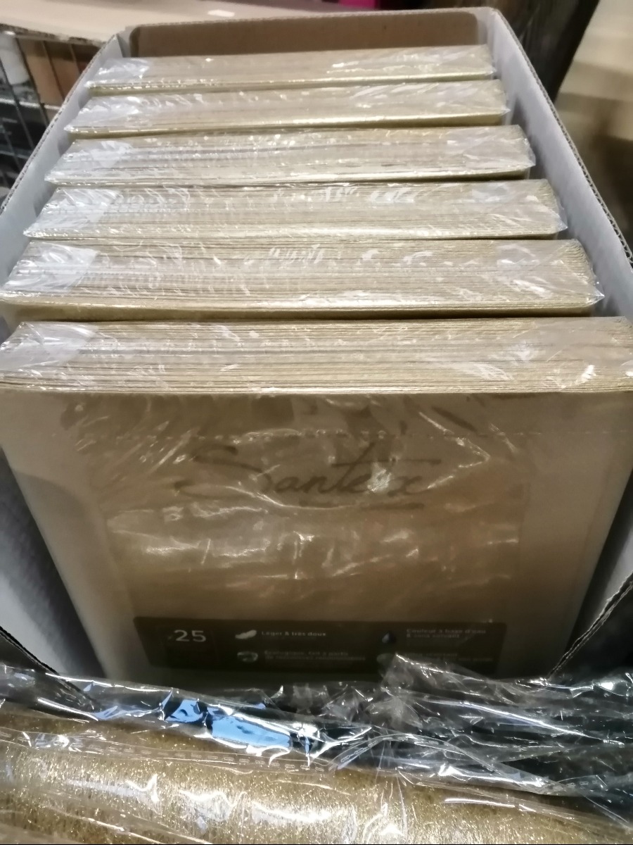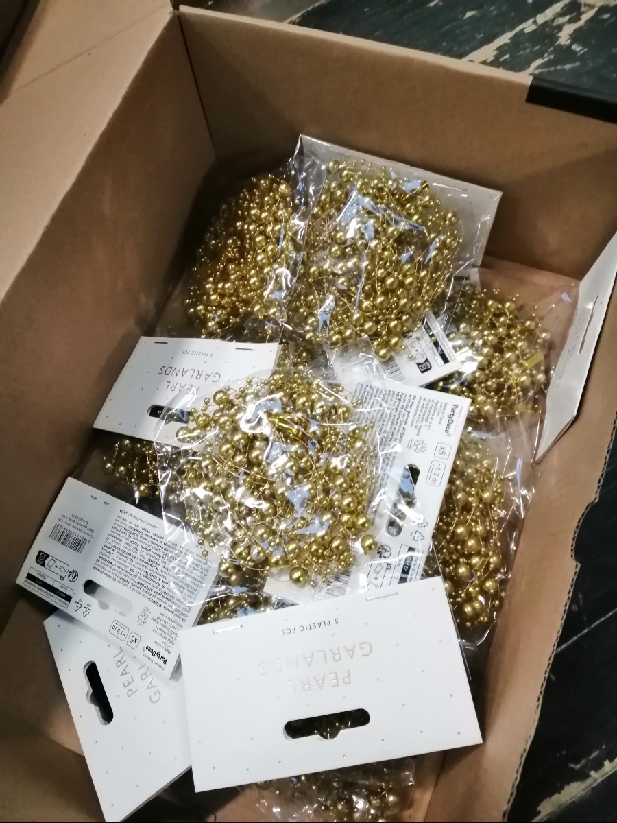 Guld servietter og bordløber samt, guld pynt. Varerne stammer fra lukket webshop. Alle varer er ubrugte og af rigtig god kvalitet.