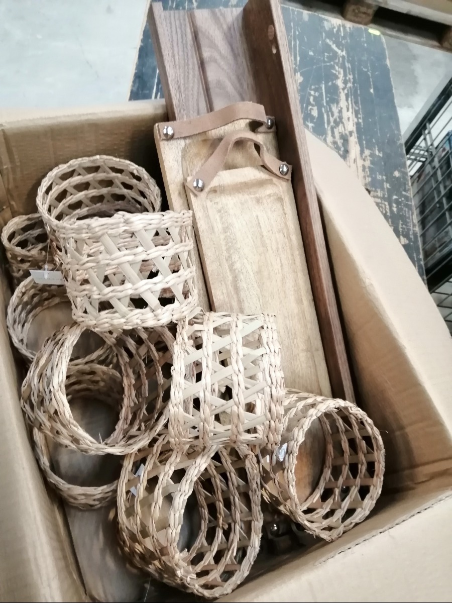 Tråd kurve og træbræt. Varerne stammer fra lukket webshop. Alle varer er ubrugte og af rigtig god kvalitet.