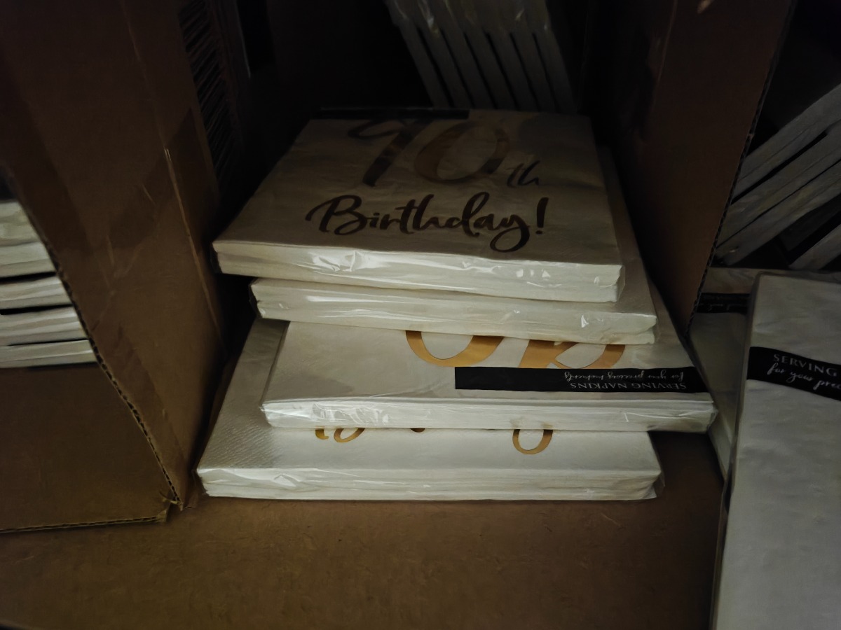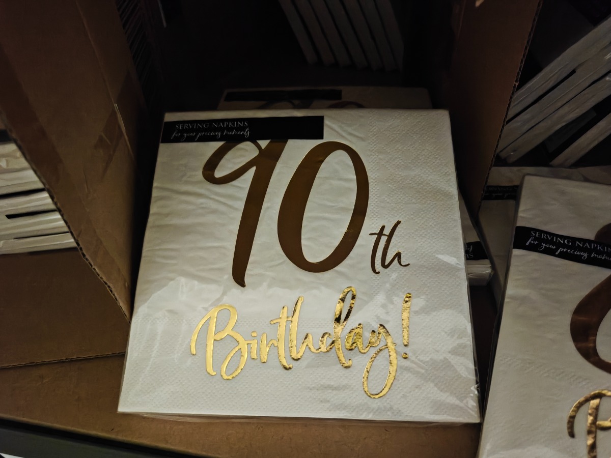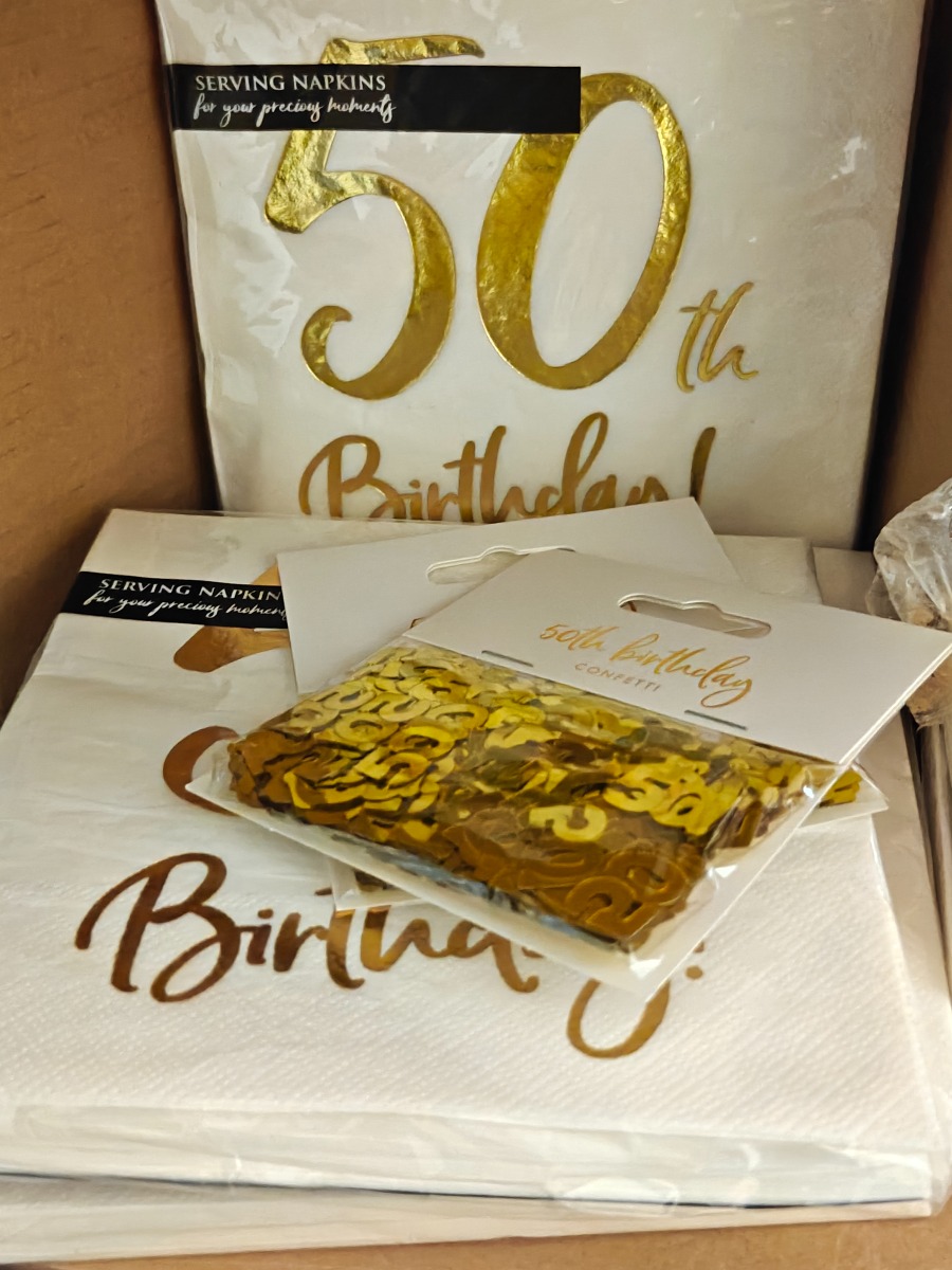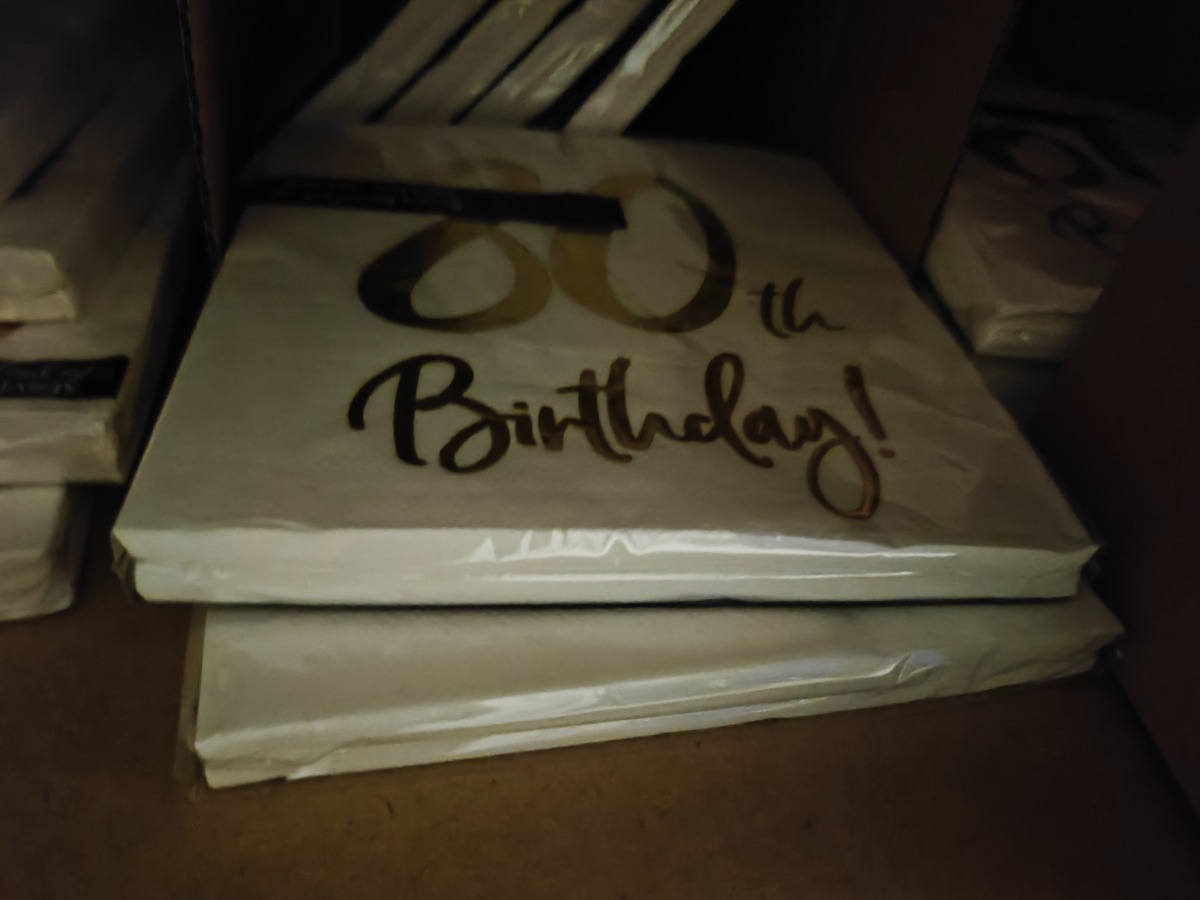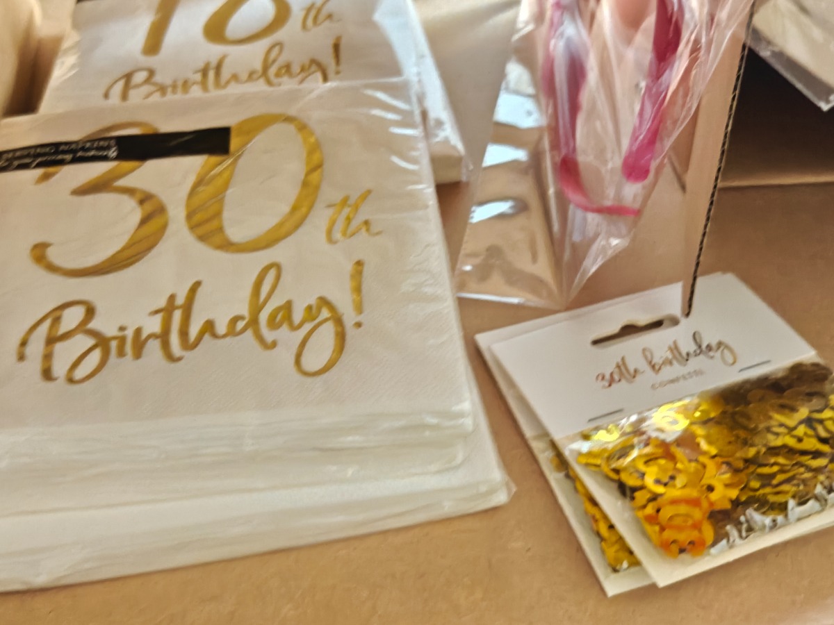 Hvide servietter til runde fødselsdage. Alt fra 18 til 90. Hertil enkelte andre ting med "runde" tal. Varerne stammer fra lukket webshop. Alle varer er ubrugte og af rigtig god kvalitet.
