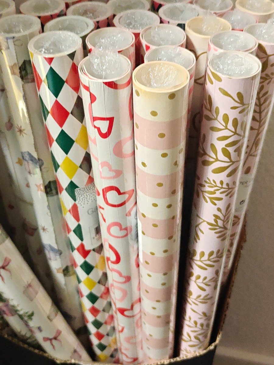 Mere end 30 ruller gavepapir. Både jul og andre anledninger. Varerne stammer fra lukket webshop. Alle varer er ubrugte og af rigtig god kvalitet.