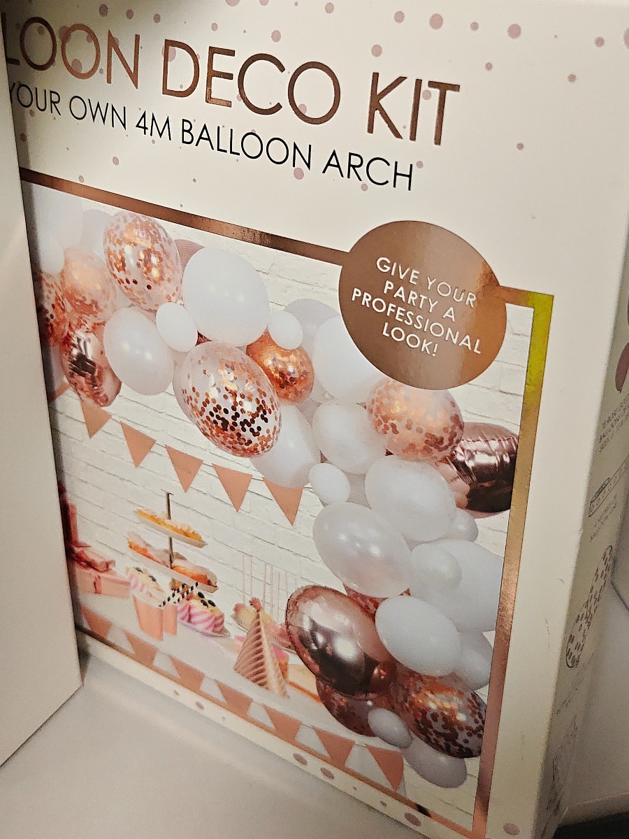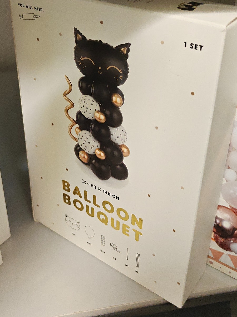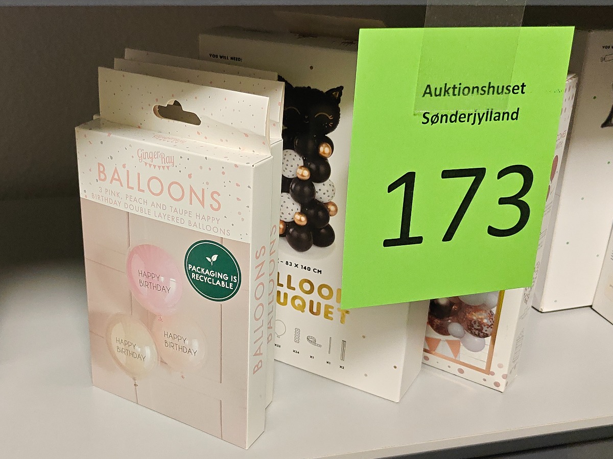 3 forskellige ballonkit. 3 sæt fødselsdagsballloner i i sarte farver, kit til sort kat samt større bue med gulddetaljer. Varerne stammer fra lukket webshop. Alle varer er ubrugte og af rigtig god kvalitet.