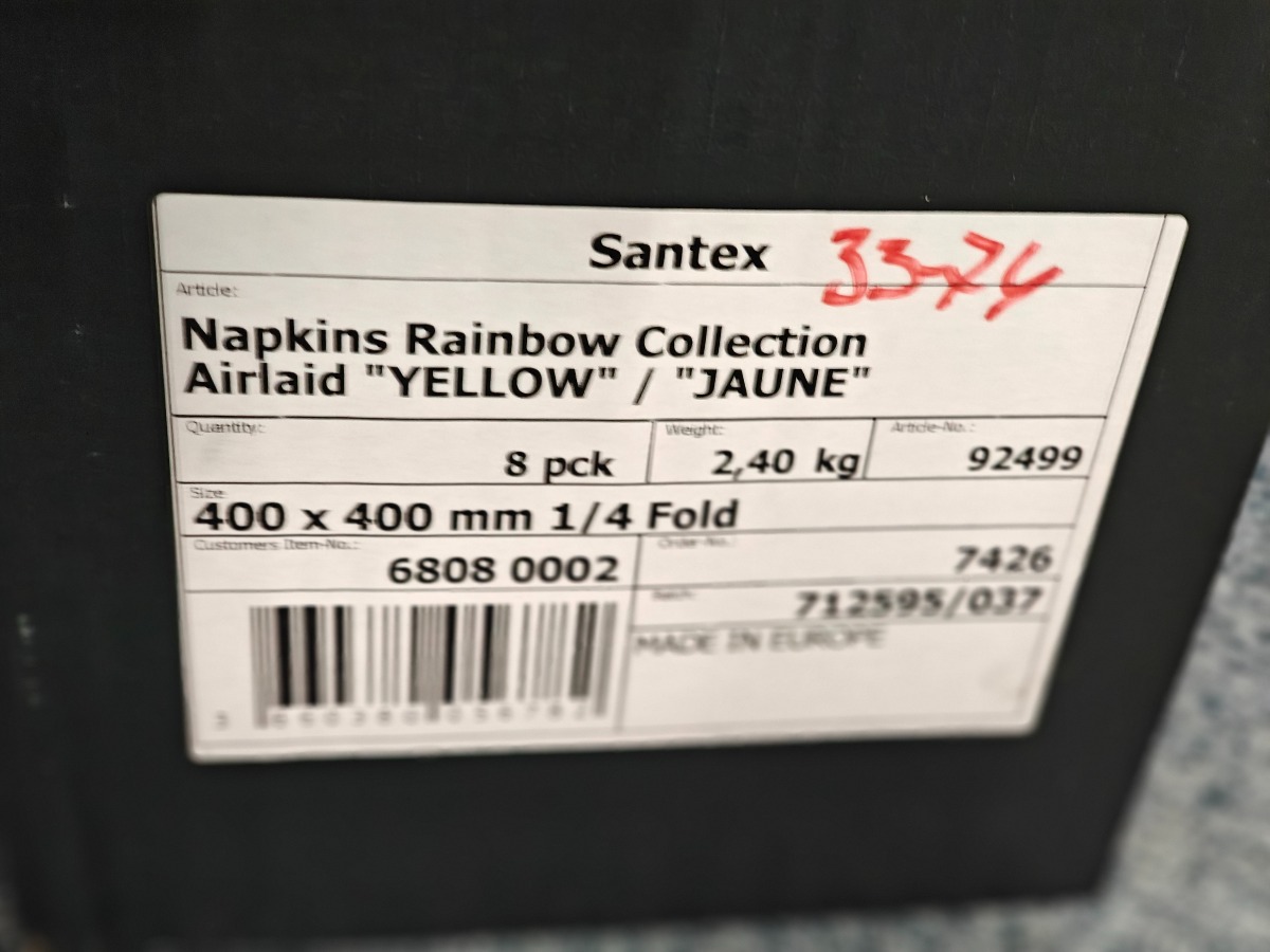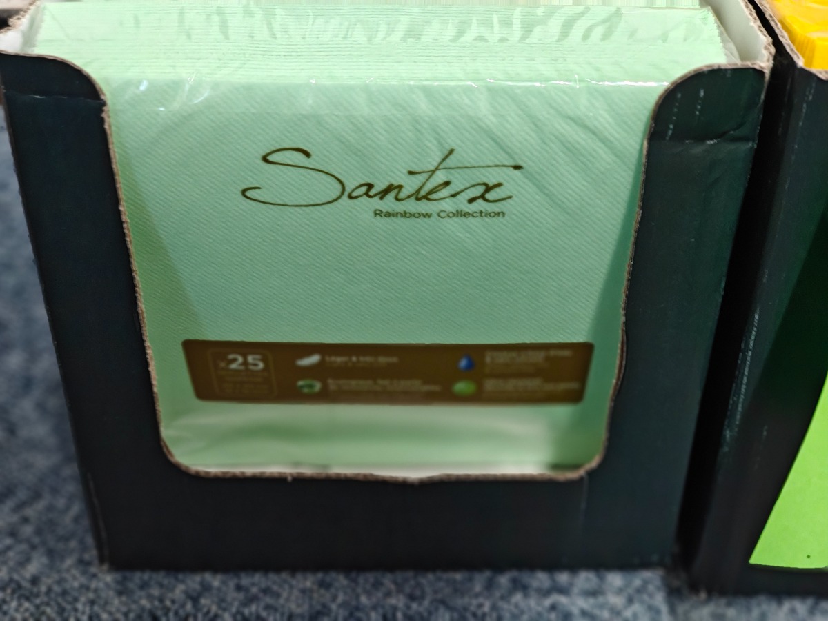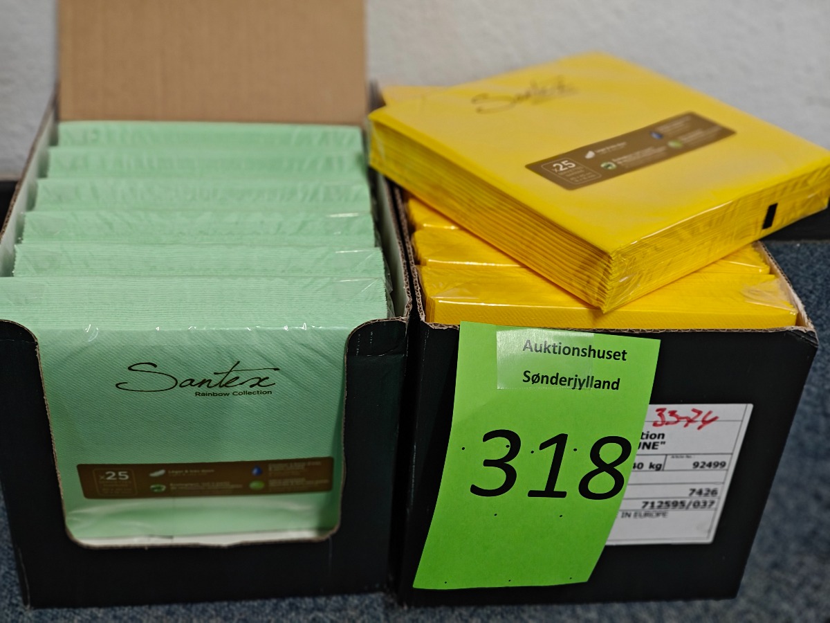 Servietter lysegrøn og gul (12). Santex servietter, 40 x 40 cm. Vejledende udsalgspris 49,95,-/pk. Varerne stammer fra lukket webshop. Alle varer er ubrugte og af rigtig god kvalitet.