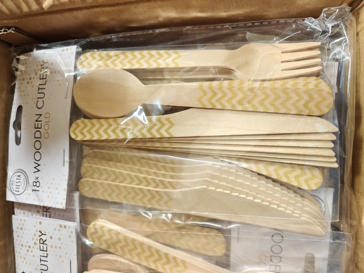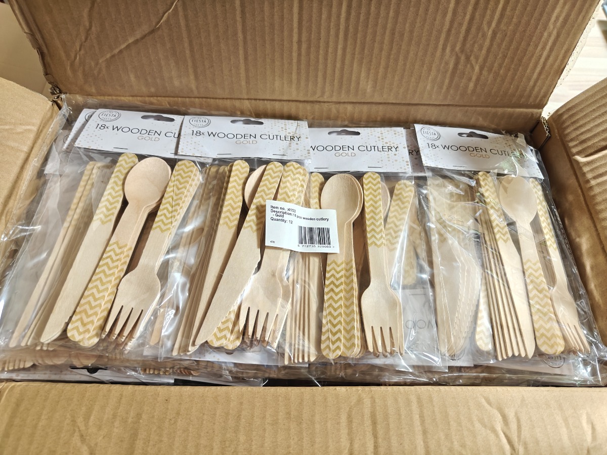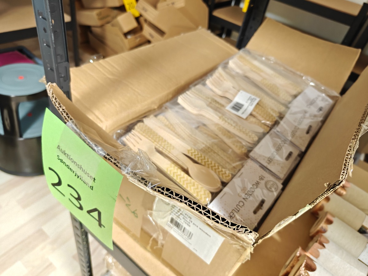 Parti træbestik (50 pakker) Hver pakke indeholder 18 stk, 6 knive, 6 gafler og 6 skeer. Varerne stammer fra lukket webshop. Alle varer er ubrugte og af rigtig god kvalitet.