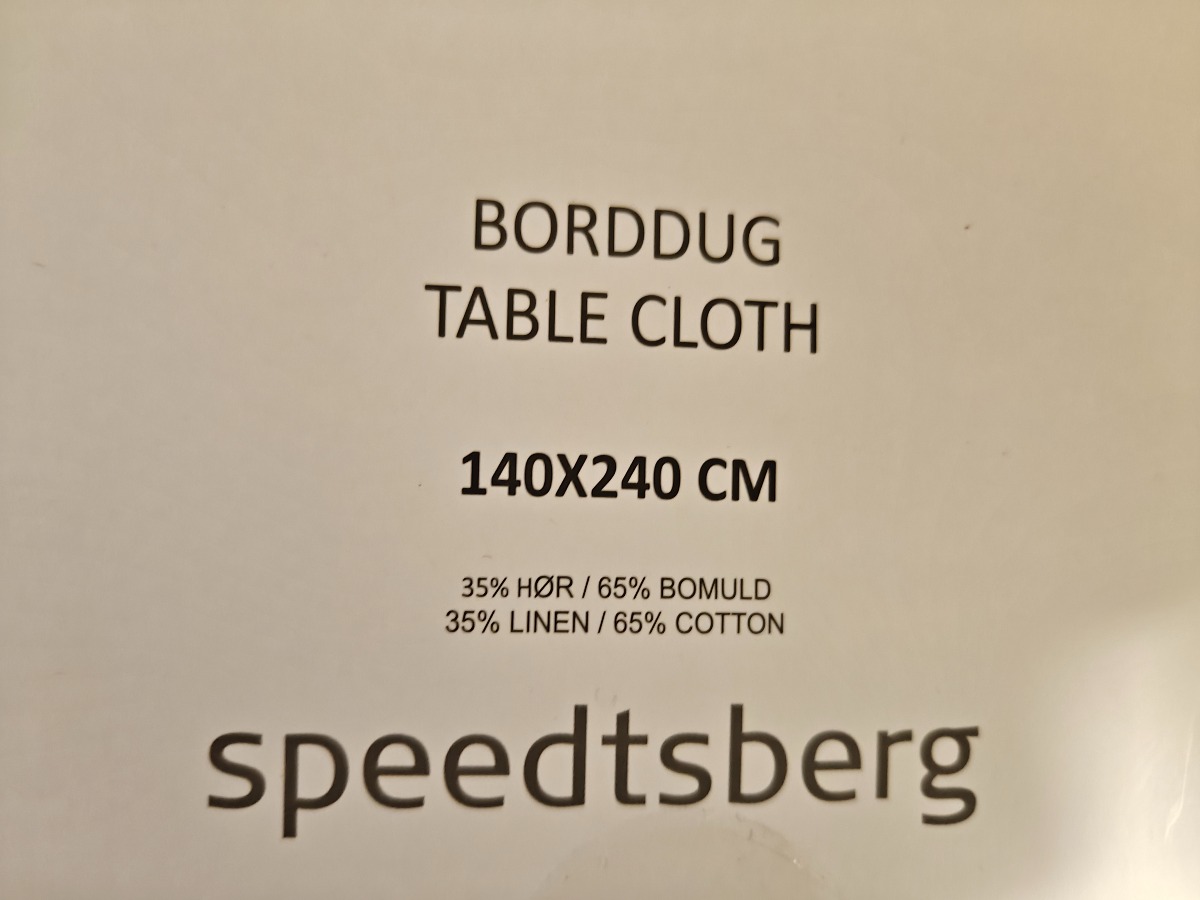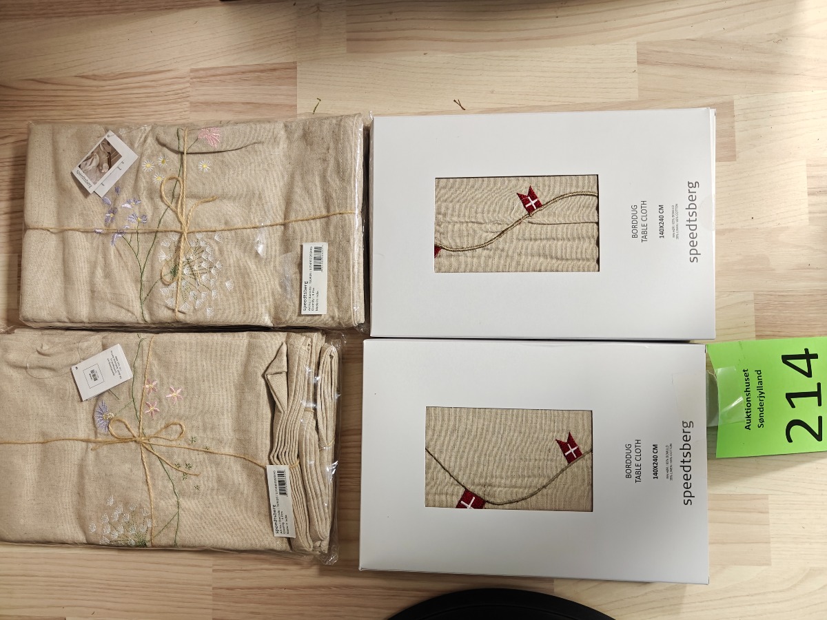 Speedtberg fødselsdags duge (2) og stofservietter(8). Dugene måler 140 x 240 cm. Varerne stammer fra lukket webshop. Alle varer er ubrugte og af rigtig god kvalitet.