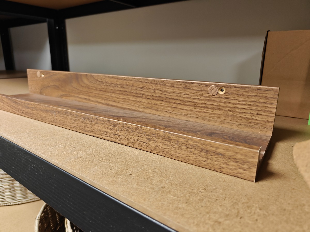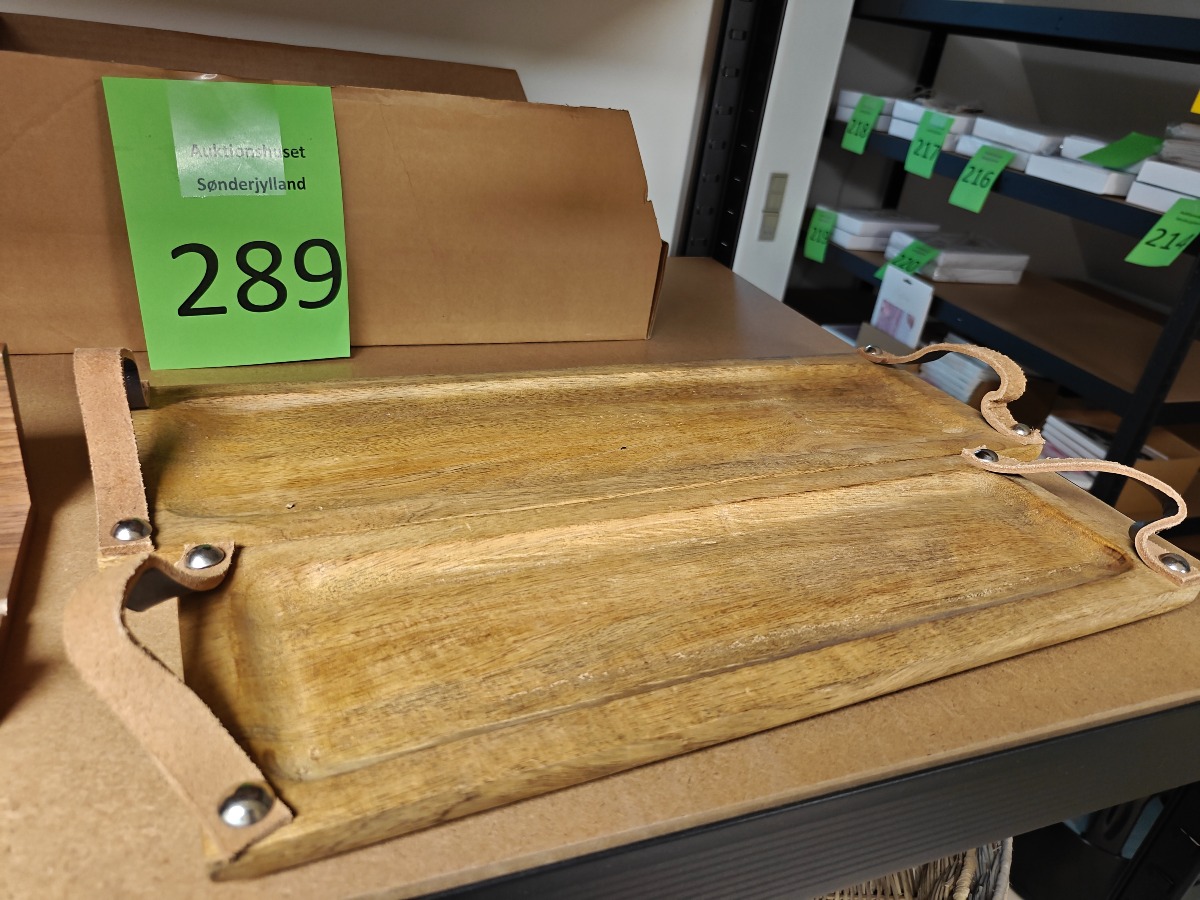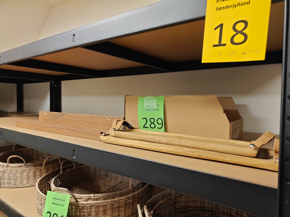 Træ bakker (2) og en træhylde. Bakkerne måler 38x12x1,5 og 46x15x1,5. Varerne stammer fra lukket webshop. Alle varer er ubrugte og af rigtig god kvalitet.