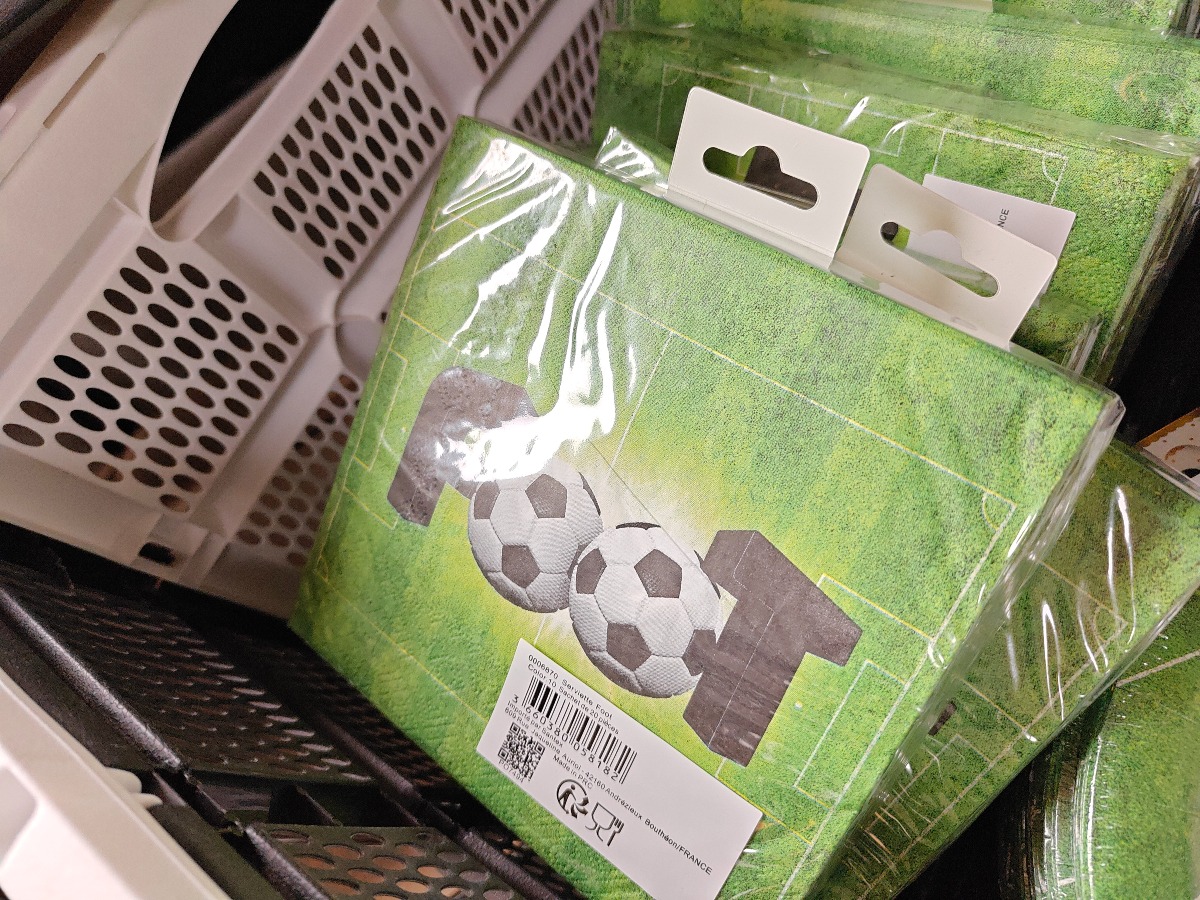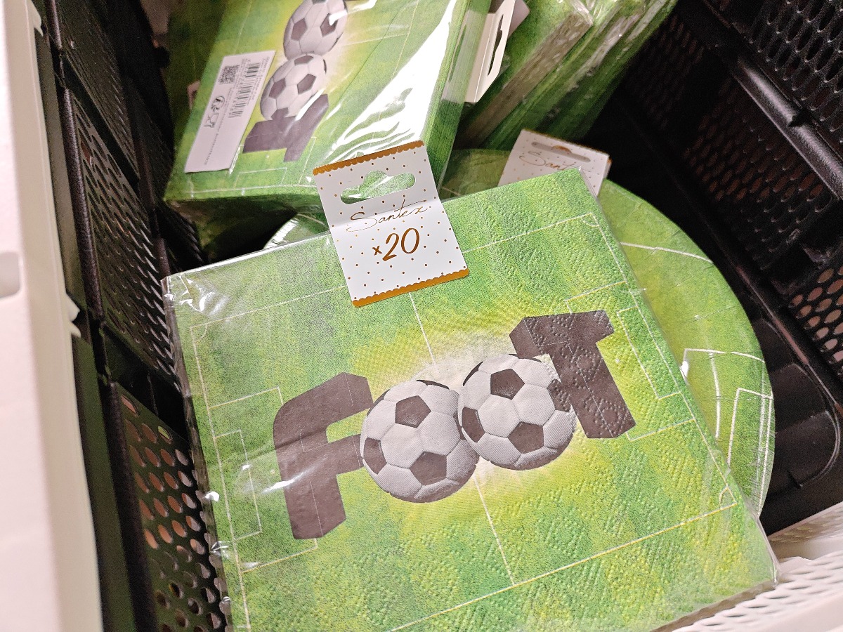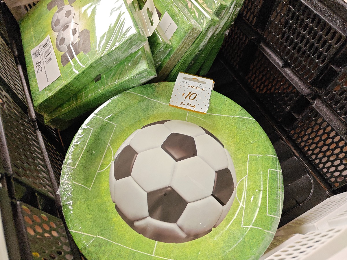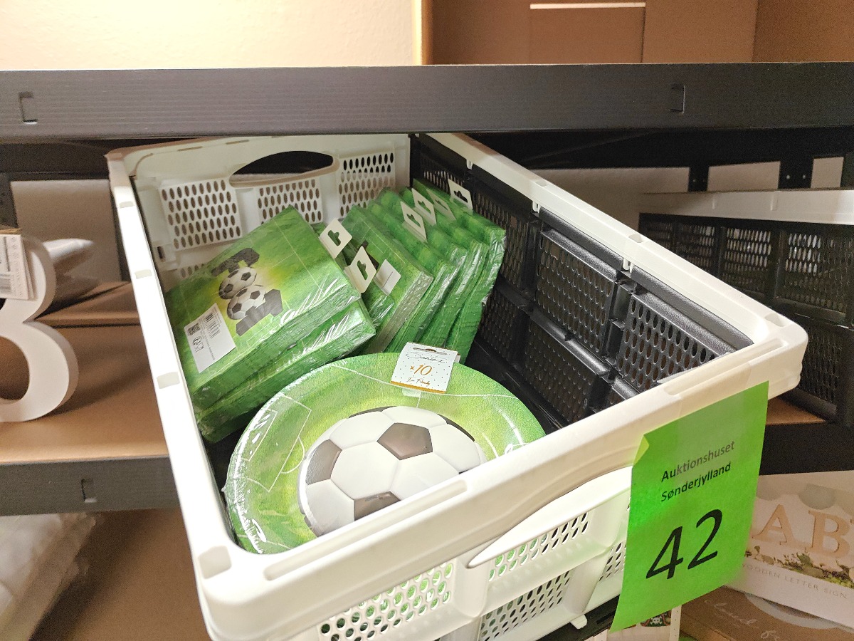 Engangsservice med fodbold tema. Stort antal tallerkner og servietter. Varerne stammer fra lukket webshop. Alle varer er ubrugte og af rigtig god kvalitet.