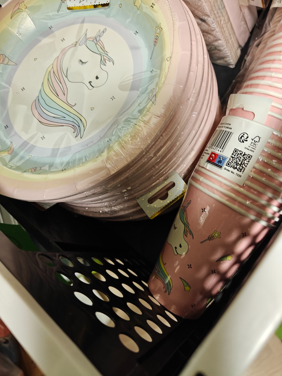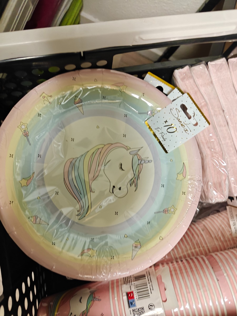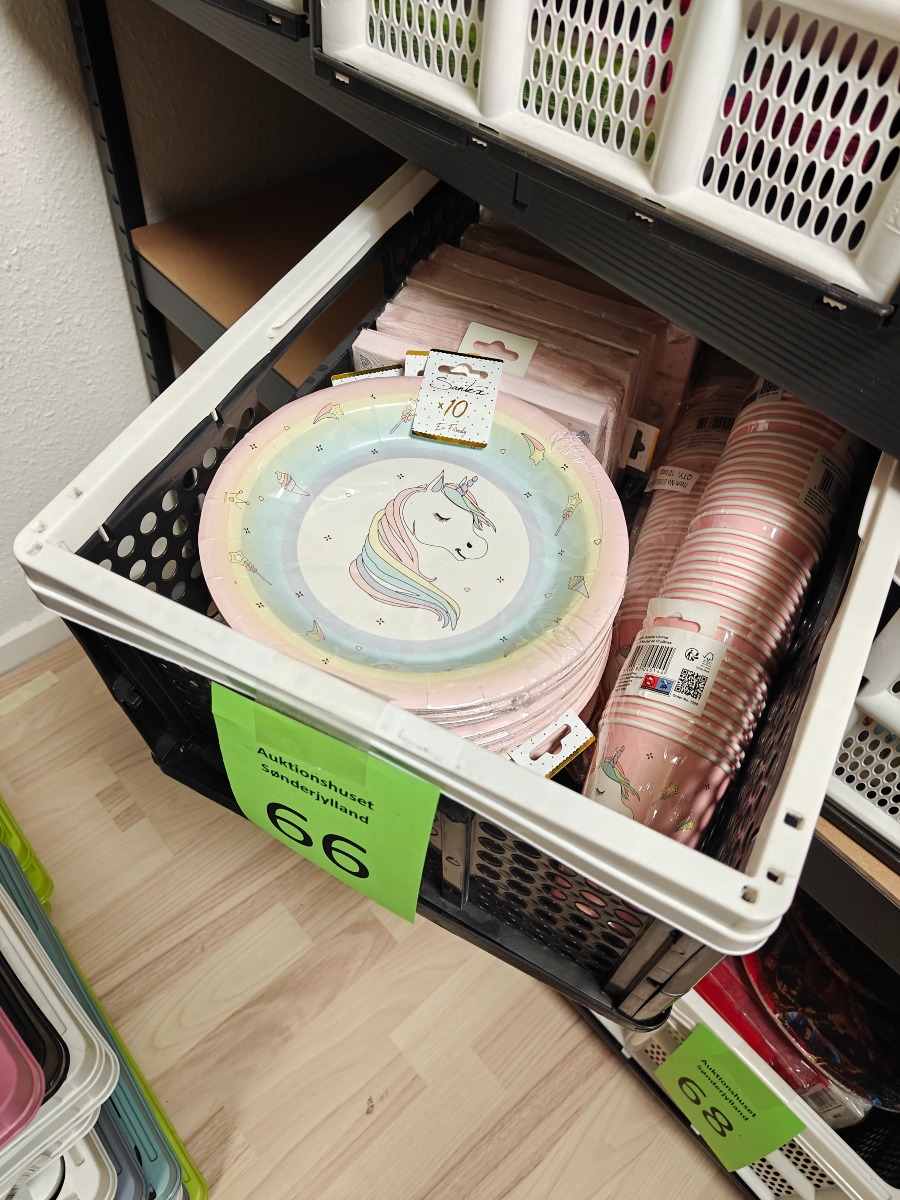 Festartikler med enhjørning tema. Tallerkner, krus og servietter. Varerne stammer fra lukket webshop. Alle varer er ubrugte og af rigtig god kvalitet.