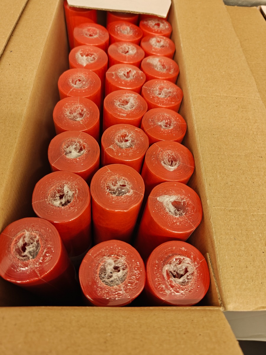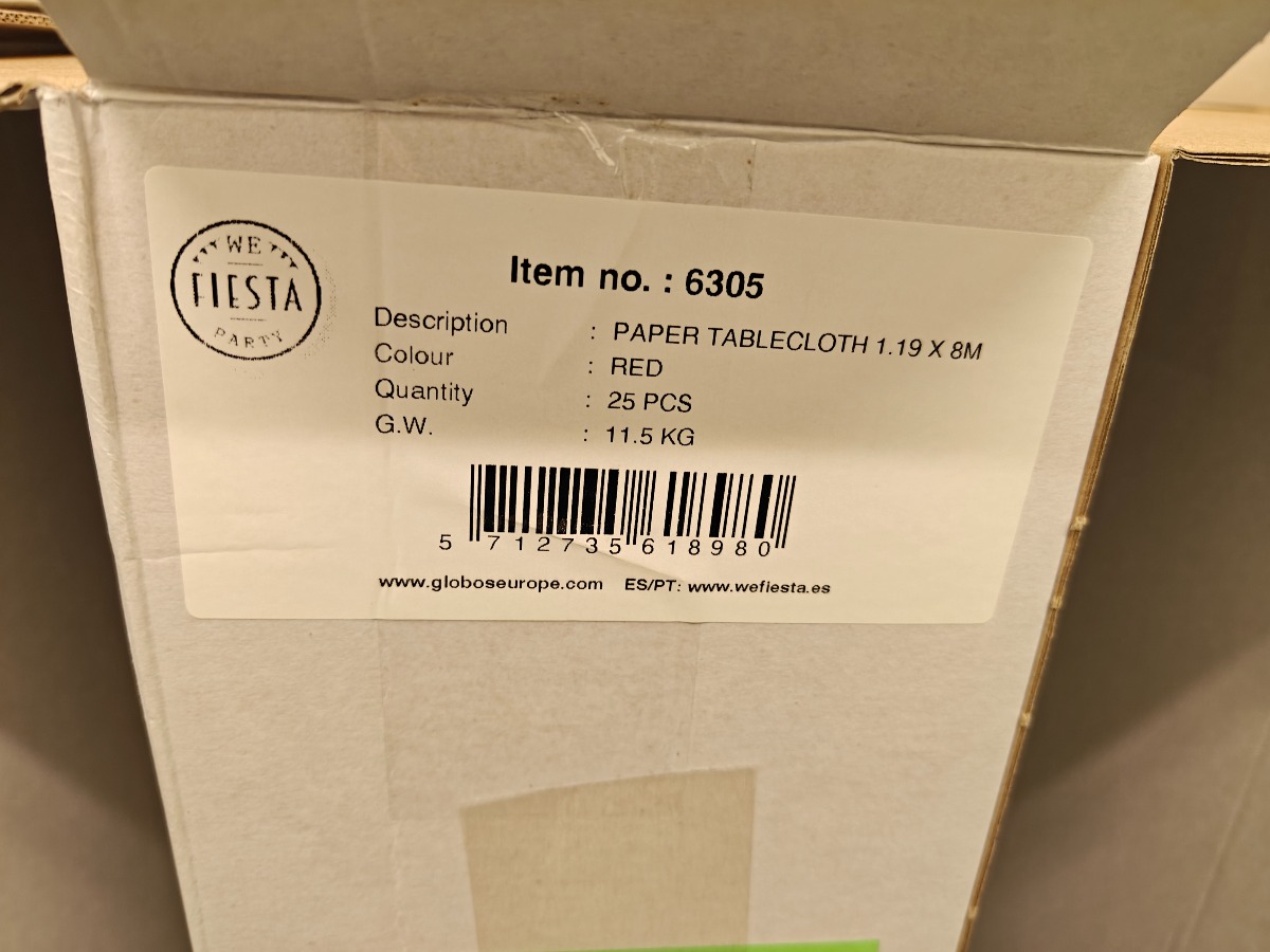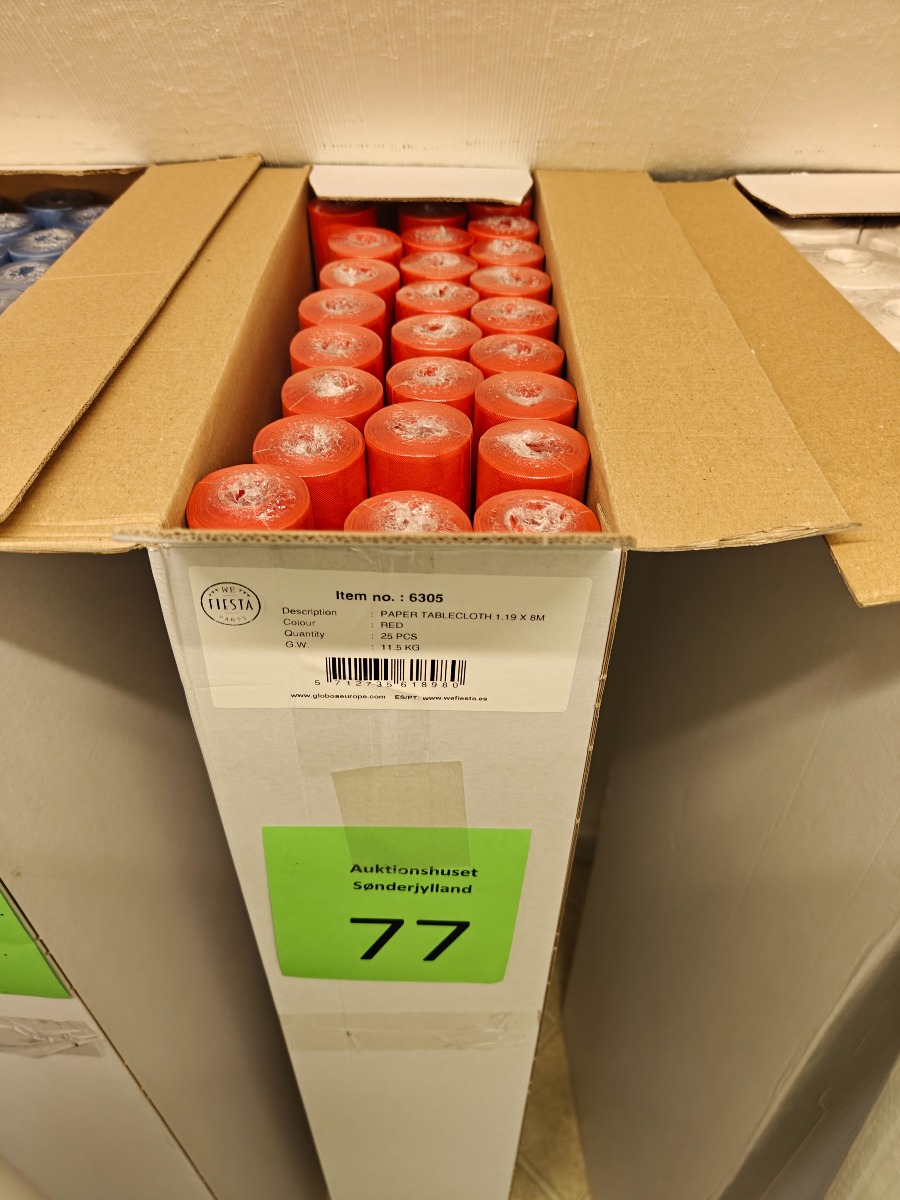 25 ruller papirdug, rød. 8m. pr. rulle. Bredde 119 cm. Varerne stammer fra lukket webshop. Alle varer er ubrugte og af rigtig god kvalitet.
