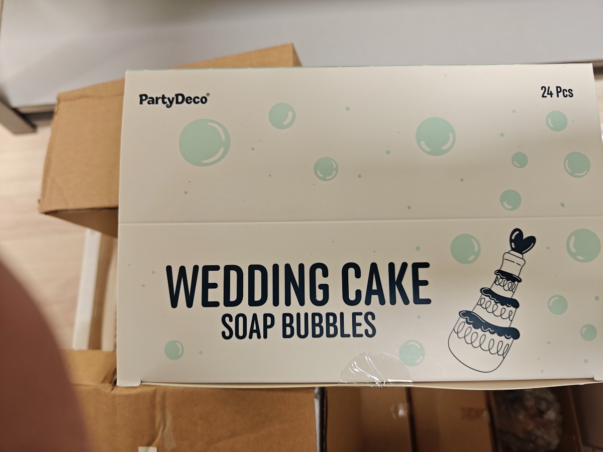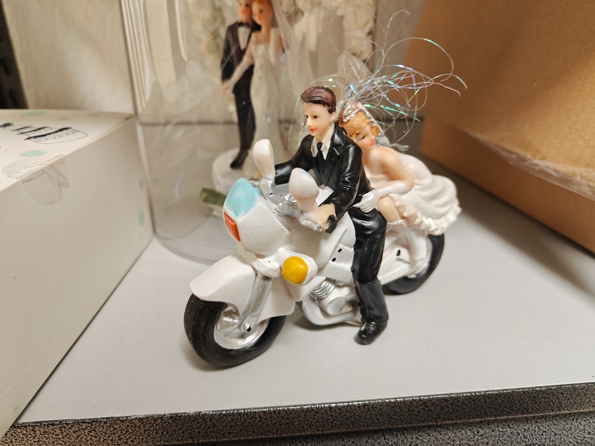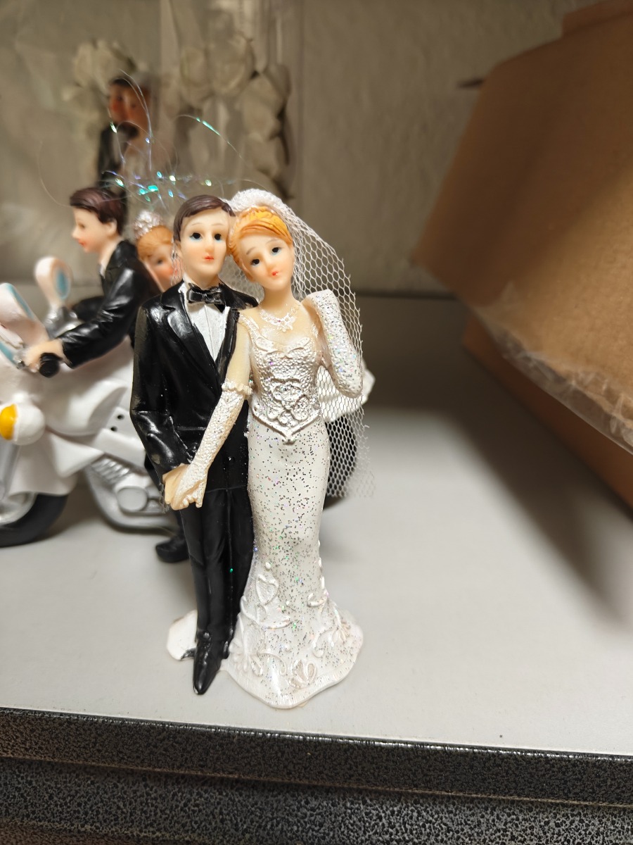 Topfigurer til bryllupskager. Ca. 10. Nogen ens. Samt æske med sæbebobler. Varerne stammer fra lukket webshop. Alle varer er ubrugte og af rigtig god kvalitet.