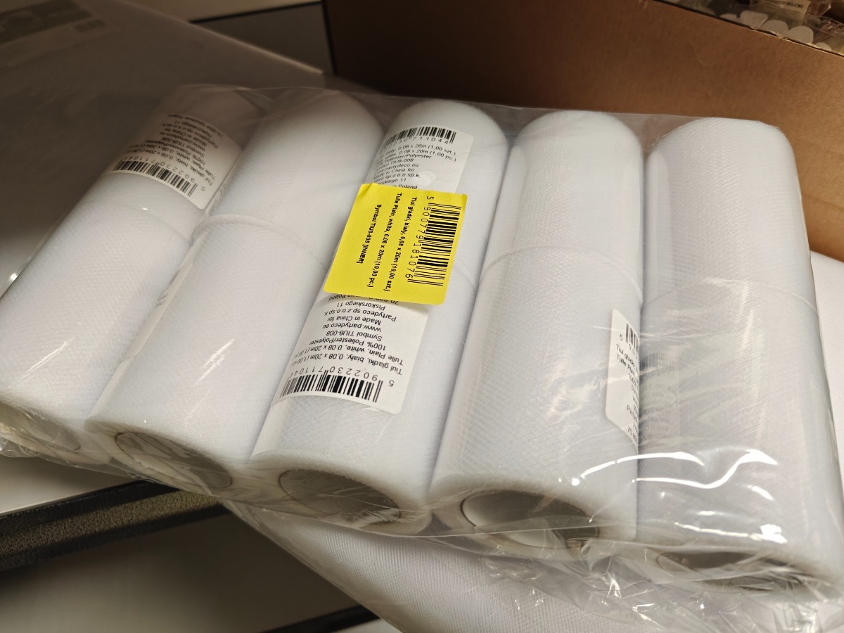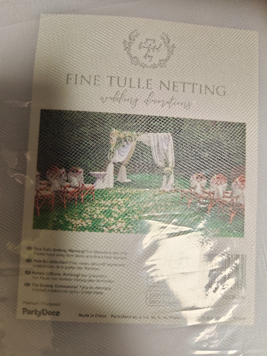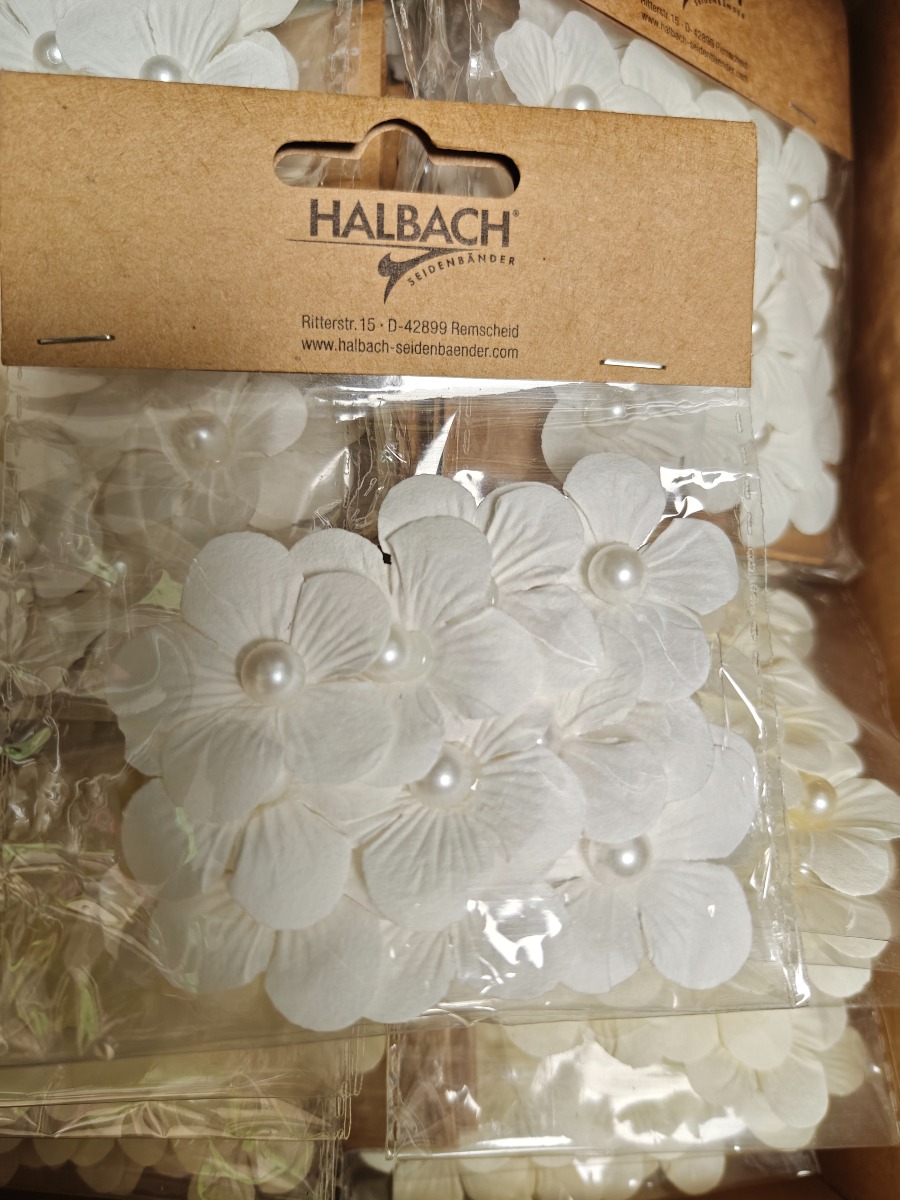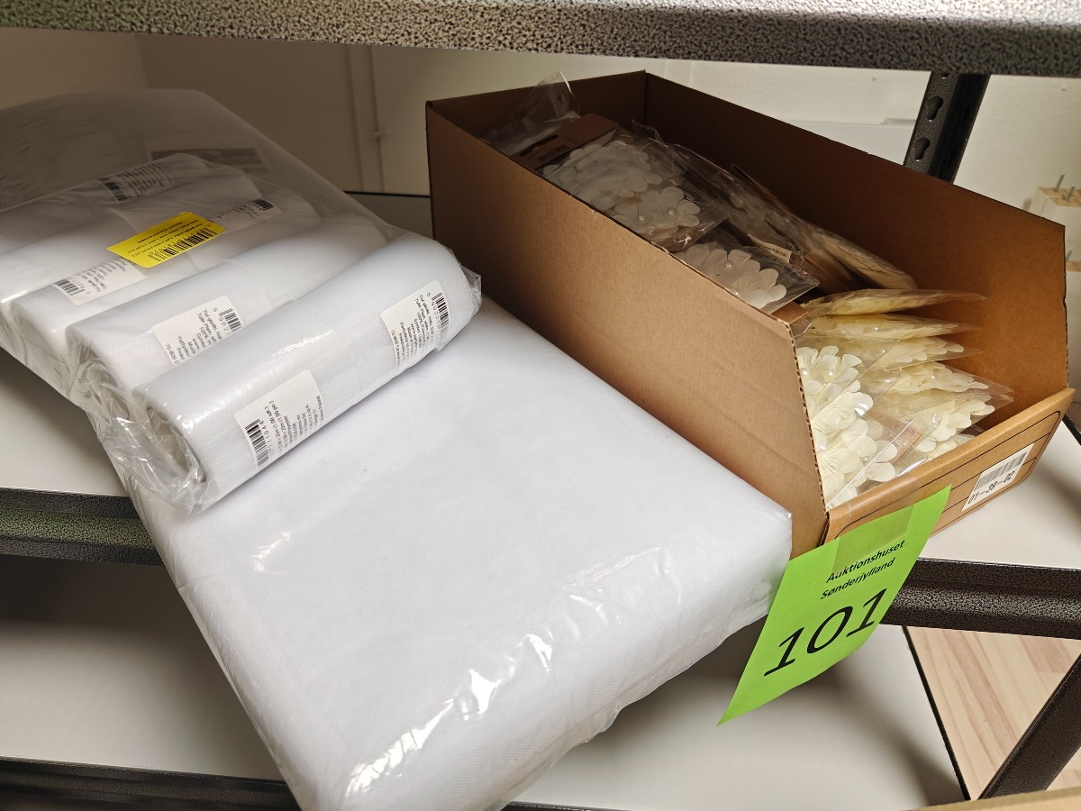 Tyld og kunstige blomster. Ruller med tyld og større stykke til drapering samt pakker med kunstige hvide blomster til dekoration. Varerne stammer fra lukket webshop. Alle varer er ubrugte og af rigtig god kvalitet.