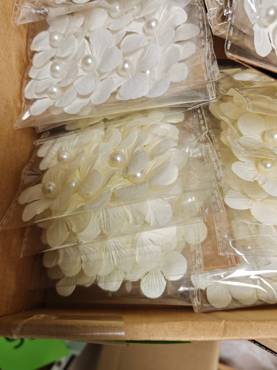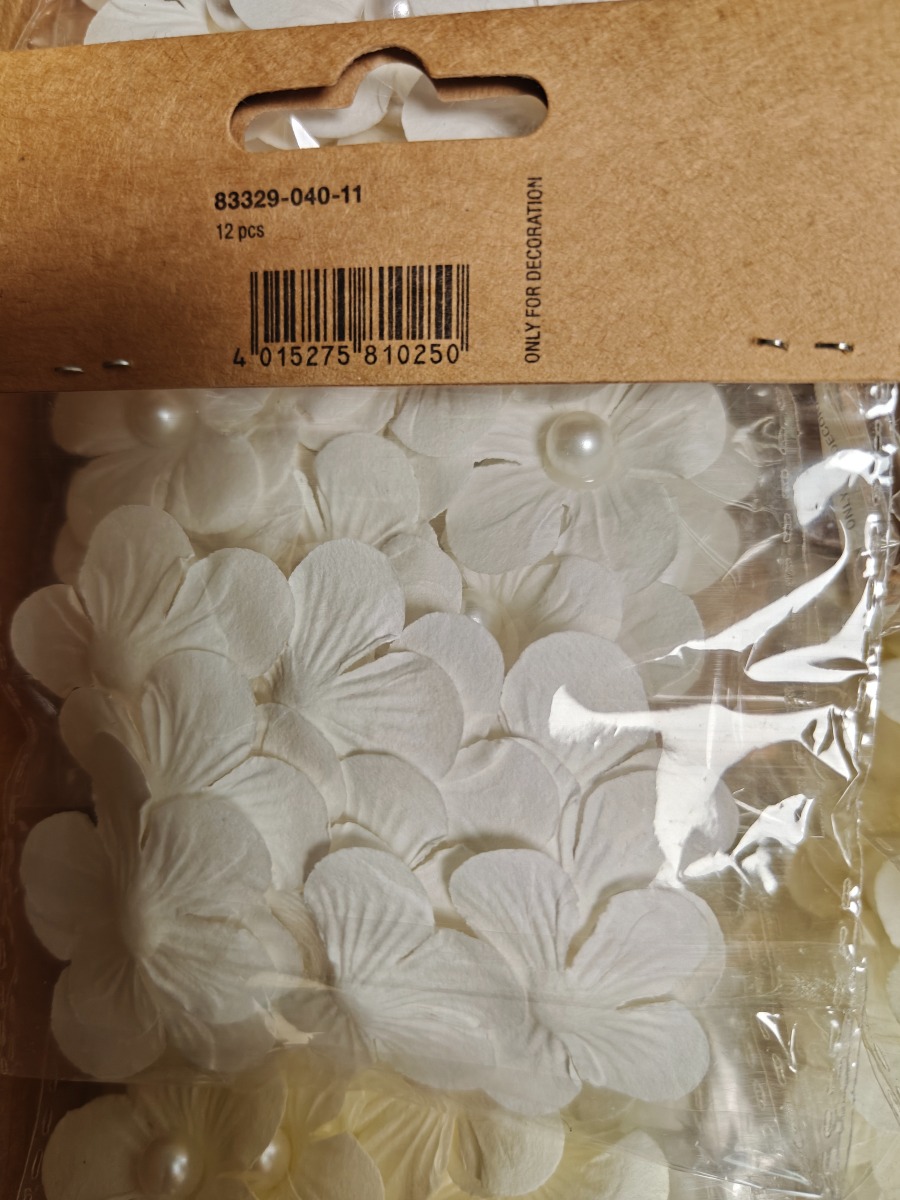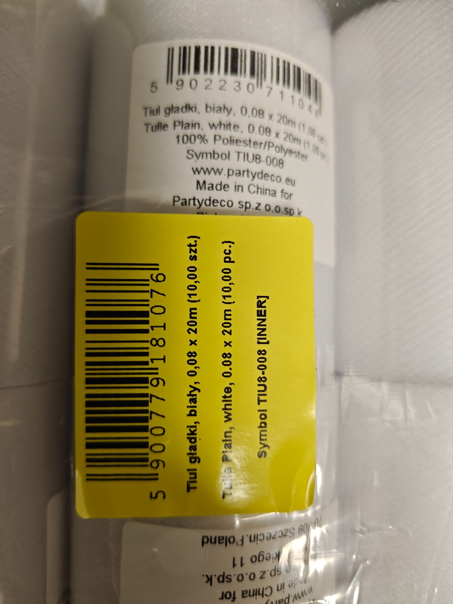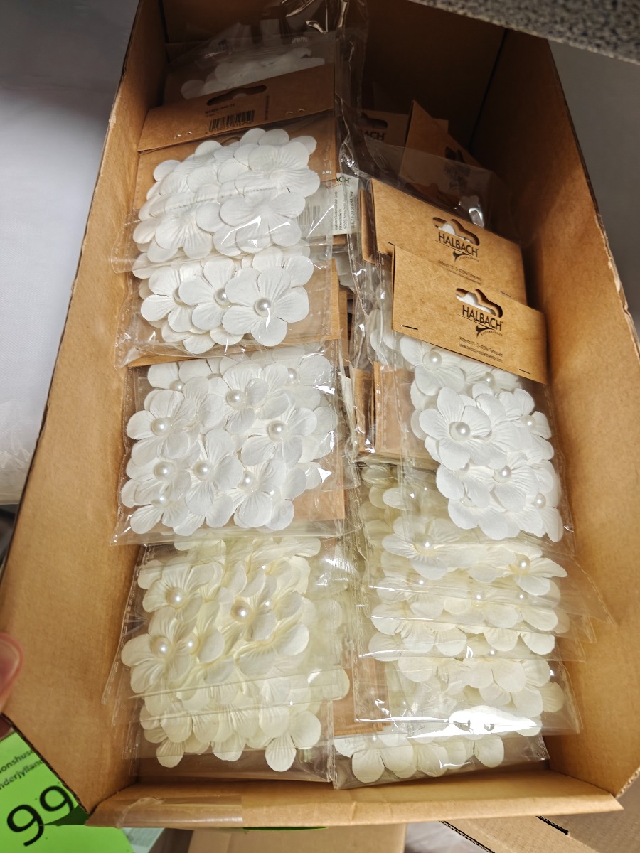 Tyld og kunstige blomster. Ruller med tyld og større stykke til drapering samt pakker med kunstige hvide blomster til dekoration. Varerne stammer fra lukket webshop. Alle varer er ubrugte og af rigtig god kvalitet.