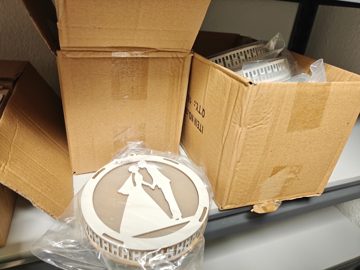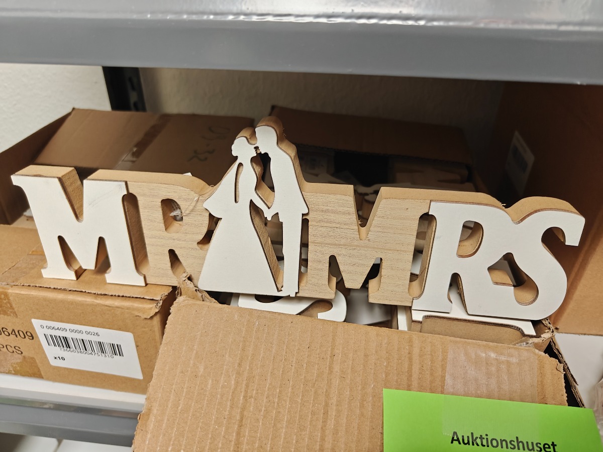 Dekorationer af træ til bryllupsfesten. Mr. & Mrs. skilte samt lamper med silhouet. Varerne stammer fra lukket webshop. Alle varer er ubrugte og af rigtig god kvalitet.