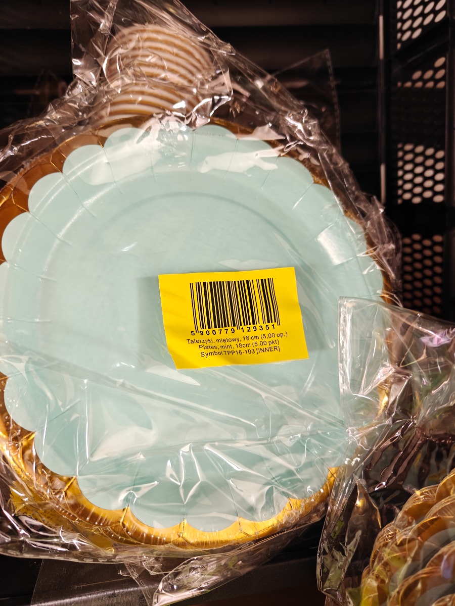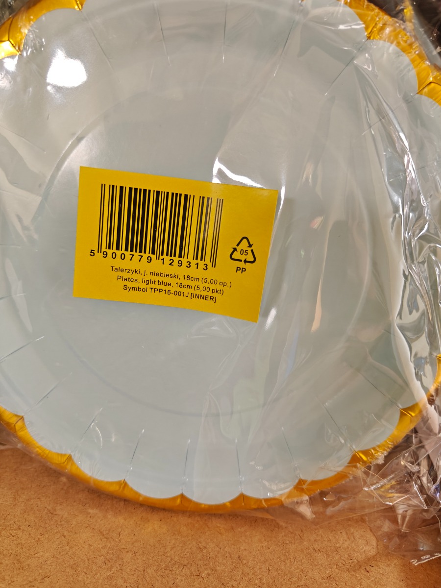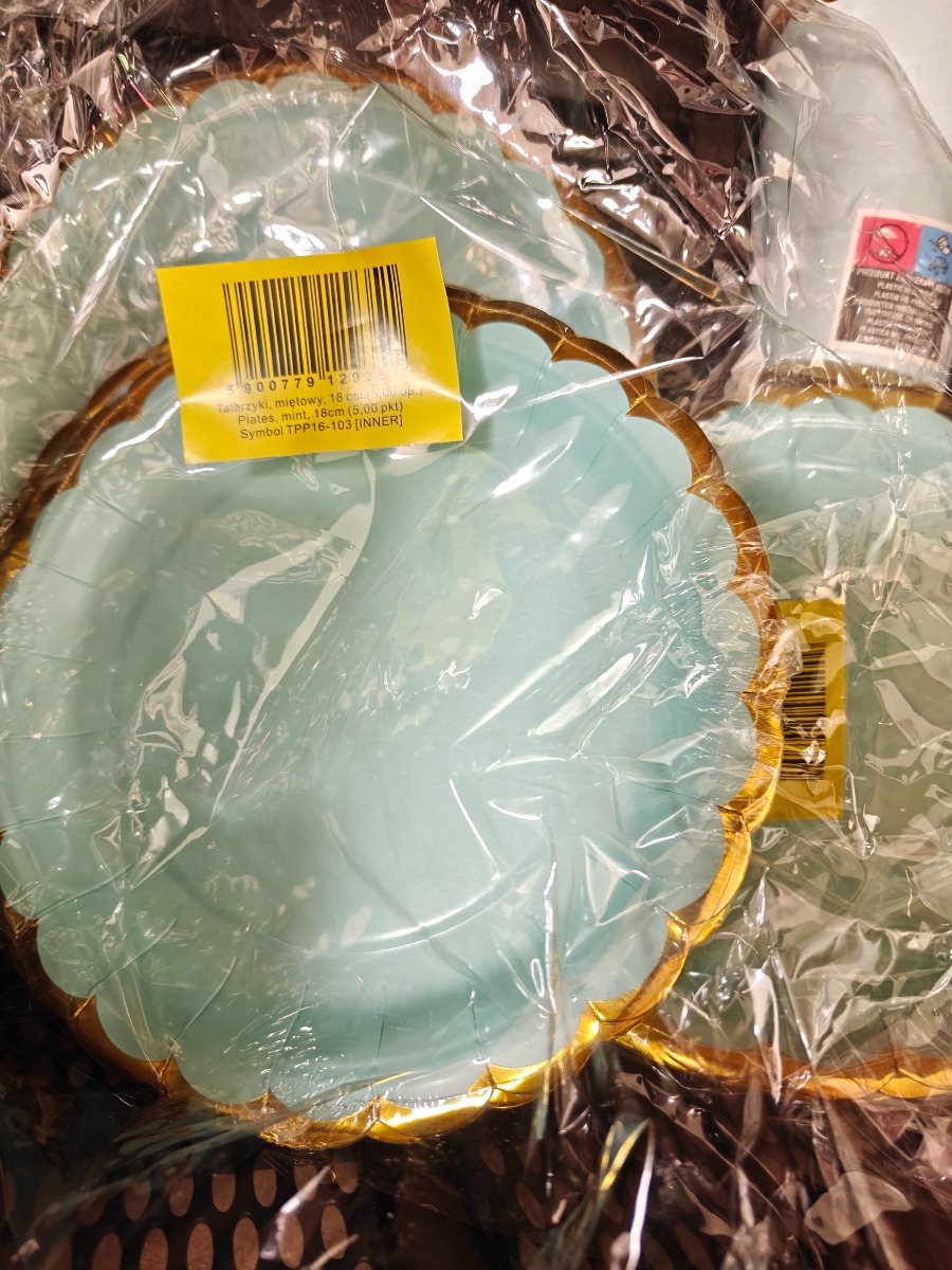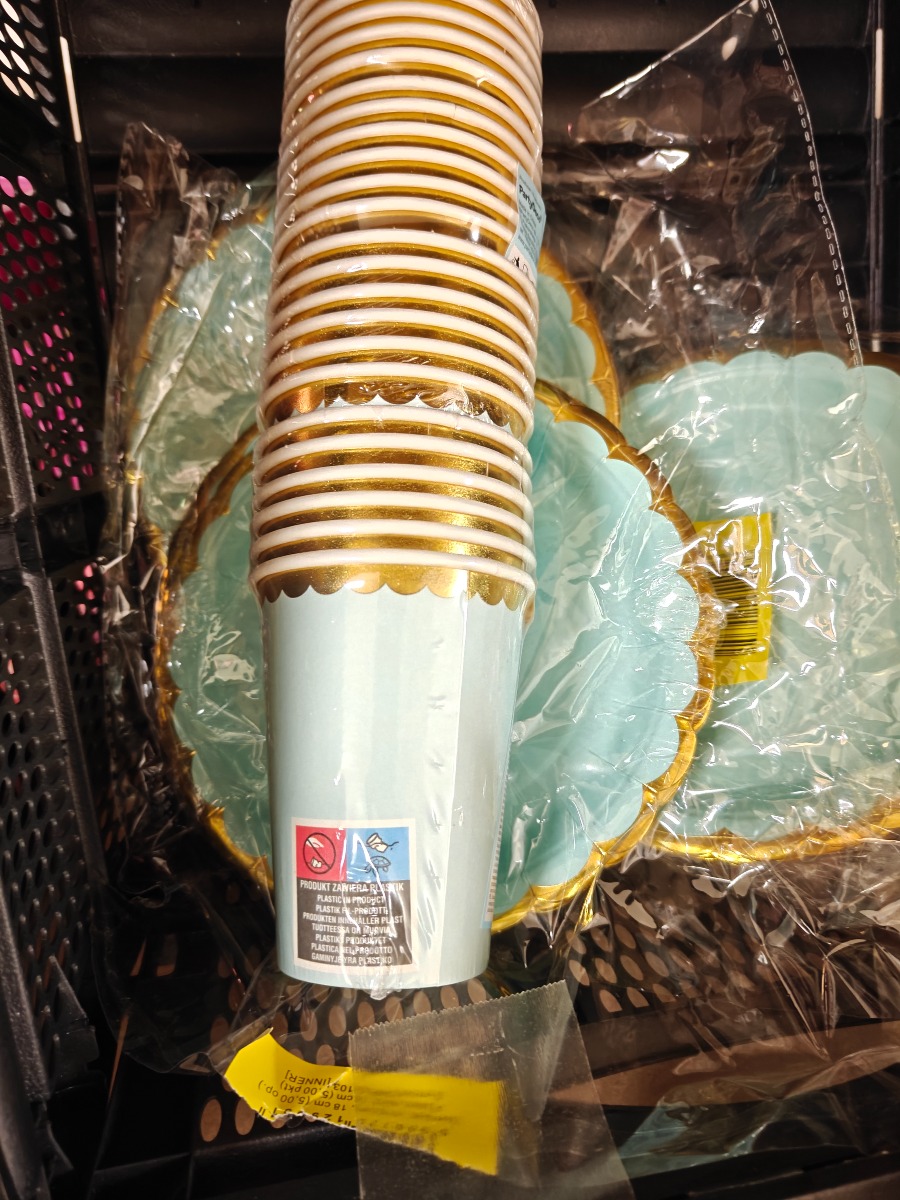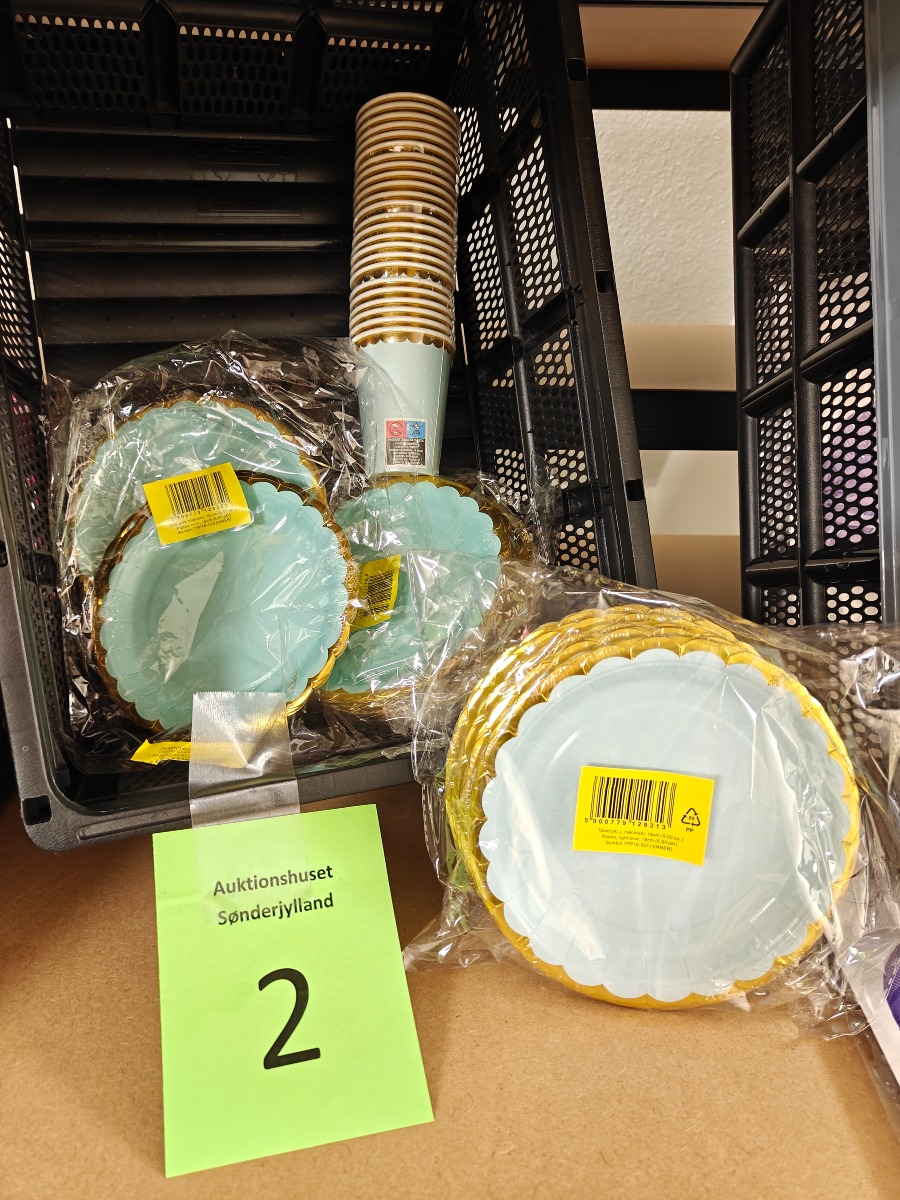 Tallerkner og krus af pap i lyseblå og hvid med guldkant. Varerne stammer fra lukket webshop. Alle varer er ubrugte og af rigtig god kvalitet.