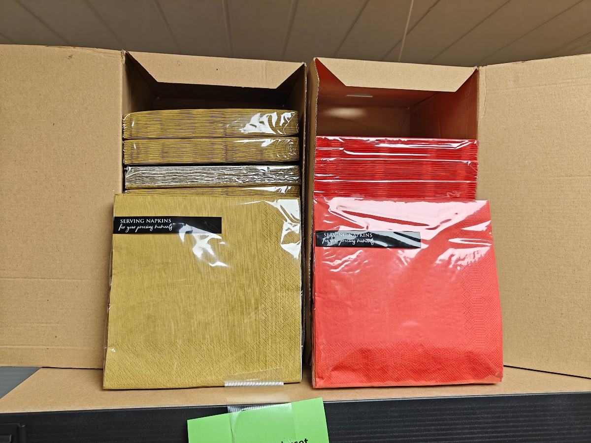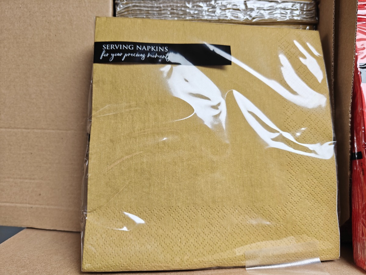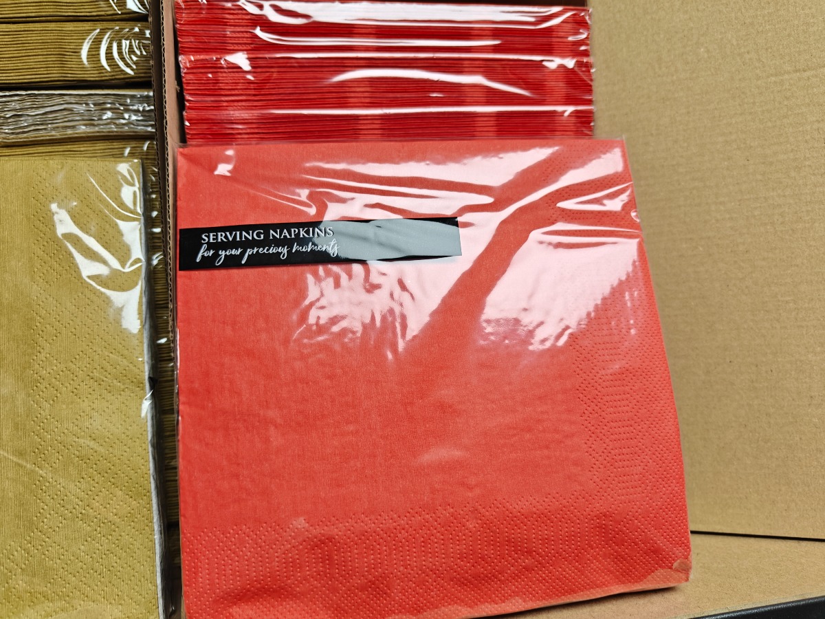 Servietter i rød og guld. 33 x 33 cm. mimimum 10 pk. af hver. Varerne stammer fra lukket webshop. Alle varer er ubrugte og af rigtig god kvalitet.
