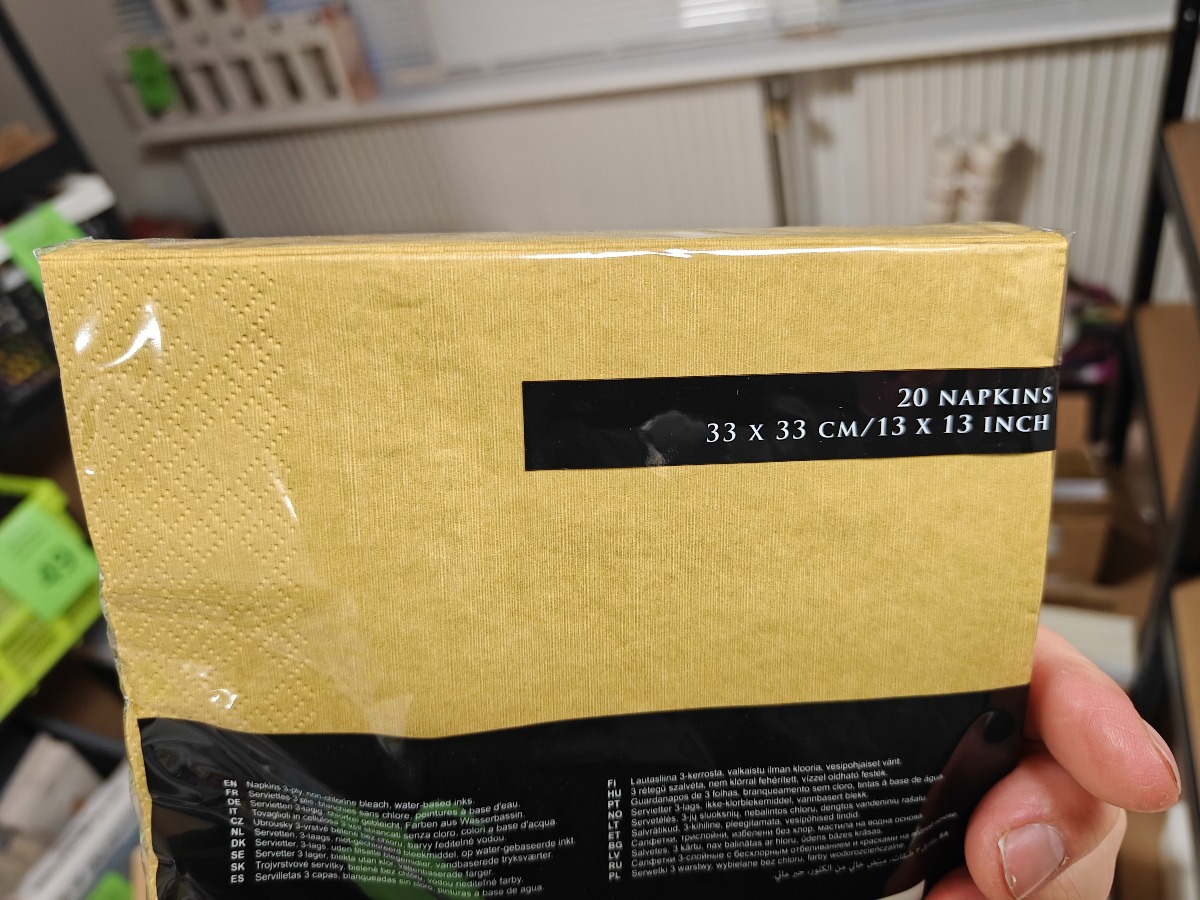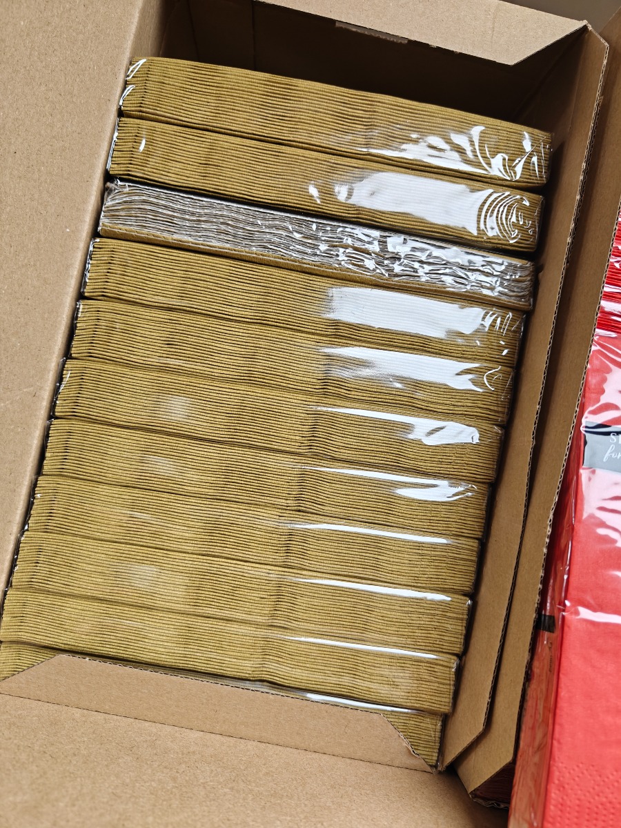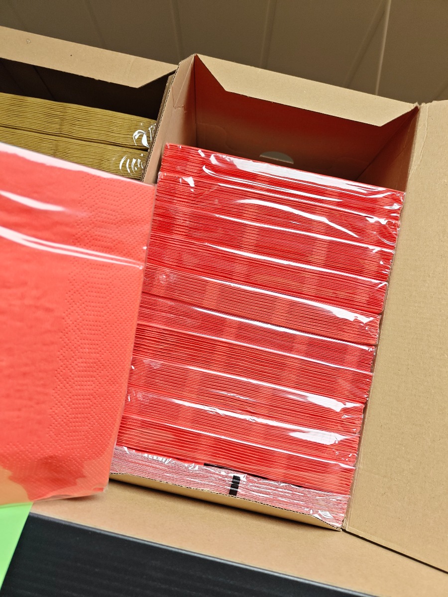 Servietter i rød og guld. 33 x 33 cm. mimimum 10 pk. af hver. Varerne stammer fra lukket webshop. Alle varer er ubrugte og af rigtig god kvalitet.