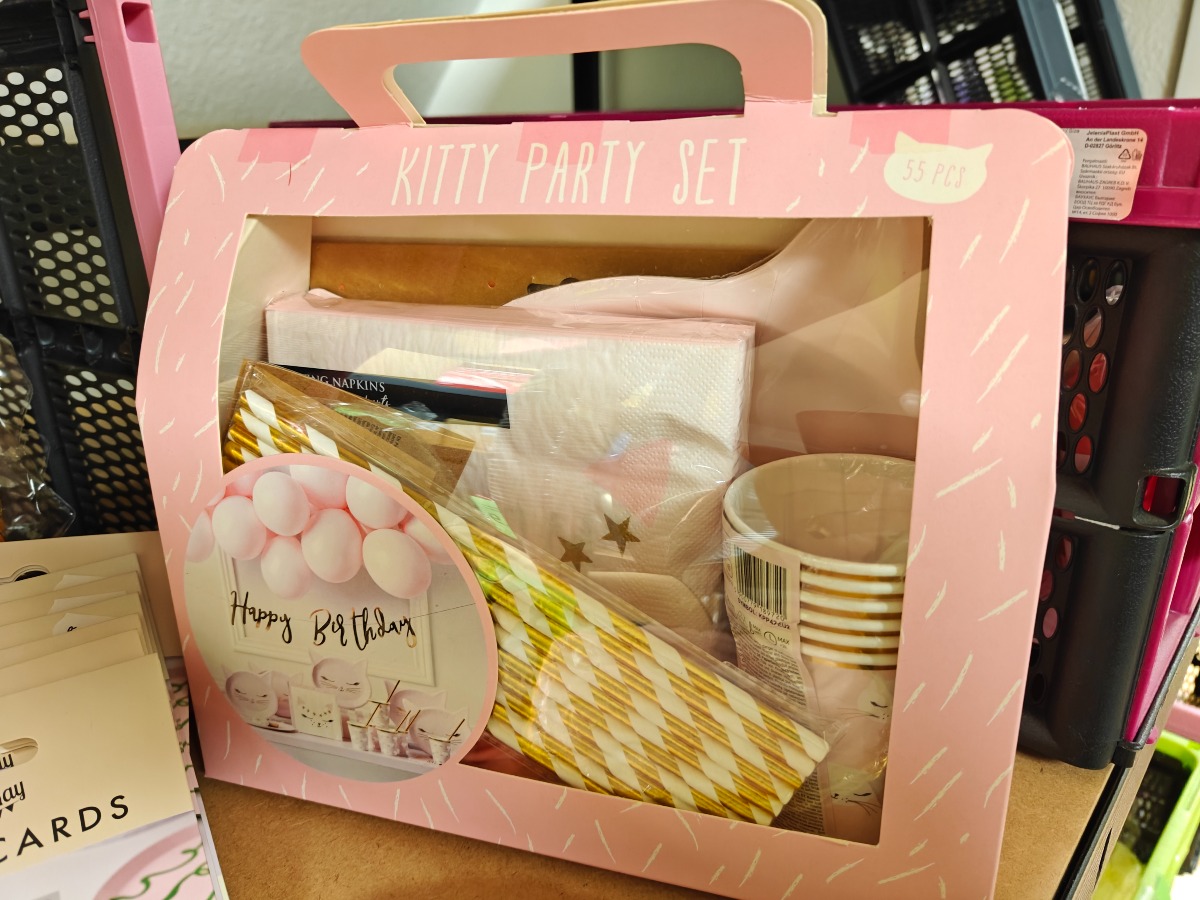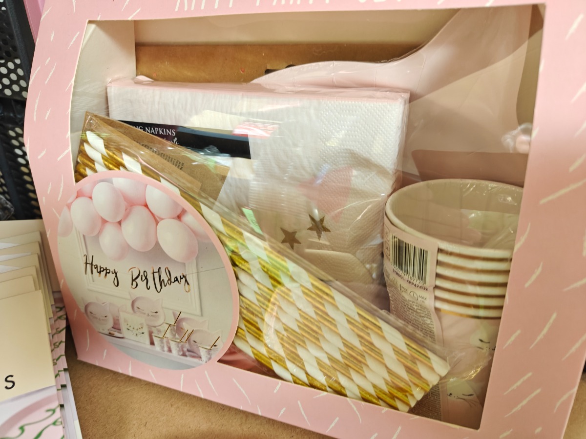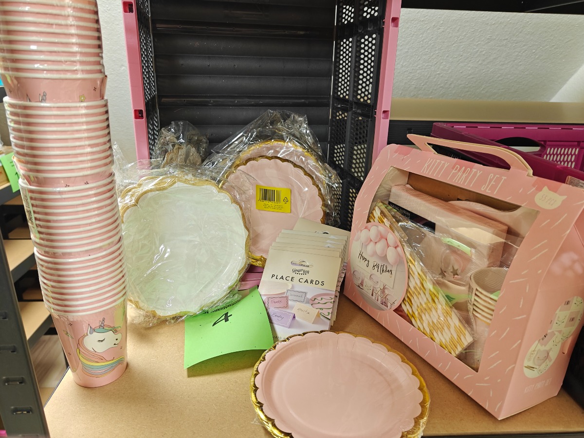 Artikler til fødselsdag i pink og hvid. Krus, tallerkner, sugerør m.m. Varerne stammer fra lukket webshop. Alle varer er ubrugte og af rigtig god kvalitet.
